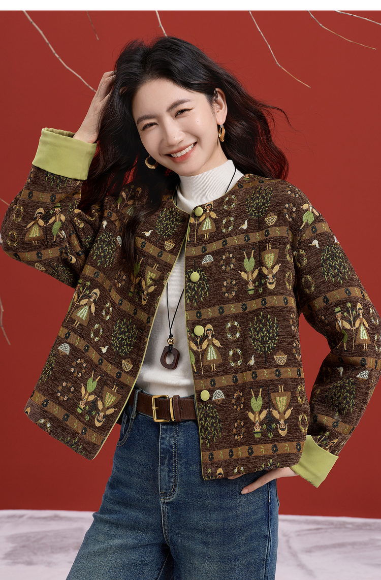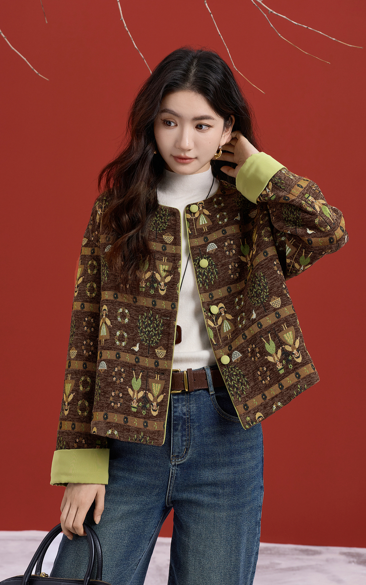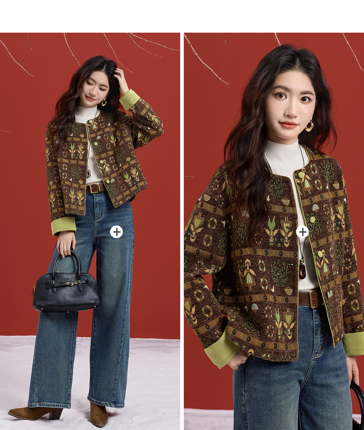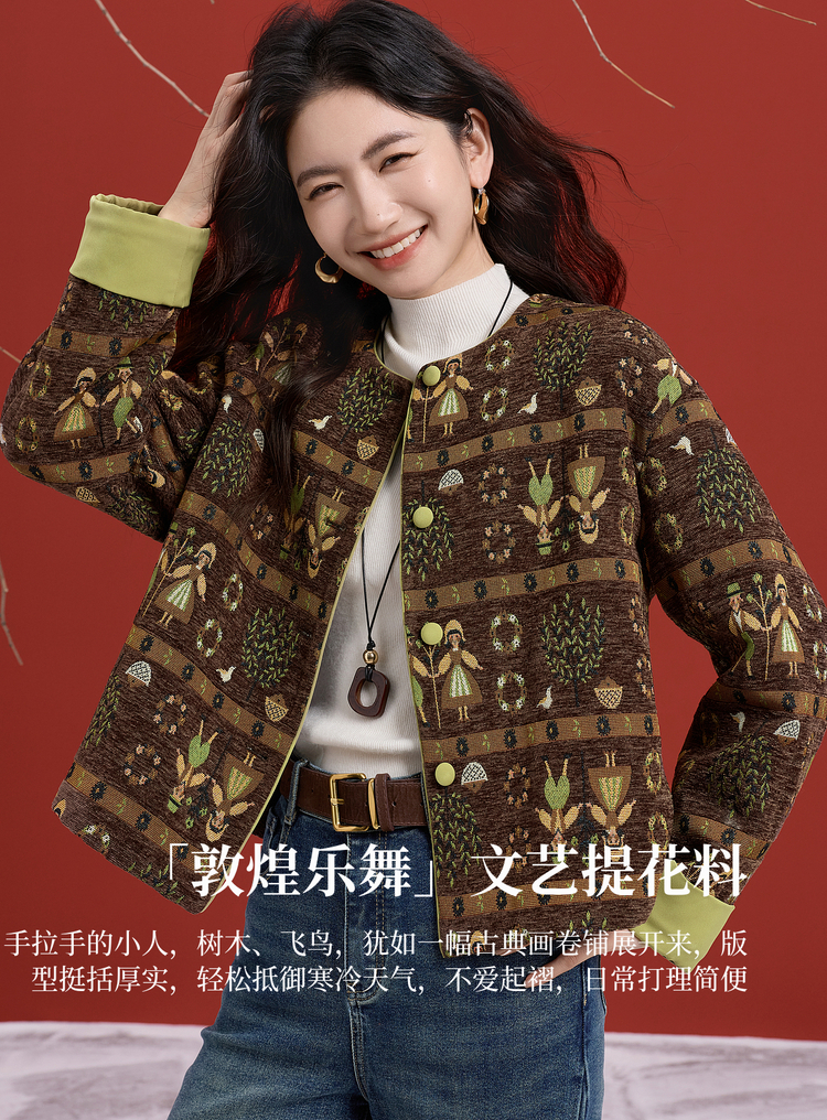 【12/10新品6折】熙世界「敦煌乐舞」复古艺术风提花短外套女秋冬厚款圆领开衫上衣