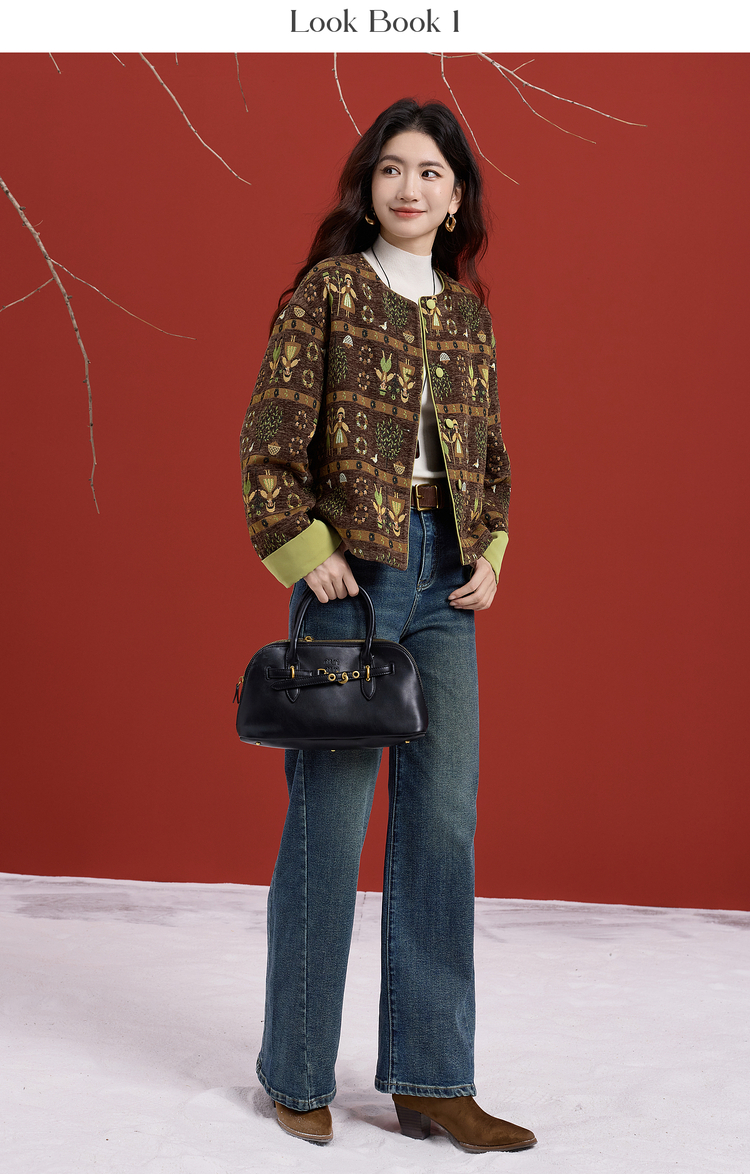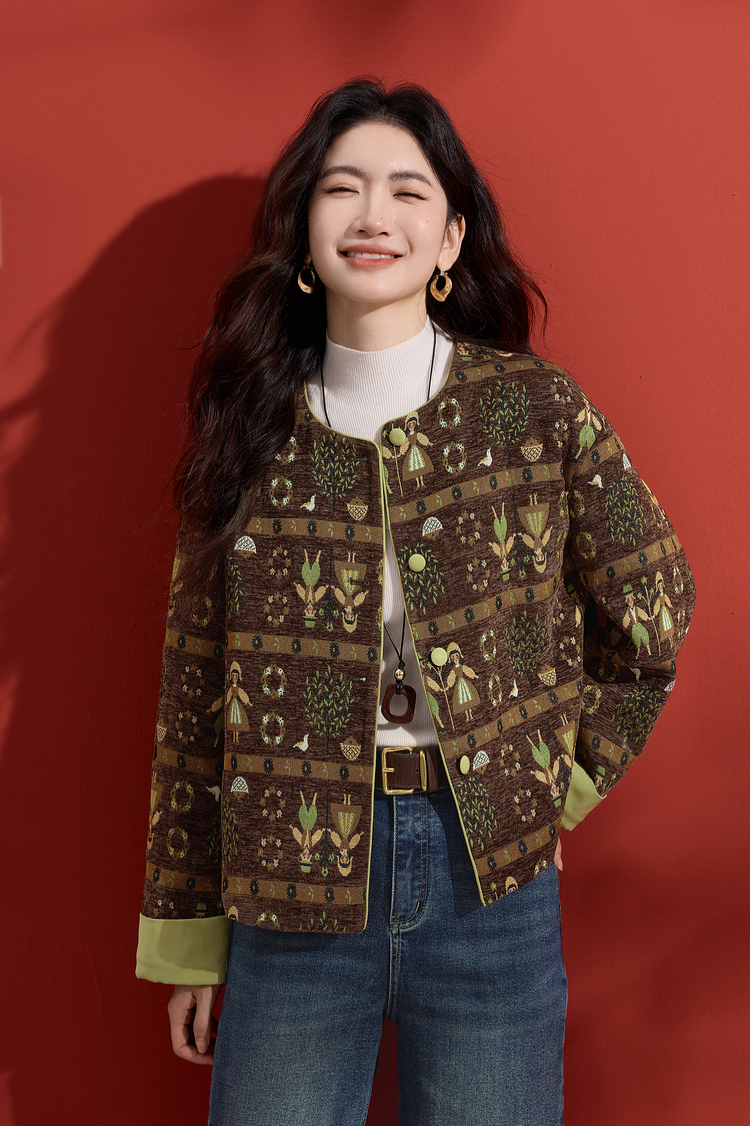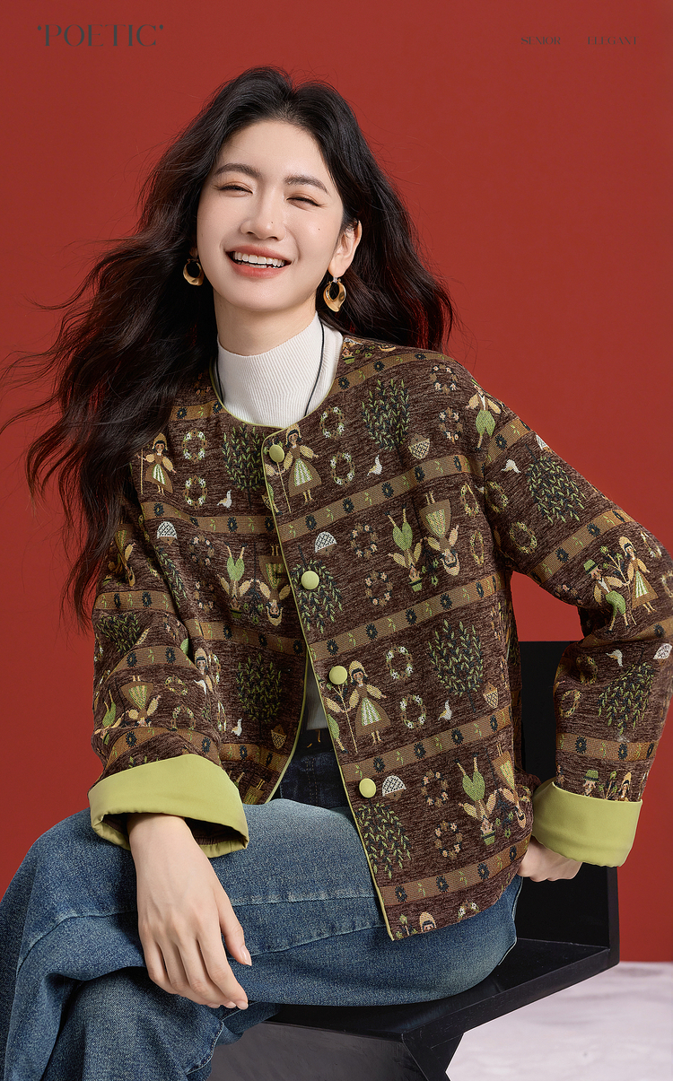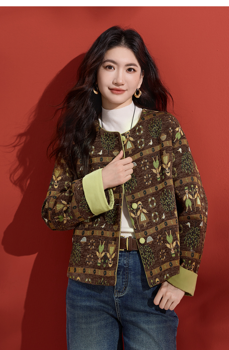 【12/10新品6折】熙世界「敦煌乐舞」复古艺术风提花短外套女秋冬厚款圆领开衫上衣