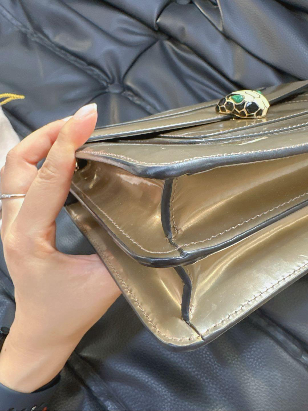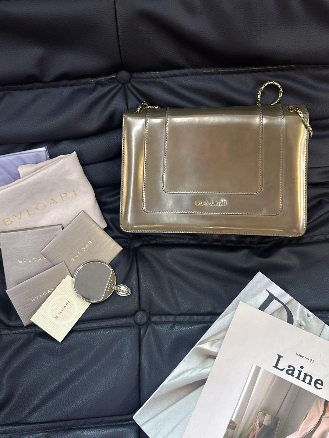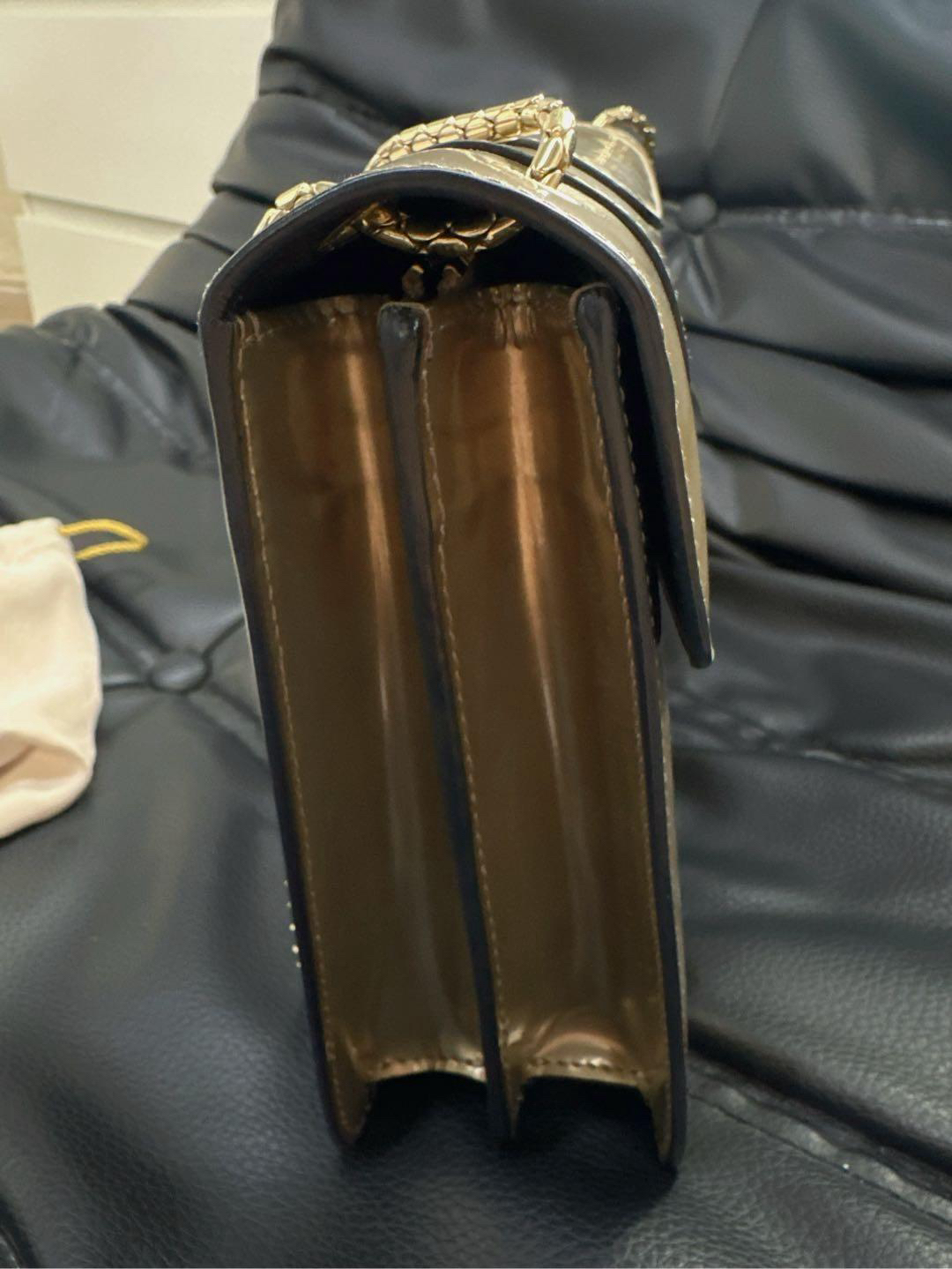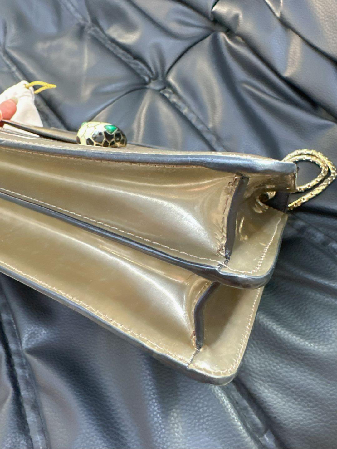【商品详情】正品二手 宝格丽 中号 香槟金 漆皮 蛇头包 🫖 95新 27x17 配件:保卡、皮革护理湿巾、说明书、包包雨衣、镜子。 包面与后包身有轻微染色使用感 蛇年必备单品