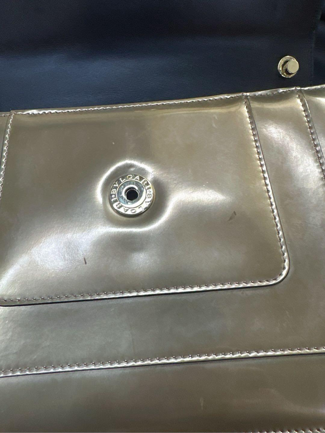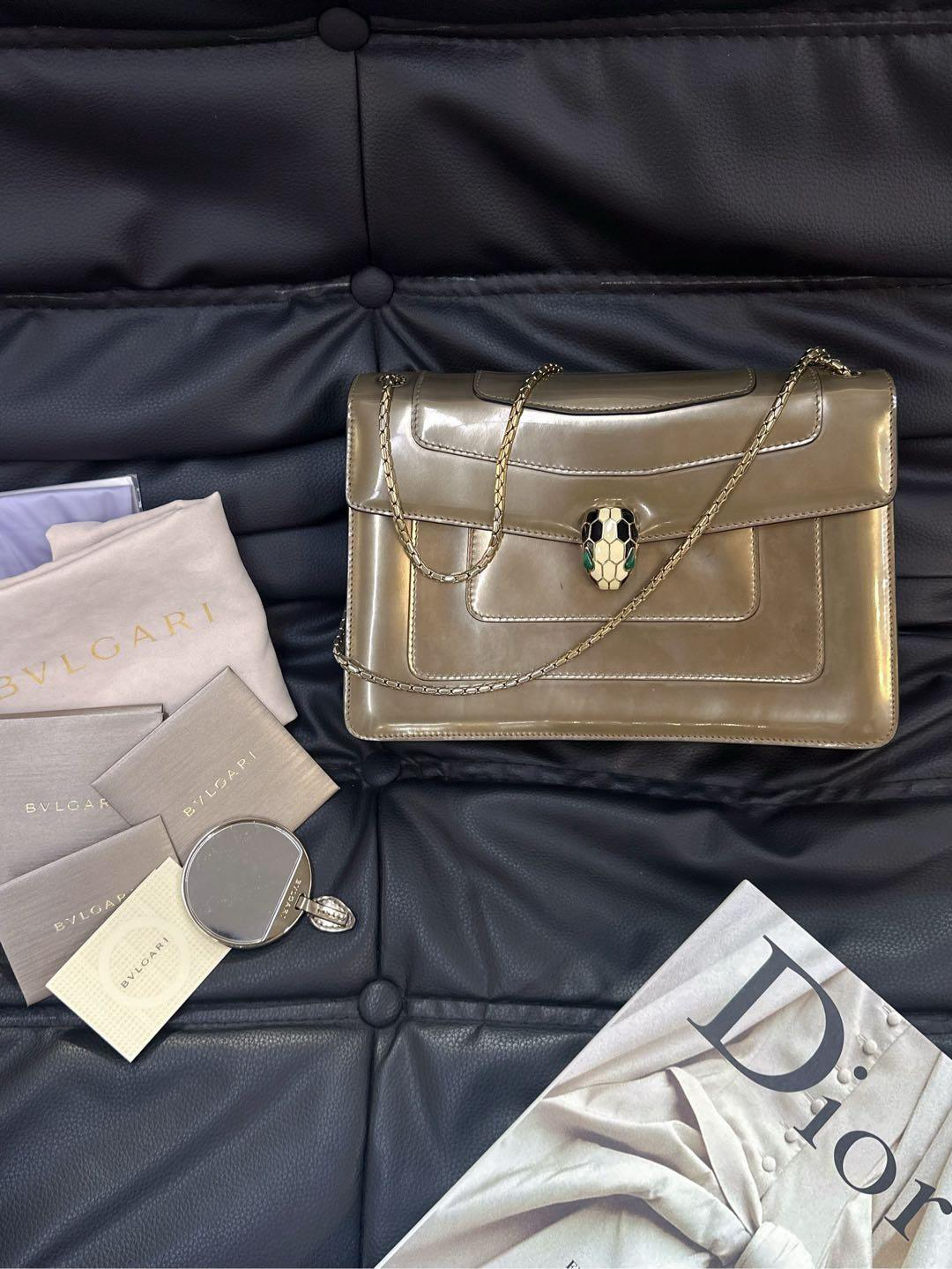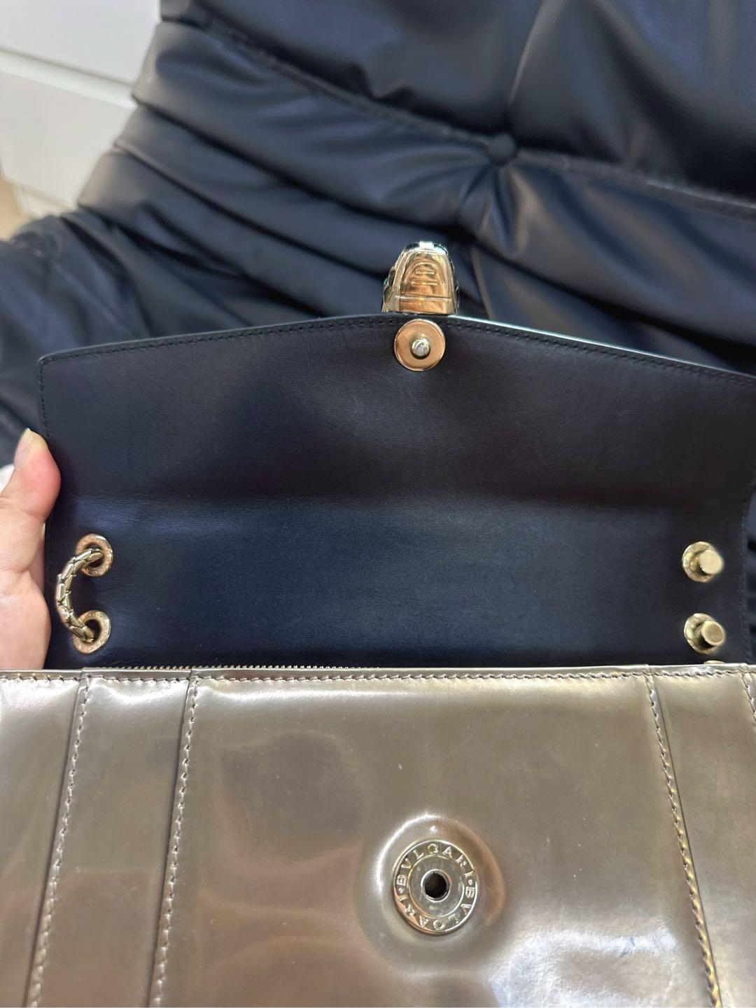 【商品详情】正品二手 宝格丽 中号 香槟金 漆皮 蛇头包 🫖 95新 27x17 配件:保卡、皮革护理湿巾、说明书、包包雨衣、镜子。 包面与后包身有轻微染色使用感 蛇年必备单品