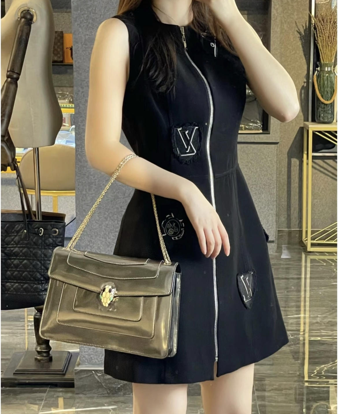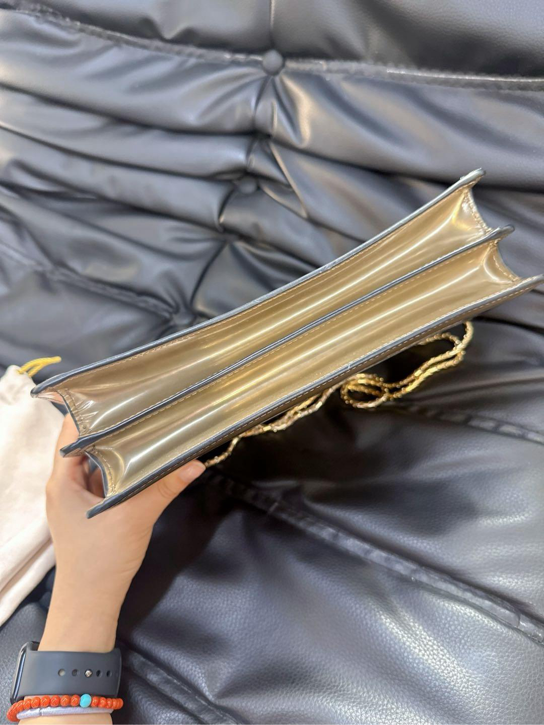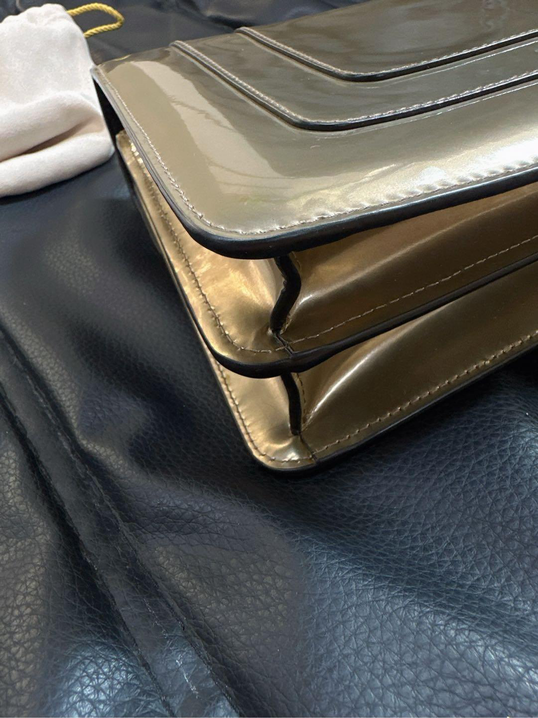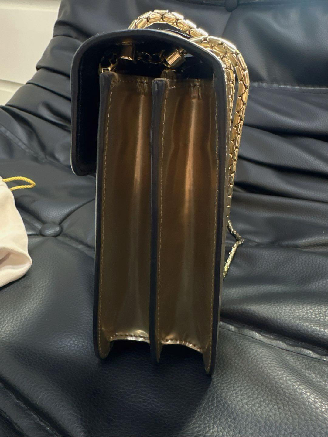 【商品详情】正品二手 宝格丽 中号 香槟金 漆皮 蛇头包 🫖 95新 27x17 配件:保卡、皮革护理湿巾、说明书、包包雨衣、镜子。 包面与后包身有轻微染色使用感 蛇年必备单品
