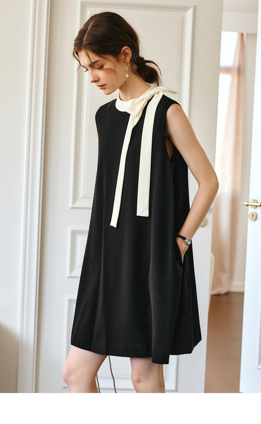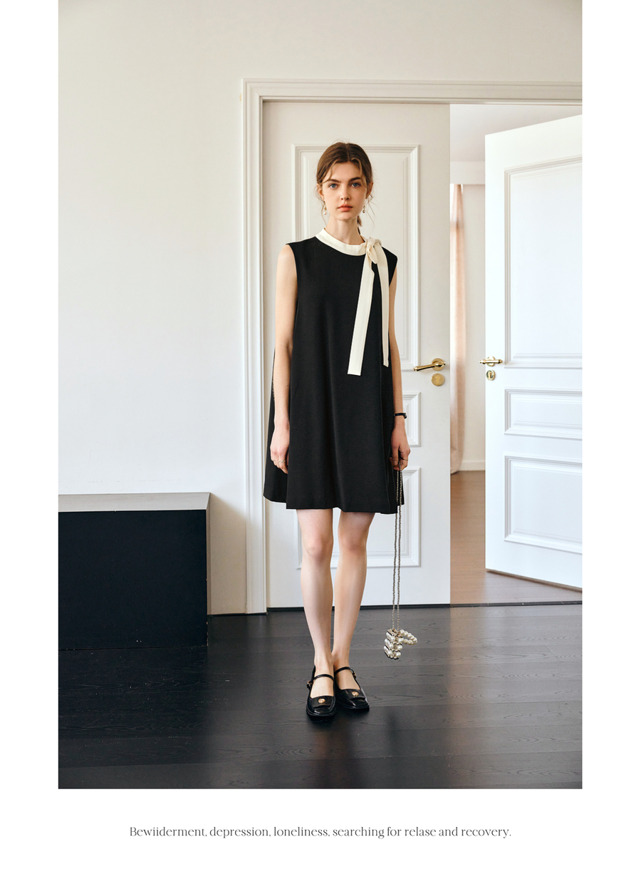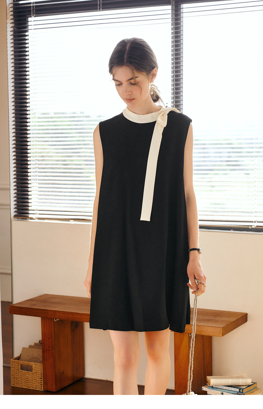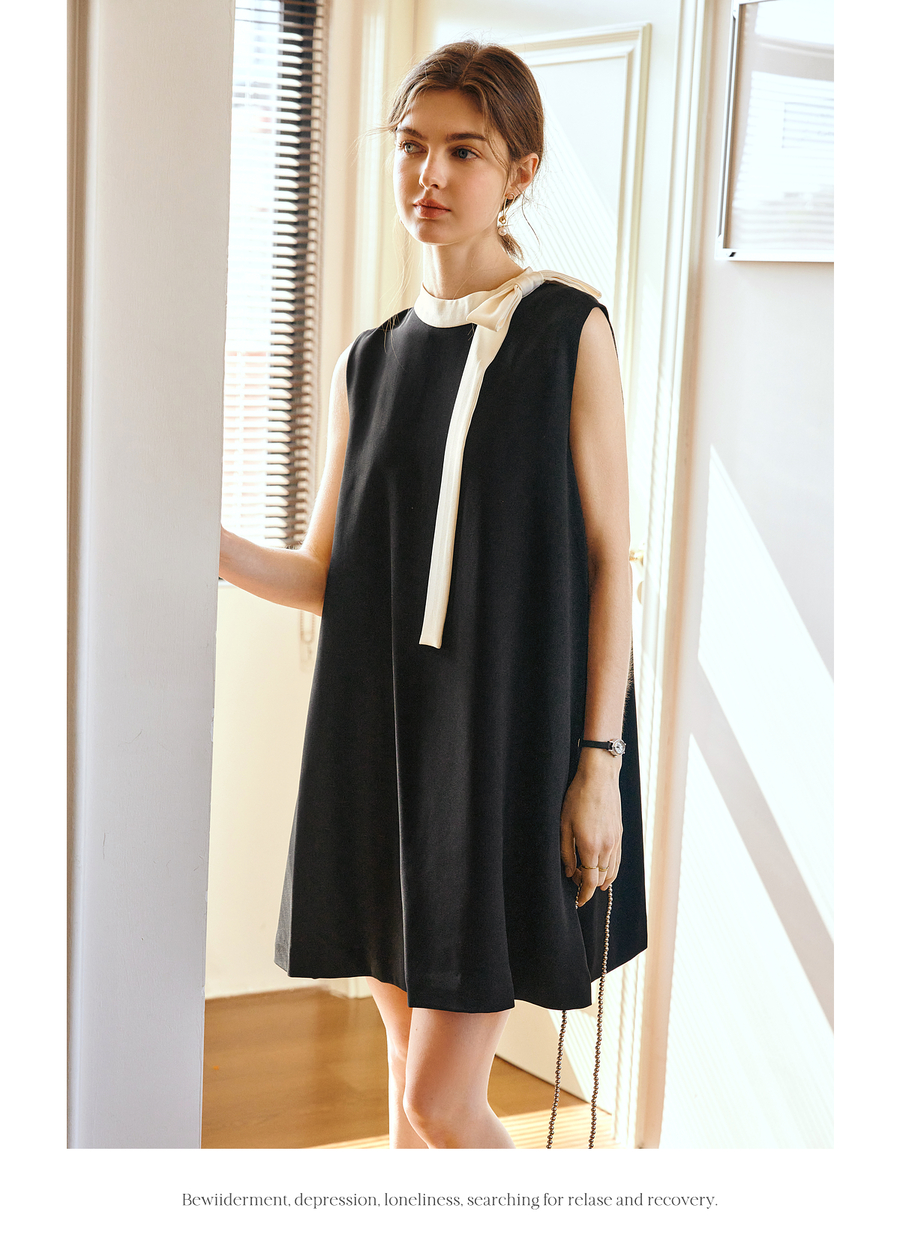 欧芮儿2025夏季新款气质拼接绑带蝴蝶结设计法式宽松无袖连衣裙女