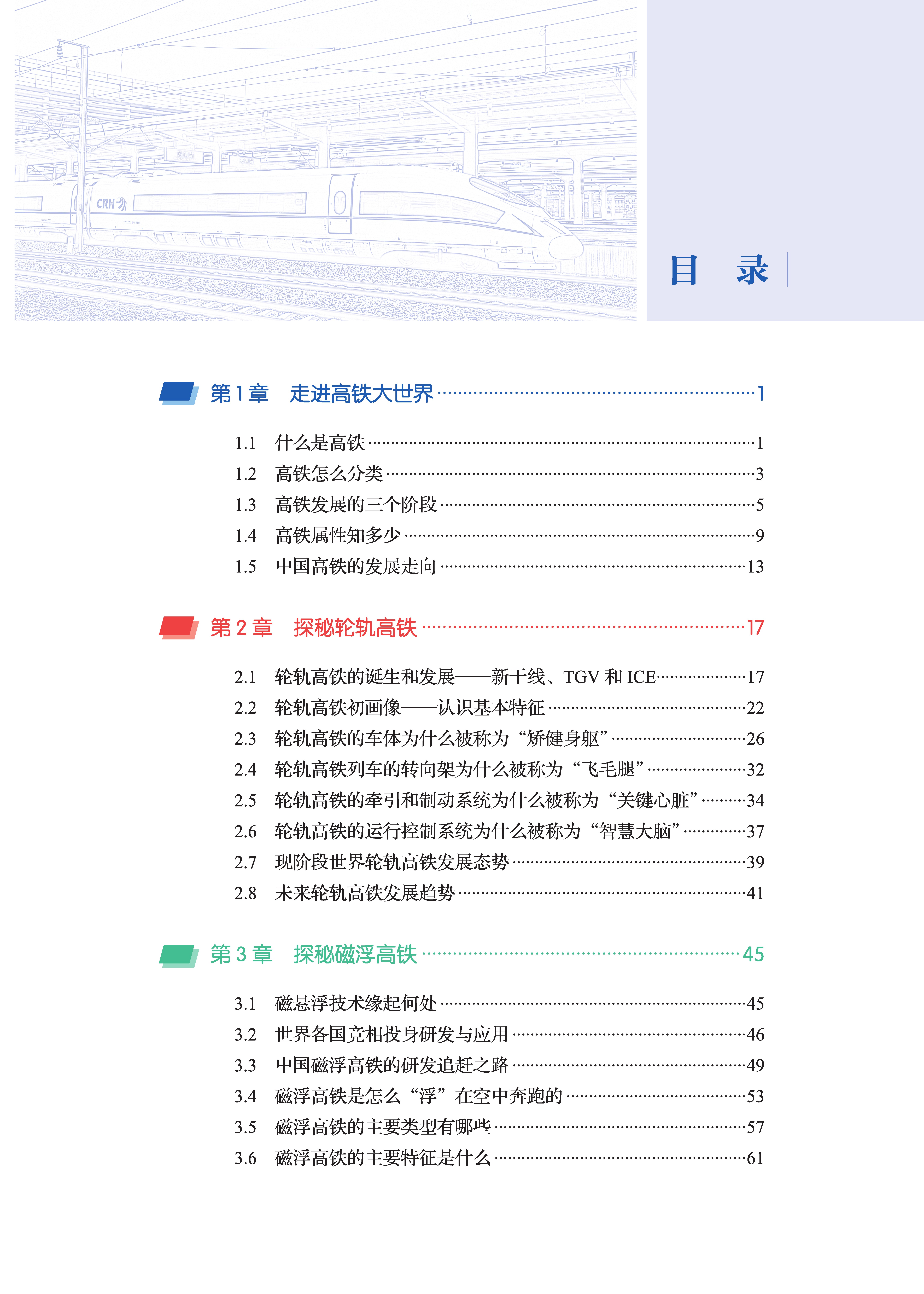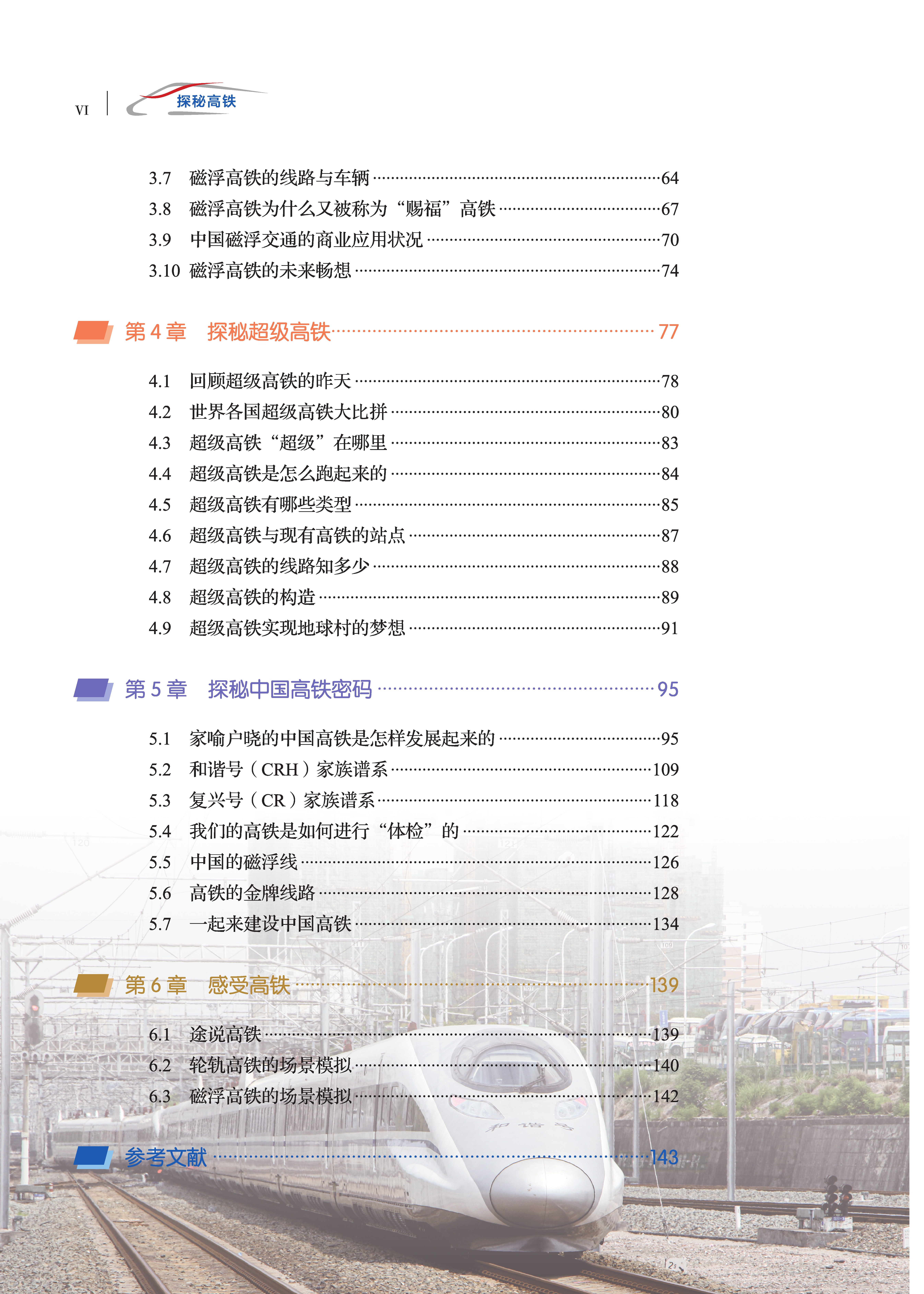 在科普过程中,拆解不同类的高铁,让读者对每类高铁有一个较清晰的认识。如拆解一列轮轨高铁,对构成高铁动车组的总成、车体、转向架、牵引动力、制动系统和列车网络系统逐一向读者科普技术原理、作用和功能,解答“快”的原理;通过图文结合,向读者充分讲解各类动车组的技术特点和性能参数,解答什么样的车跑什么样的路“稳”的机理;介绍牵引与制动系统与列车网络控制系统时,通过对牵引供电系统、牵引传动系统、辅助供电系统和制动模式以及列车网络控制系统的实物造型和图像分析,解答“安全”的道理。