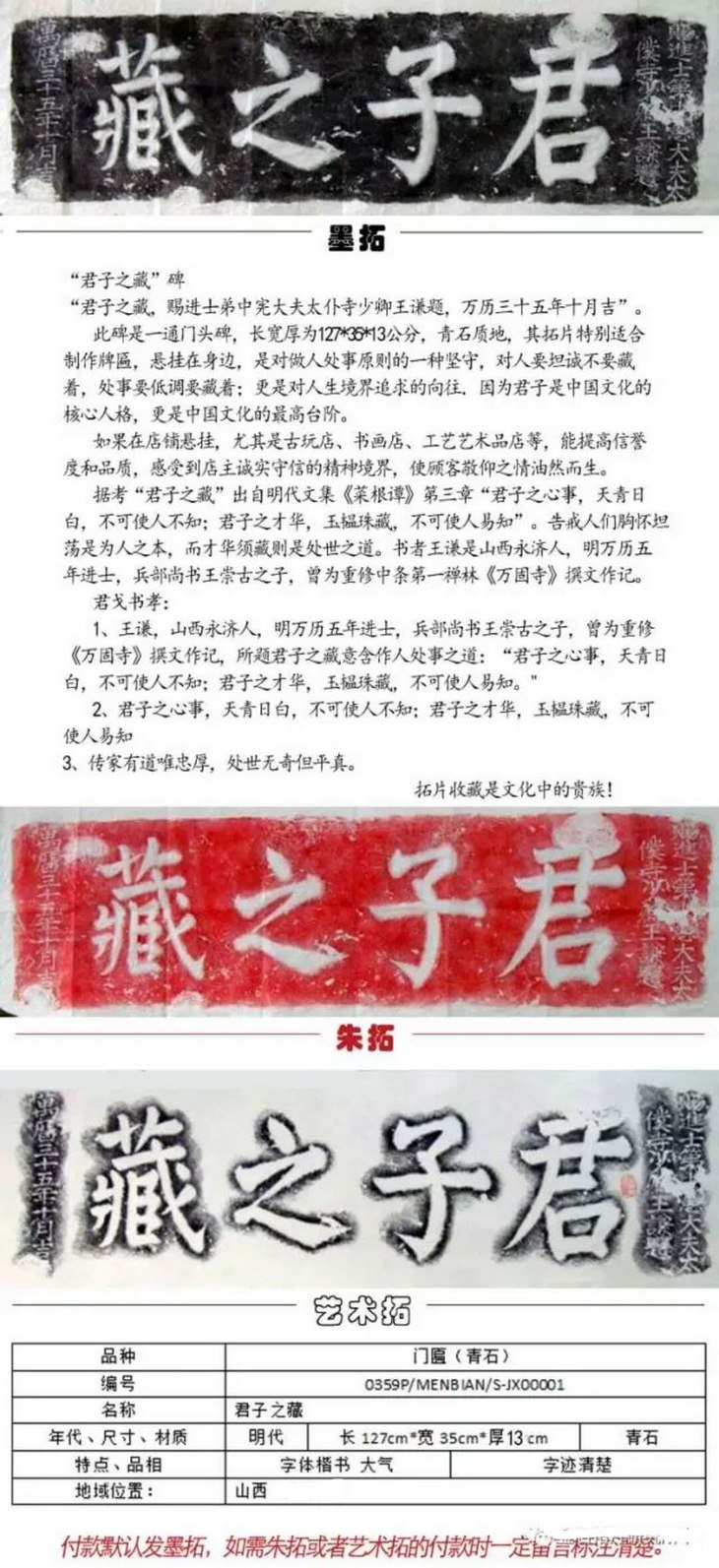 其拓片特别适合制作牌匾,悬挂在身边,是对做人处事原则的一种坚守,对人要坦诚不要藏着,处事要低调要藏着;更是对人生境界追求的向往。因为君子是中国文化的核心人格,更是中国文化的最高台阶。