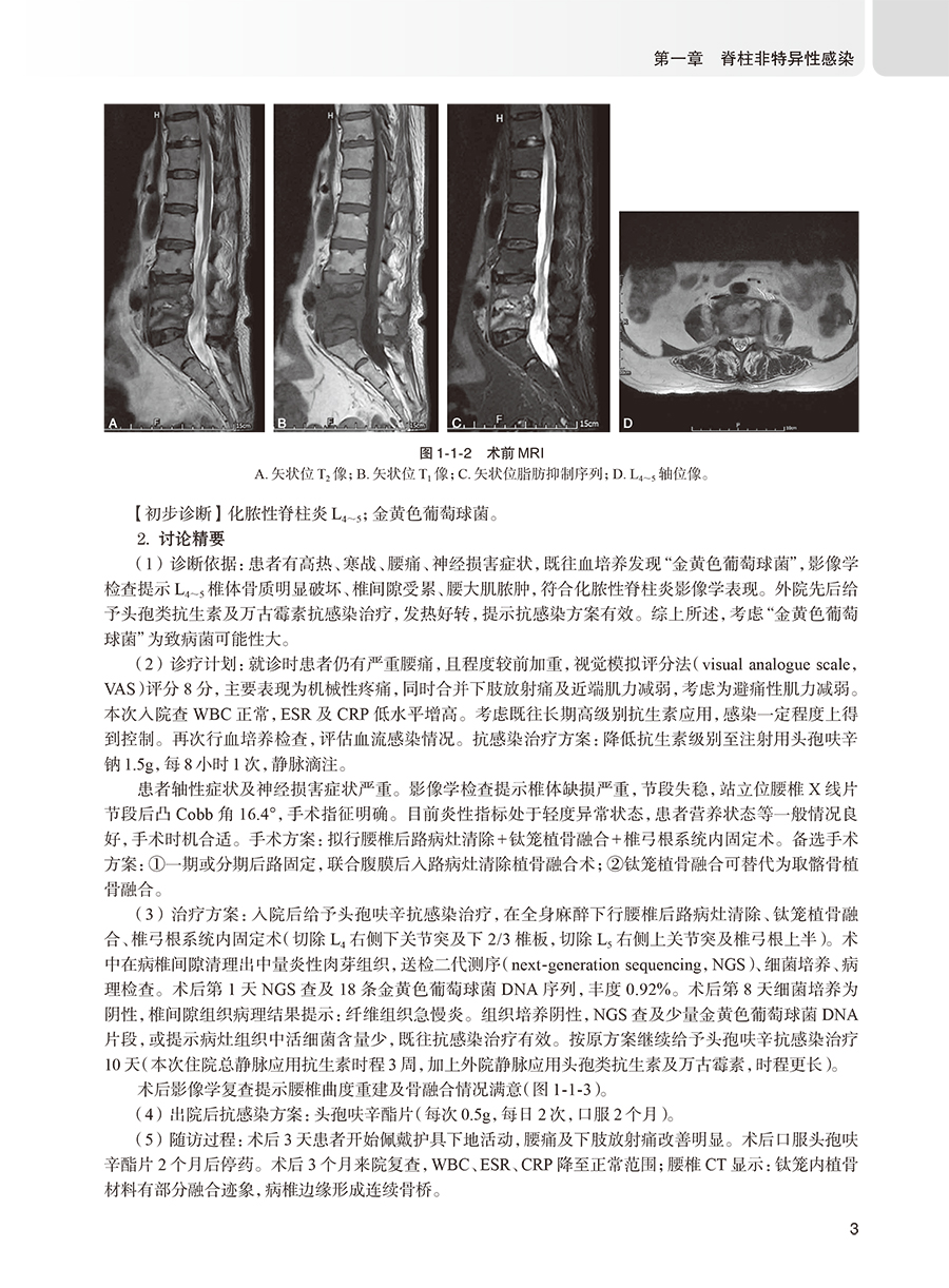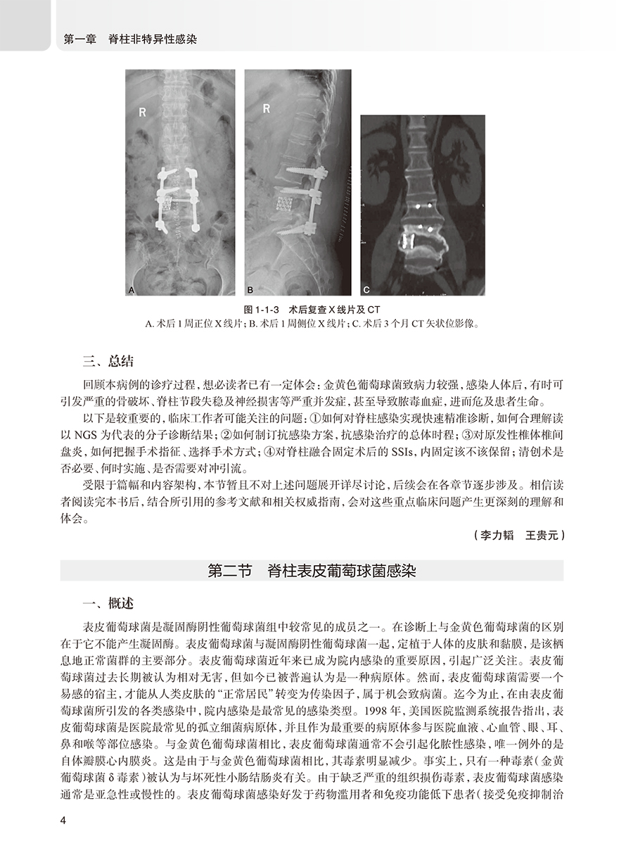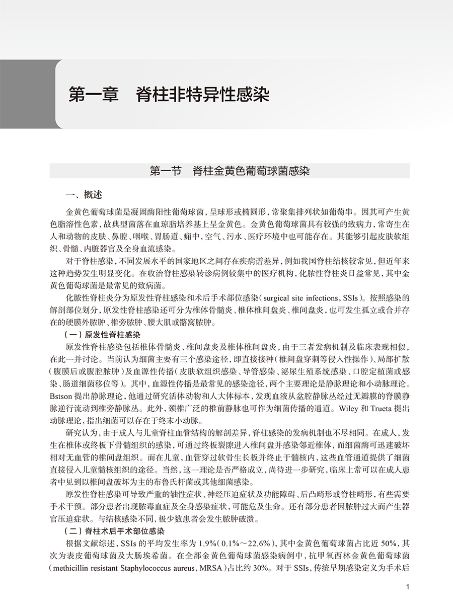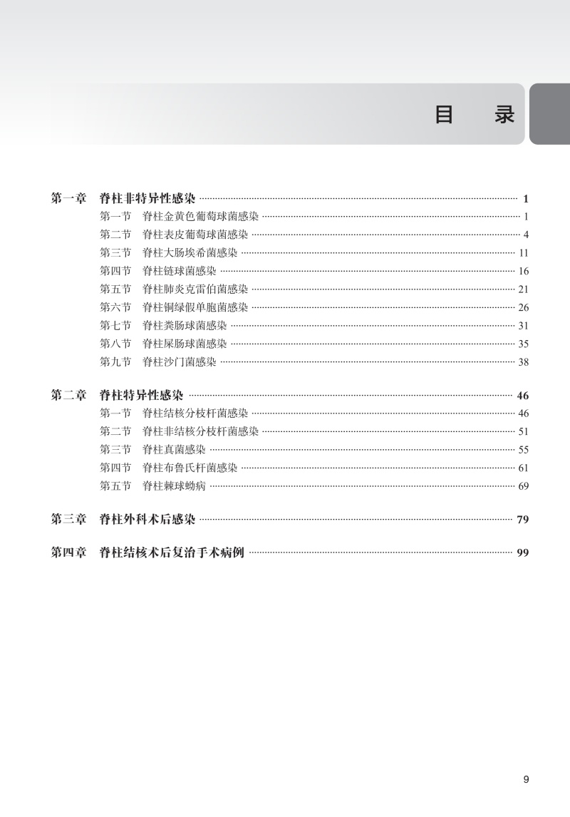 脊柱感染性疾病是指由不同病原微生物引起的脊柱不同部位(椎体、椎间盘、附件、椎管和邻近椎旁组织)的一系列感染性疾病,约占全身骨骼肌肉系统感染的2%~7%。脊柱感染性经典分类法可分为特异性感染和非特异性感染两种类型。脊柱特异性感染包括结核分枝杆菌感染、非结核分枝杆菌感染、布鲁氏杆菌感染、真菌感染和寄生虫感染。脊柱非特异性感染包括金黄色葡萄球菌感染、表皮葡萄球菌感染、大肠埃希菌感染、链球菌感染、肺炎克雷伯菌感染、铜绿假单胞菌感染、粪肠球菌感染、屎肠球菌感染、沙门氏菌感染等。本书将针对不同类型的脊柱感染,先进行概述,之后从临床表现、影像学检查、病理学和实验室检查、非手术治疗、手术适应证和禁忌证、术前准备、手术步骤、术后处理等方面进行阐述,最后附上2~3个经典病例。这些经典病例是本书的精髓所在,旨在加深读者对该疾病的理解和认识。每个病例的展示包括病史、症状、体征、影像学和实验室检查、诊断思路、术前处理、手术方法、术后管理措施,以及对该疾病的研究现状和**进展等,力争将该疾病的诊断和治疗方法阐述更加得鲜活生动。每个病例争取都具有一定代表性,在诊断和治疗上具有一定难度,达到读者有受益匪浅的感觉。随着脊柱结核手术在基层医院的逐步开展,手术失败需要翻修的患者逐年增多,此类患者手术难度大,并发症发生率高,基层医院难以完成。针对这一问题,本书将对脊柱结核手术失败翻修病例进行展示,详细阐述脊柱结核手术失败的诊断、治疗原则、手术入路选择、手术技术要点及预后。脊柱结核患者误诊行椎体强化术的问题日趋严重,脊柱外科医生对这个问题的认识存在误区,其结果是对患者产生灾难性后果。针对这一临床常见问题,本书将详细阐述脊柱结核误诊行椎体强化术患者的治疗原则和方法,及远期效果,加深同行对该问题的认识。