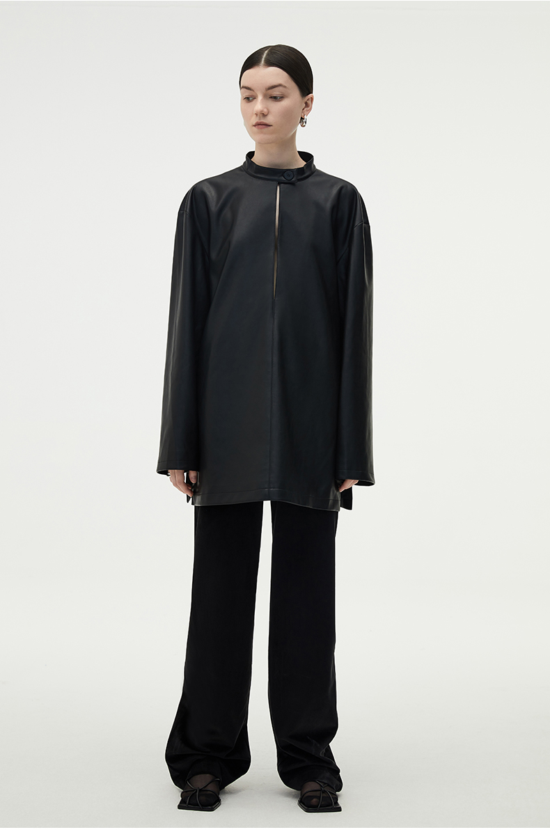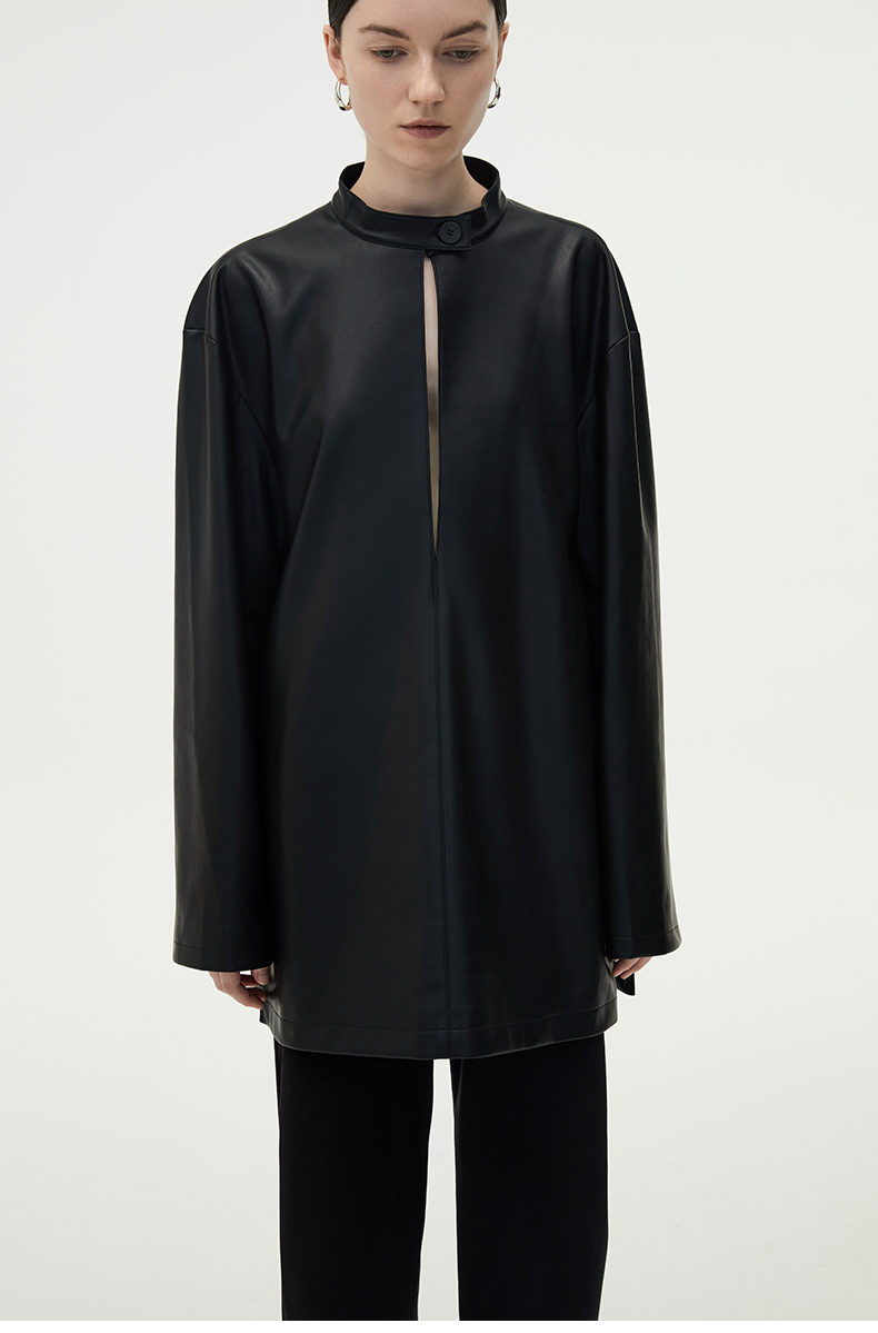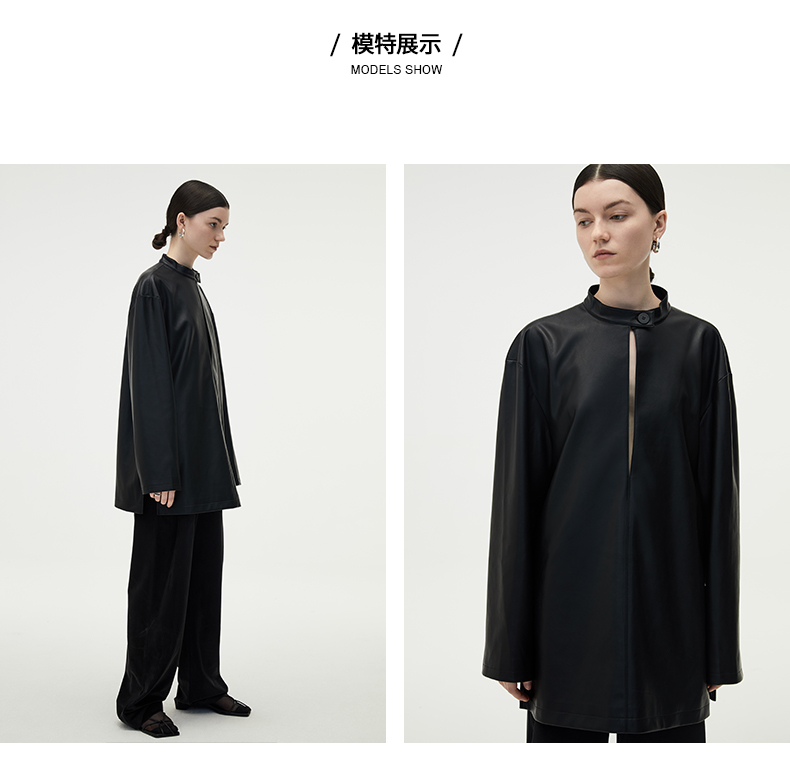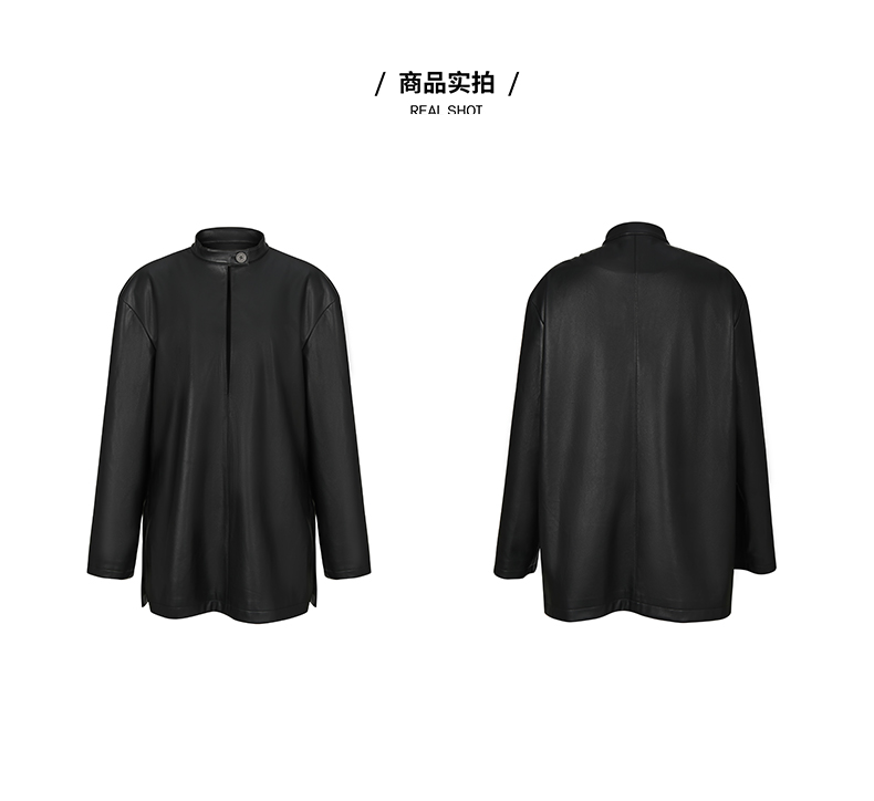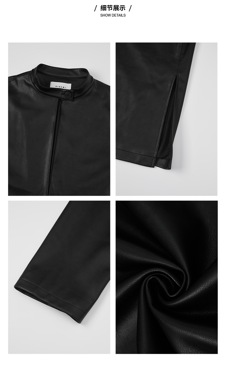 HIDEMI 黑色纽扣式镂空设计感小立领皮上衣皮衣