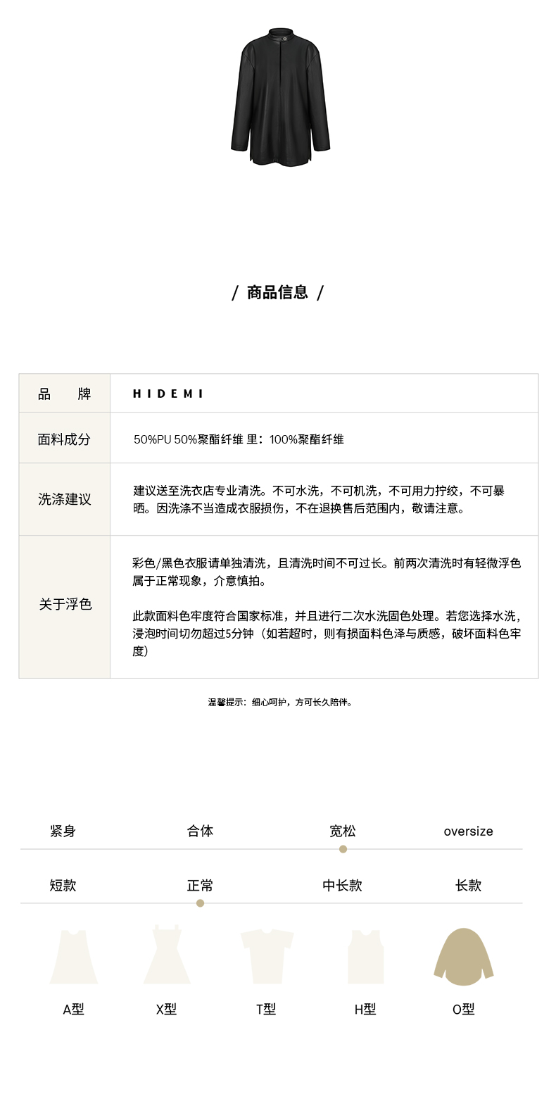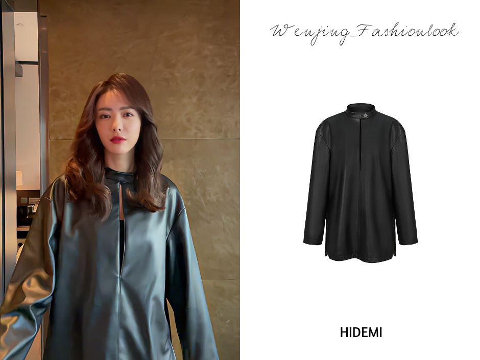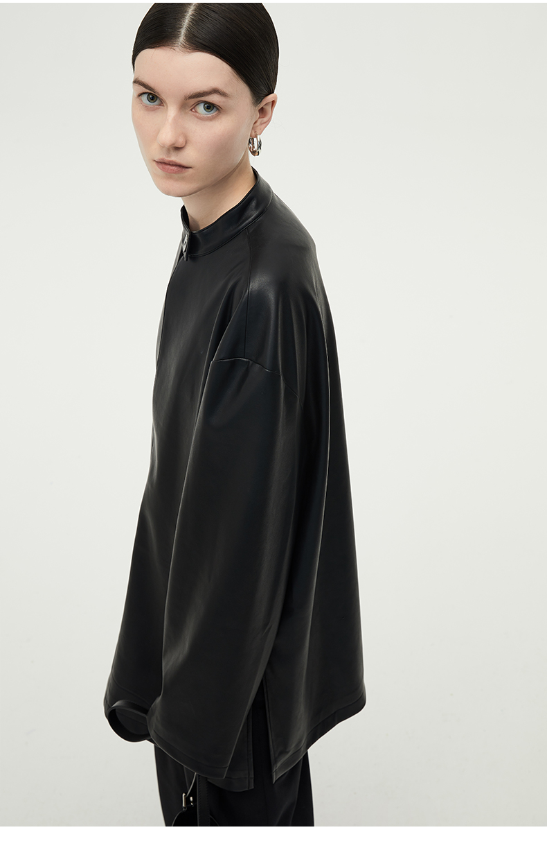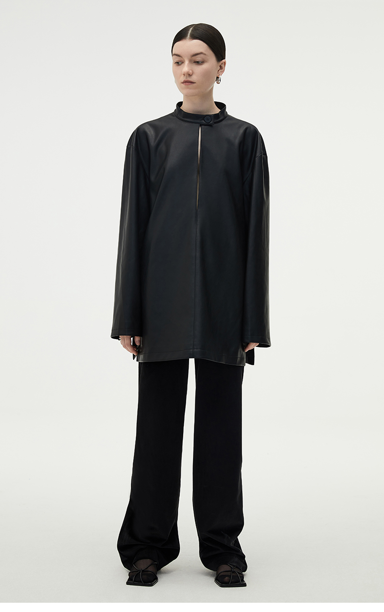 HIDEMI 黑色纽扣式镂空设计感小立领皮上衣皮衣