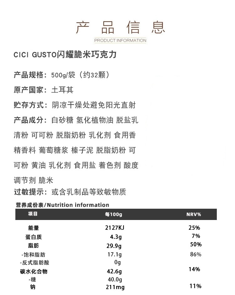 【中欧班列精选】WWJ 土耳其进口闪耀牌奶油夹心复合巧克力脆米糖 500g