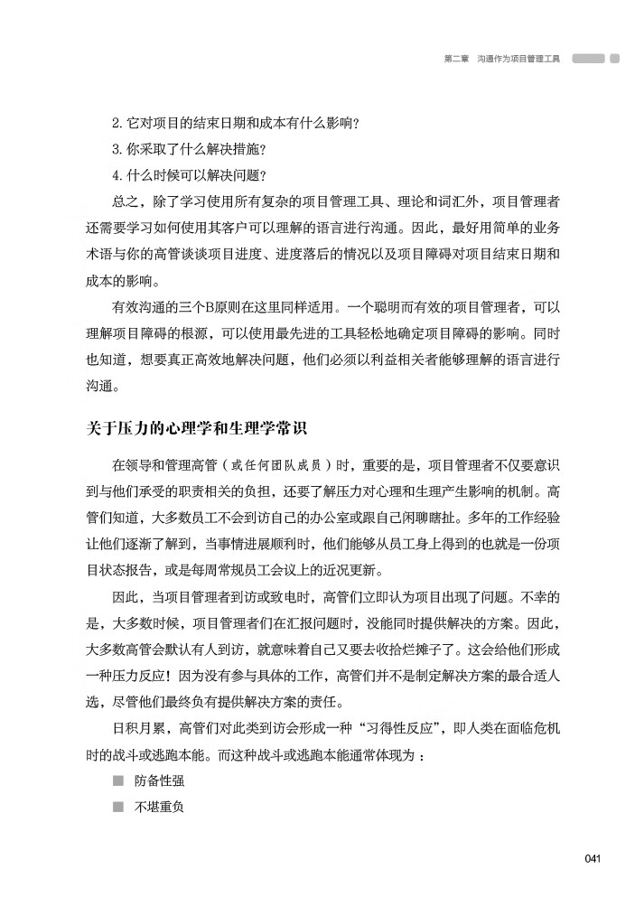 向项目负责人或高管陈述障碍及其解决方案,总会让项目经理倍感压力。如果项目经理表现得非常不确定或虚弱或一副天要塌了的表情,他们就无法获得高管的信任,并继续承担领导者的角色。