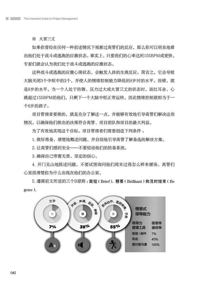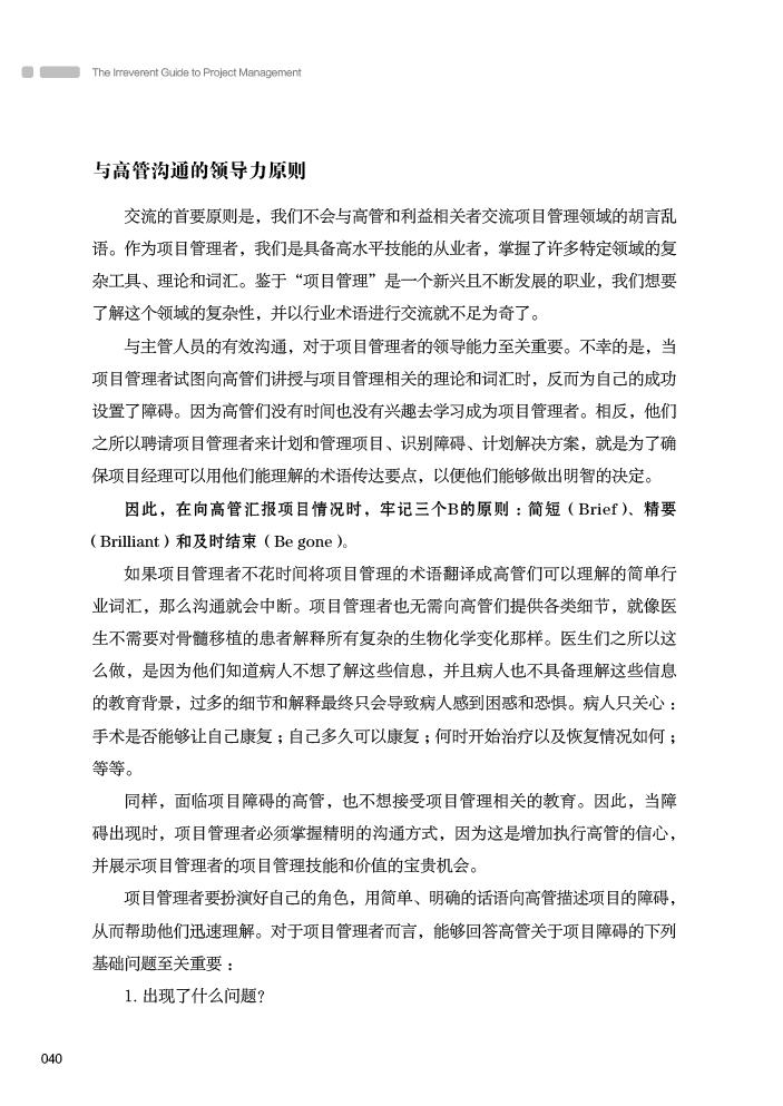 因此,在向高管汇报项目情况时,牢记三个B的原则 :简短(Brief)、精要(Brilliant)和及时结束(Be gone)。