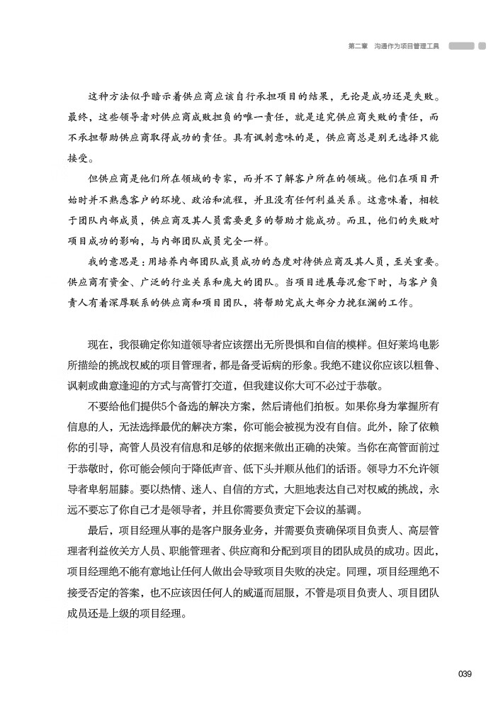 项目经理和我们的客户常常忘记,我们雇用的供应商也是项目利益相关者。如果我们购买了他们的产品和安装服务或我们依靠他们提供专业的知识,那他们的失败也会像内部项目团队成员的失败那样,影响到项目的结束日期、成本和产品质量。我遇到过一些拥有控制权的领导者,他们选择运用自身的领导才能而非权威来管理内部团队成员。所有这些领导者的团队成员都能够充分发展,并被企业视为绩效最佳的人。但讽刺的是,我还观察到,其中一些领导者,在面对供应商时,选择完全放弃领导技能,完全依赖权威来管理。