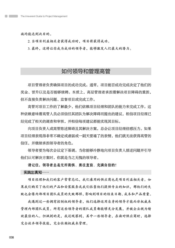 现在,我很确定你知道领导者应该摆出无所畏惧和自信的模样。但好莱坞电影所描绘的挑战权威的项目管理者,都是备受诟病的形象。我绝不建议你应该以粗鲁、讽刺或曲意逢迎的方式与高管打交道,但我建议你大可不必过于恭敬。