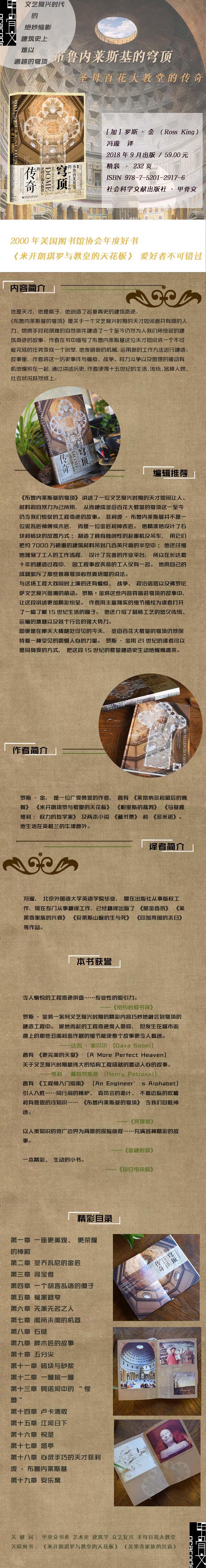 《布鲁内莱斯基的穹顶》是关于一个文艺复兴时期的天才如何避开有限的人力、物质手段和艰难的自然条件建造了一个至今仍然为人我们所惊叹的建筑奇迹的故事。作者在书中描写了布鲁内莱斯基这位天才如何将一个不可能完成的任务变成一个创举,他发明新的机械,运用新的工作方法进行建造。故事里,作者将这一历史事件与瘟疫、战争、权力斗争以及思想的骚动有机地编织在一起,通过讲述历史,作者使得十五世纪的生活、传统、各种人物、社会状况跃然纸上。