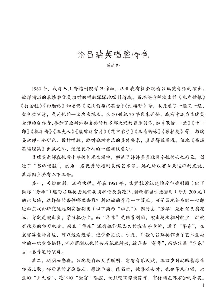 苏进邹编著的《吕瑞英越剧唱腔精选(附光盘)/ 上海越剧名家唱腔精选系列》是 套较系统、完整 地体现越剧唱腔音乐书,它是越剧理论体系的重要组 成部分;对传承者和越剧唱腔音乐研究者,是一份极 好的资料;对越剧爱好者,是一部内容极其丰
