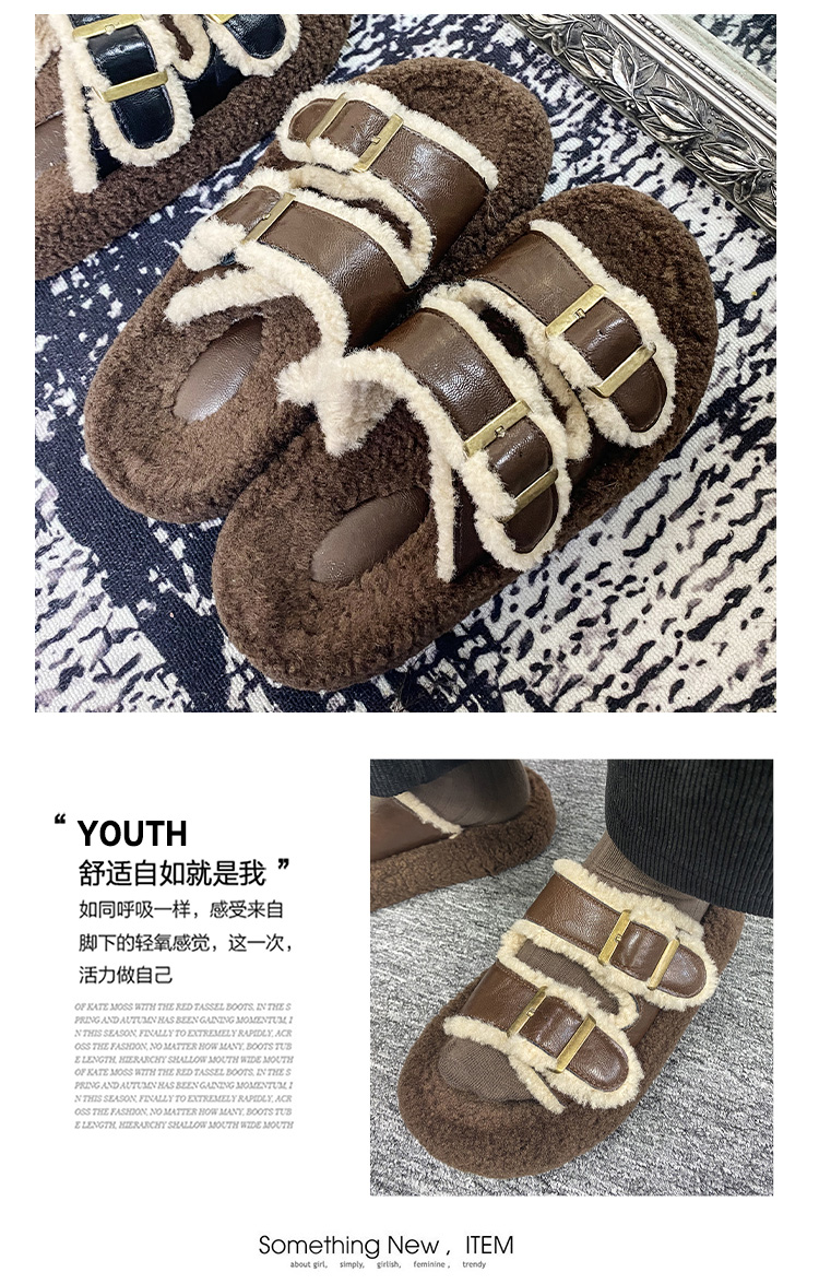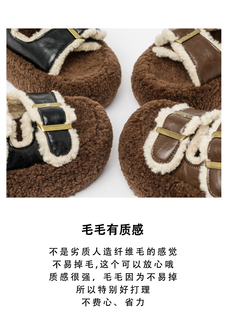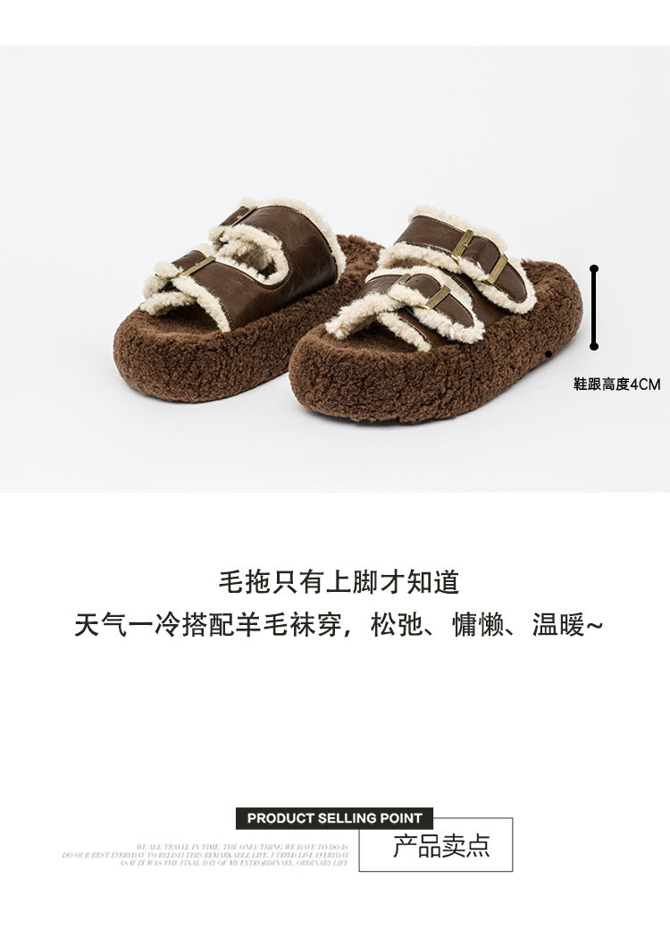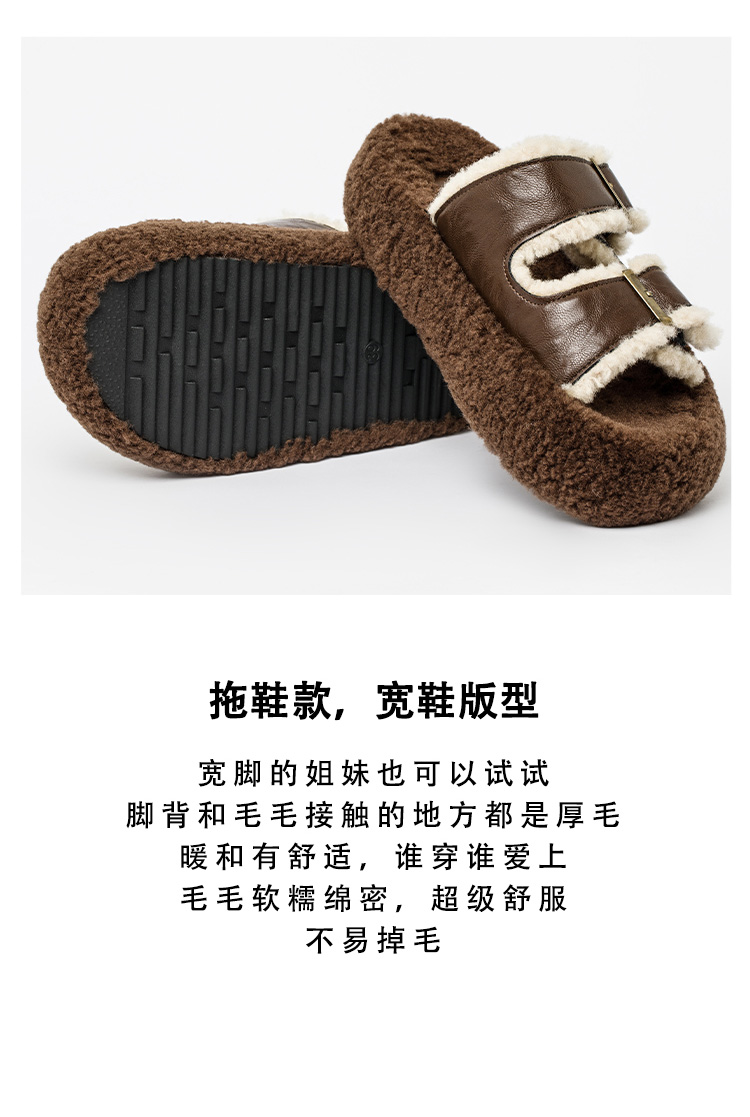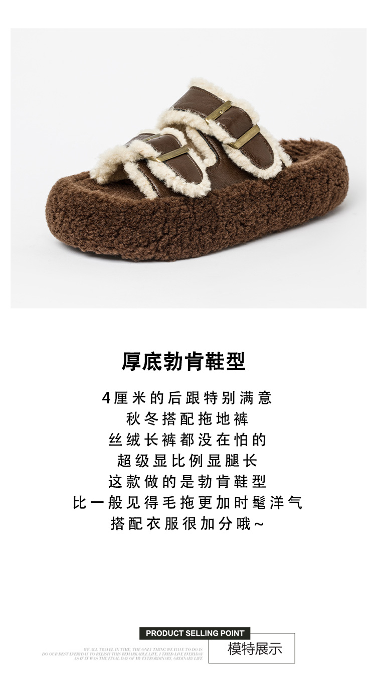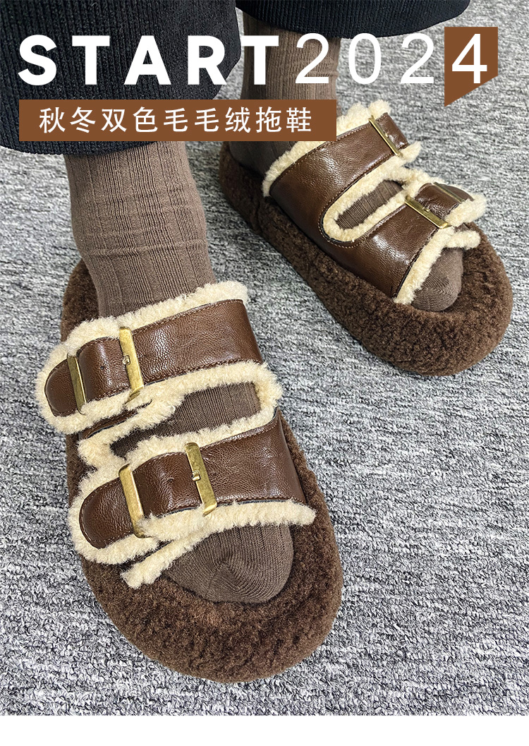 【勃肯拖鞋】跟高4厘米,黑棕两色【拍2减10】厚底棉拖鞋外穿慵懒增高毛毛拖鞋女,十几度温度穿没问题,