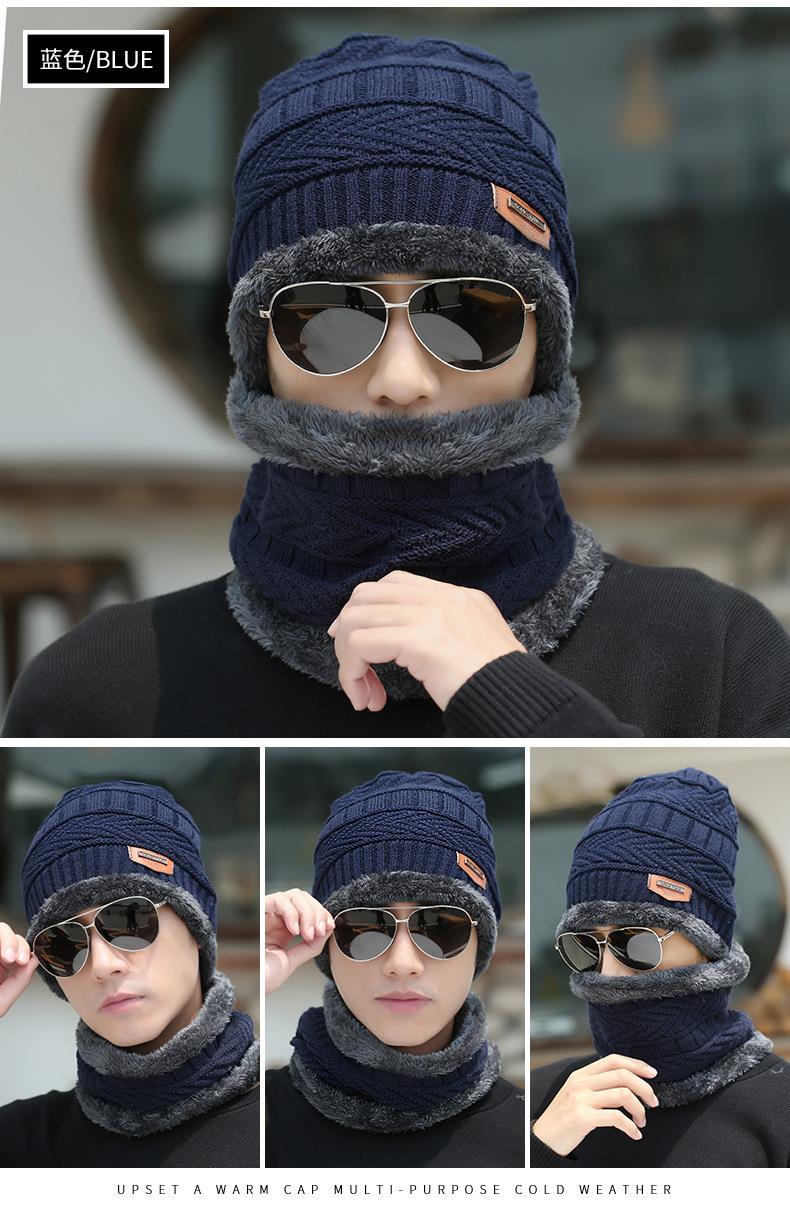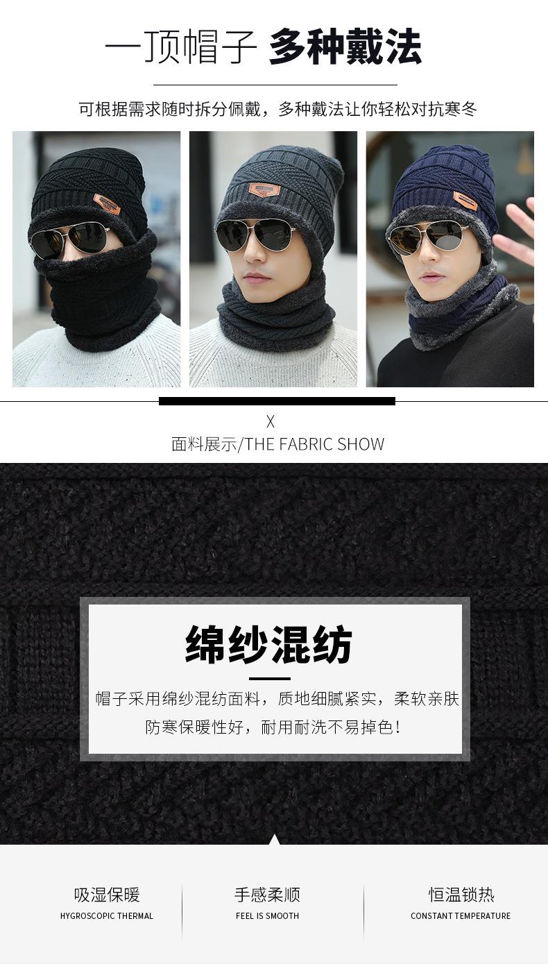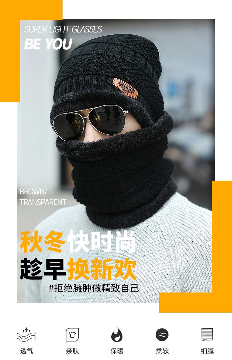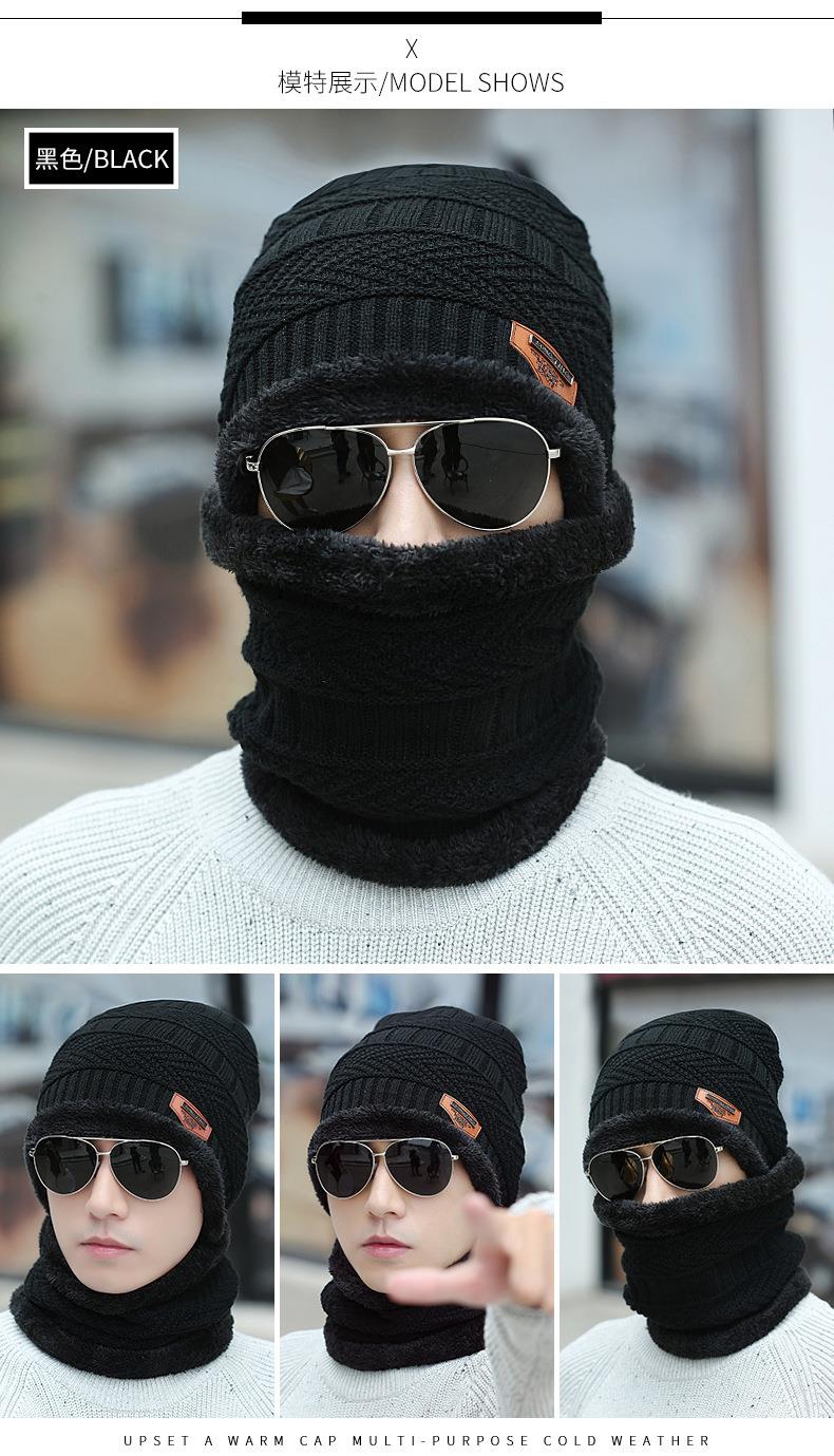 秋冬季保暖护脖毛线套帽男士加绒加厚针织帽子套头围脖两件套