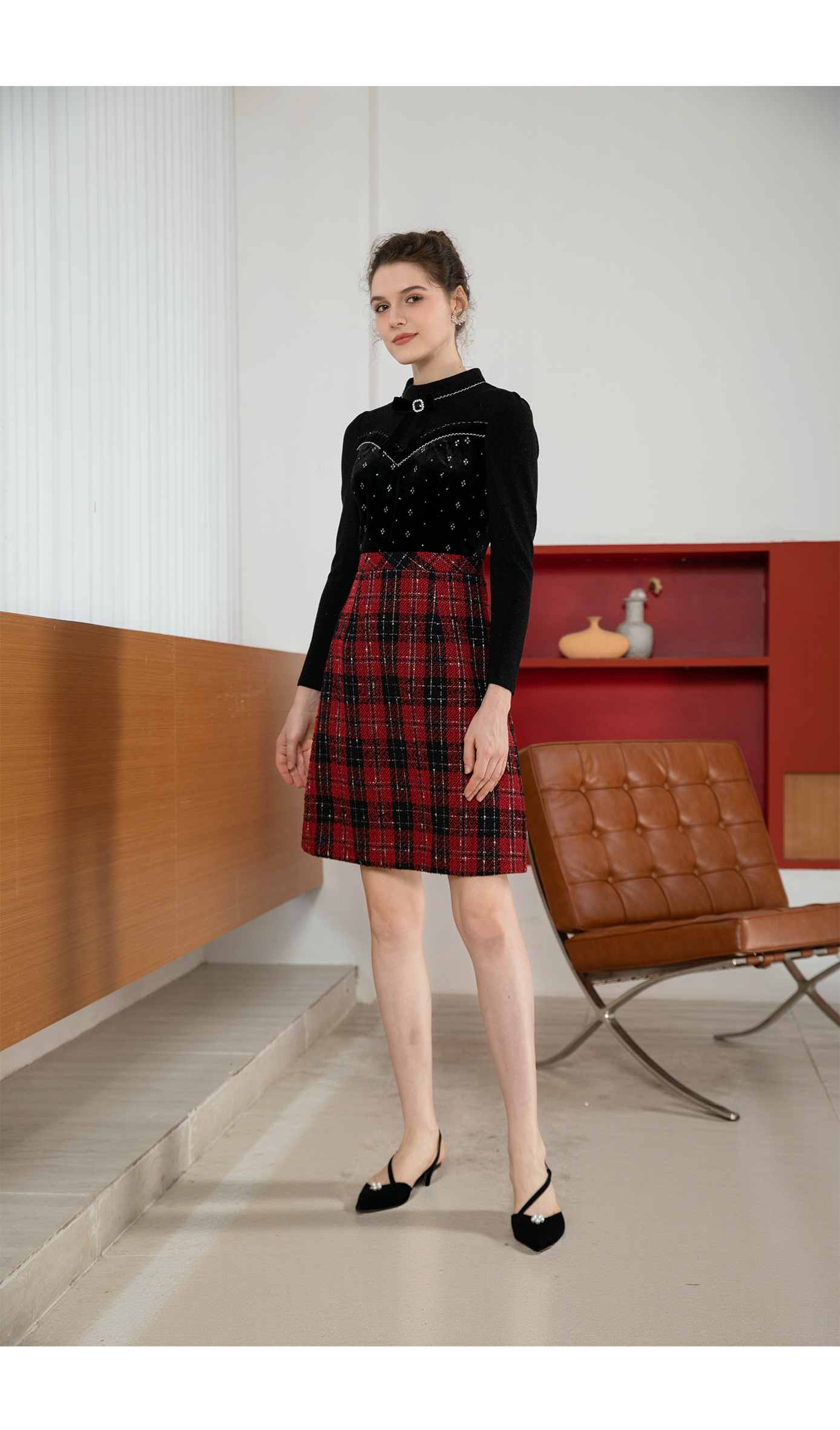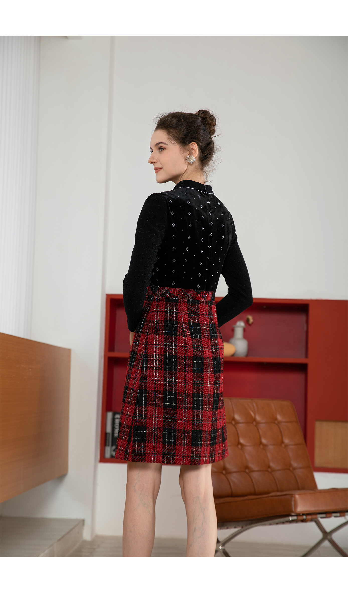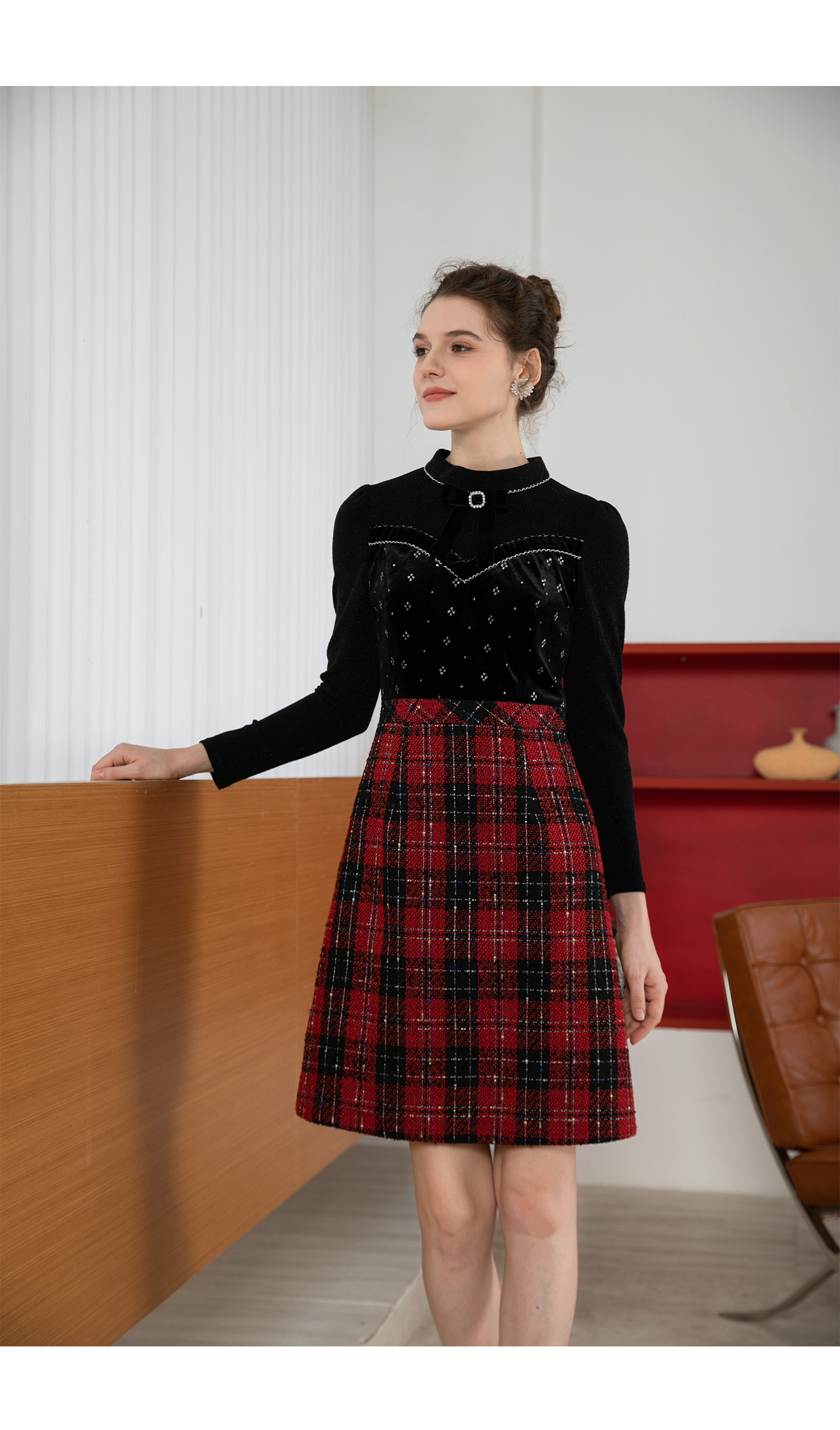 司歌丝绒拼粗花呢格子假两件连衣裙秋冬复古优雅A901197X