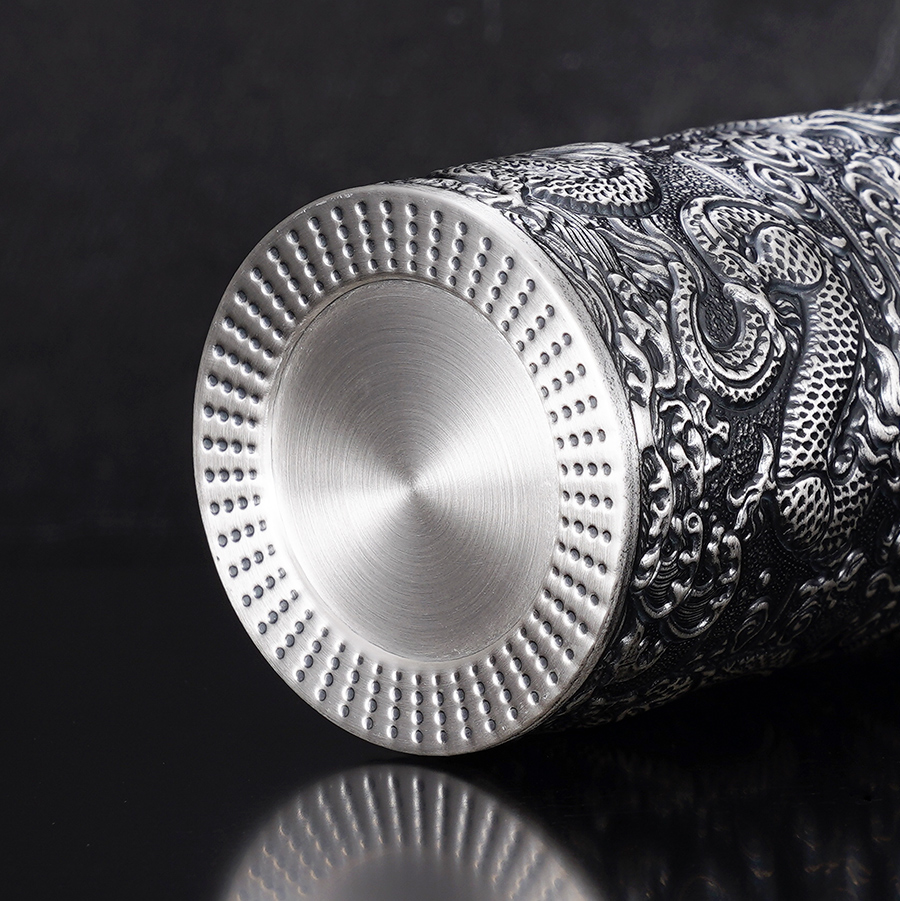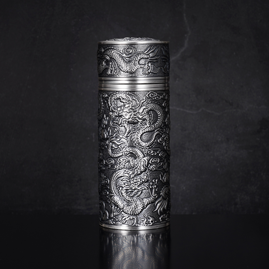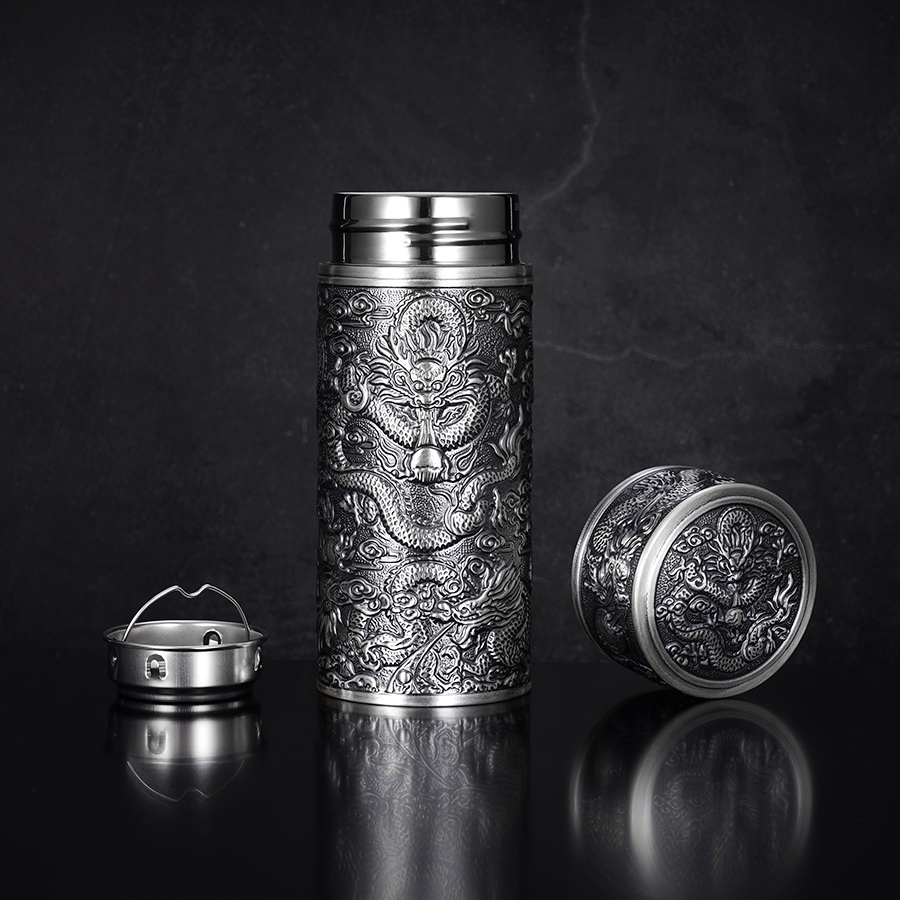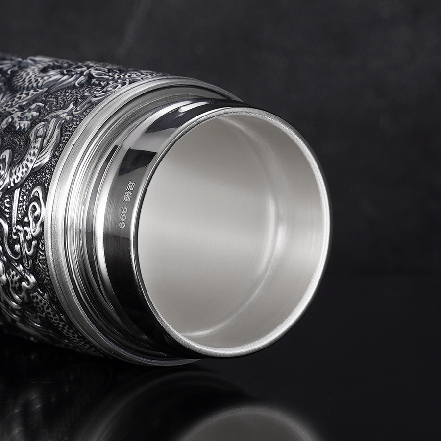 【寓意】:足银内胆杯,表面浮雕龙与太阳图案,立体深邃,神韵生动。独居东方力量感的佳作,寓意吉祥守护,招财纳福。