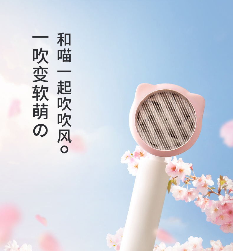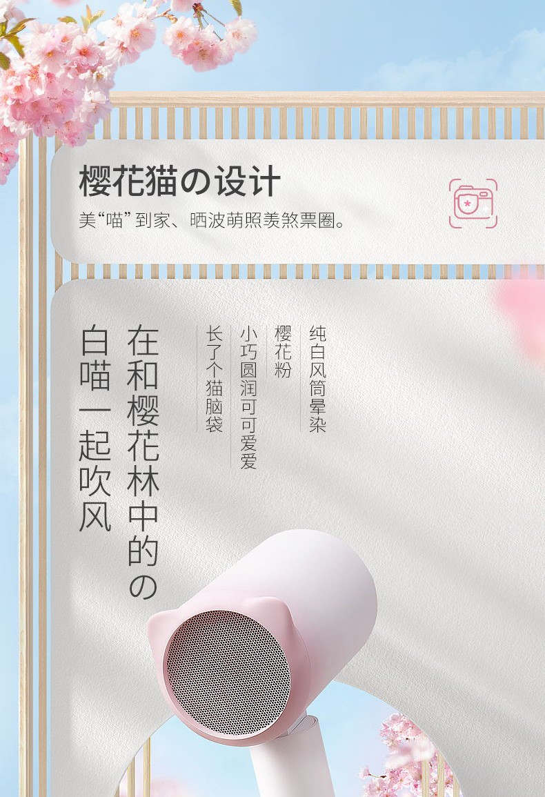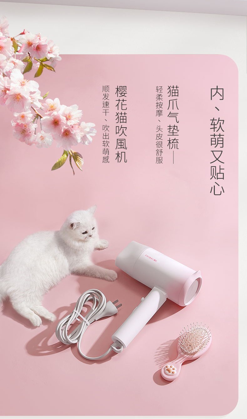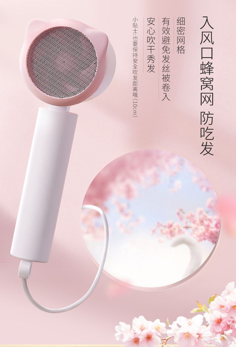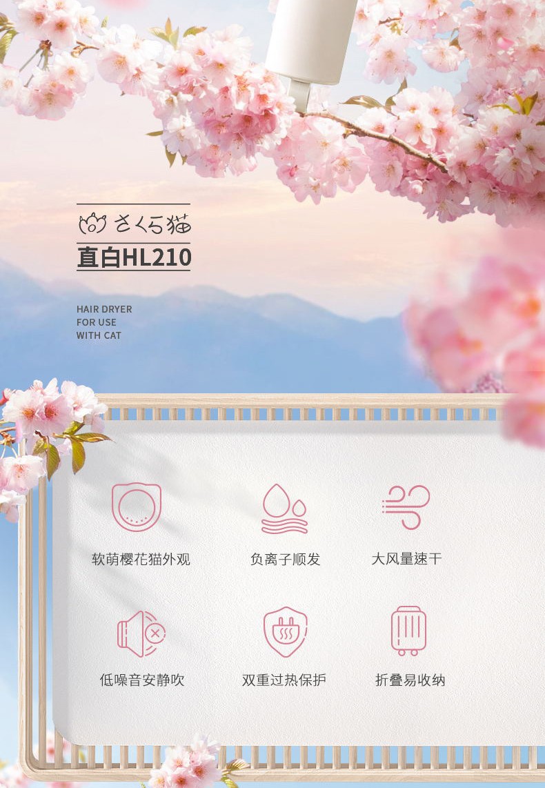 直白负离子电吹风HL210/1600W负离子家用吹风机可折叠速干大功率学生宿舍护发吹风筒 可爱樱花猫 HL210