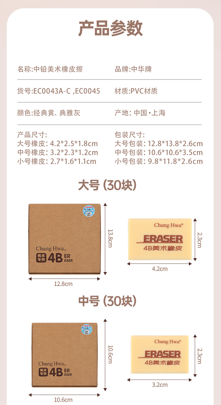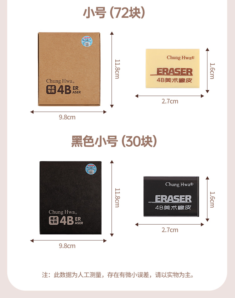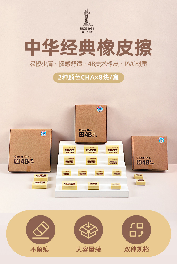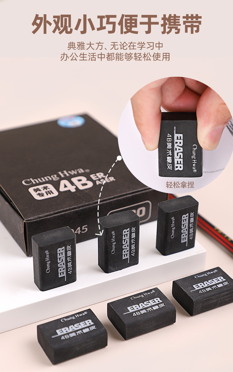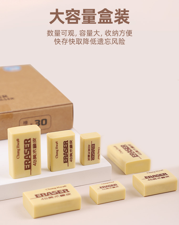 中华文具4B橡皮擦素描美术用少屑小学生用不留痕儿童擦得超干净一年级大容量像皮美术文具用品