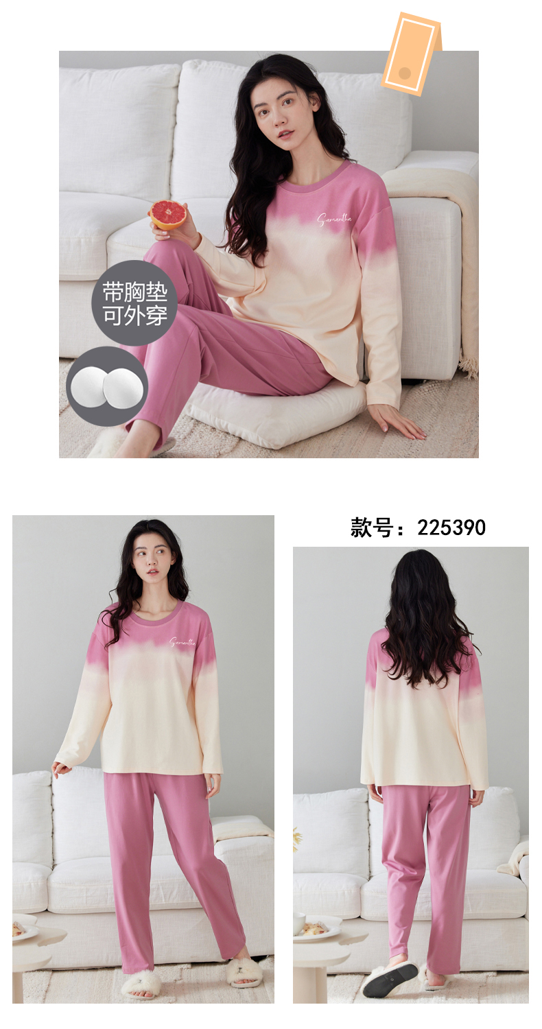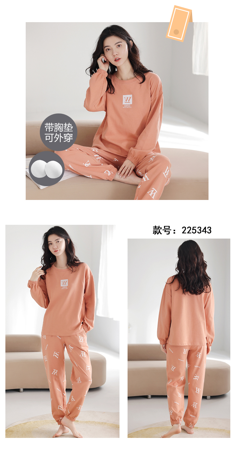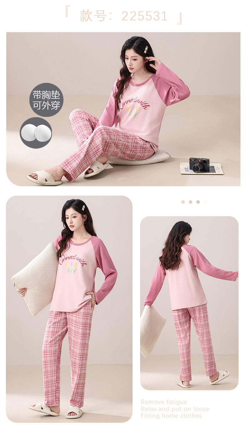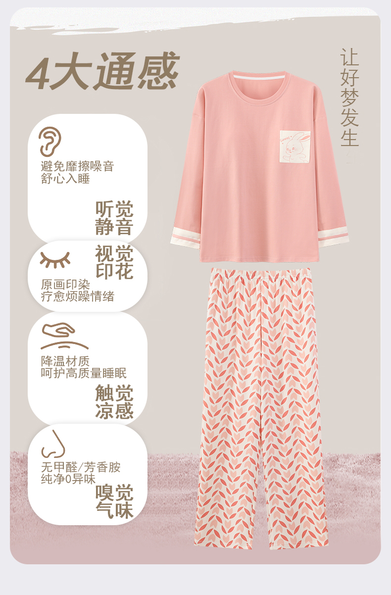 【热卖推荐】自然醒柔汐(带胸垫)女士家居服100%棉长袖长裤套头睡衣QH