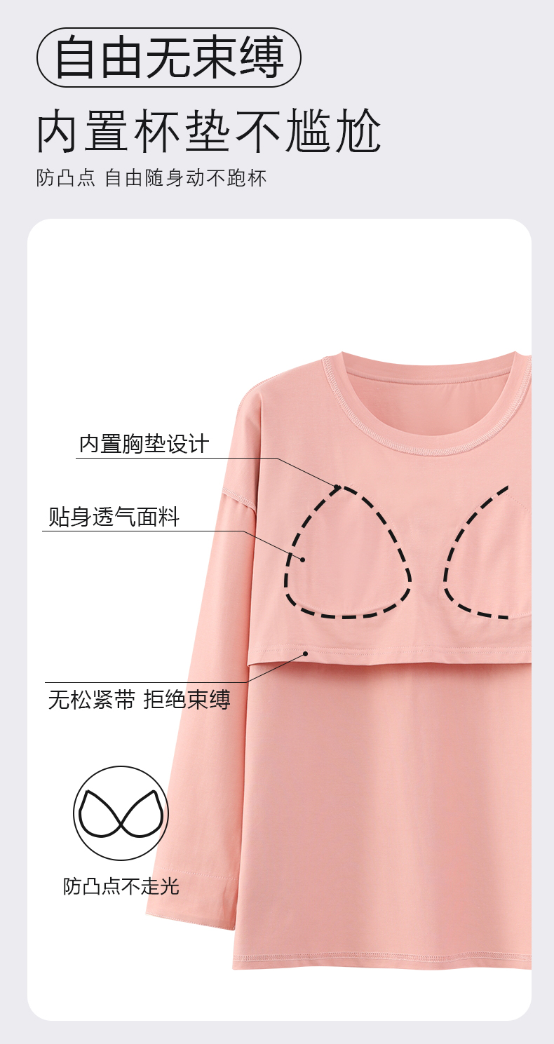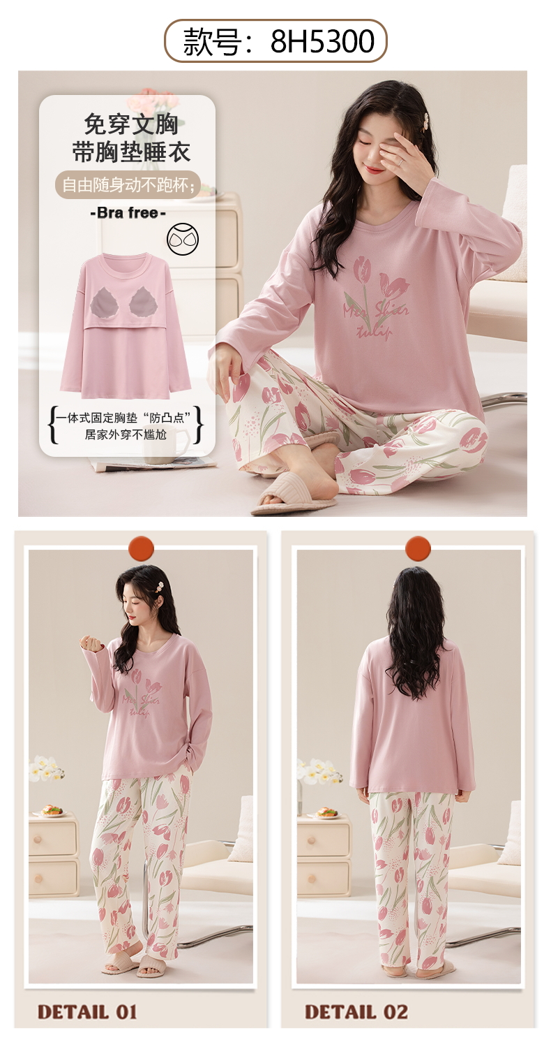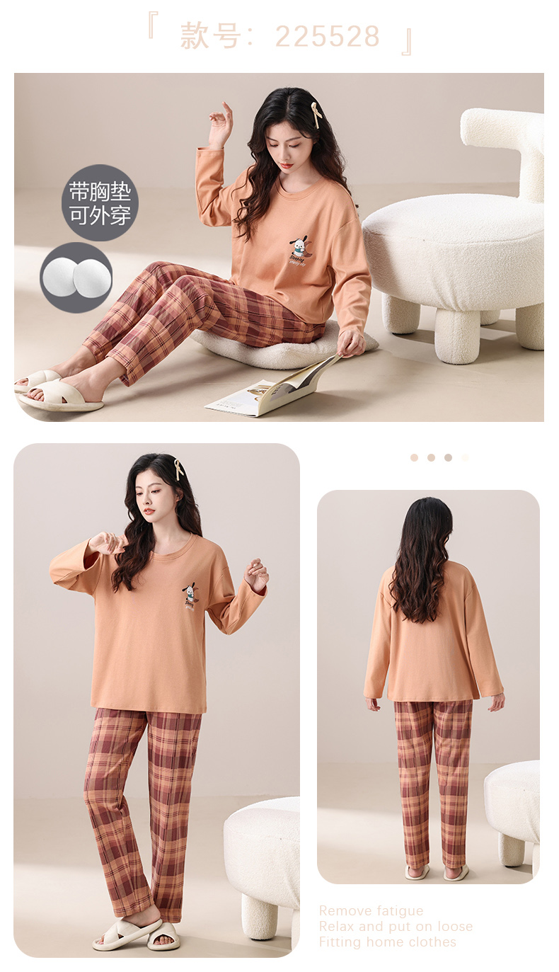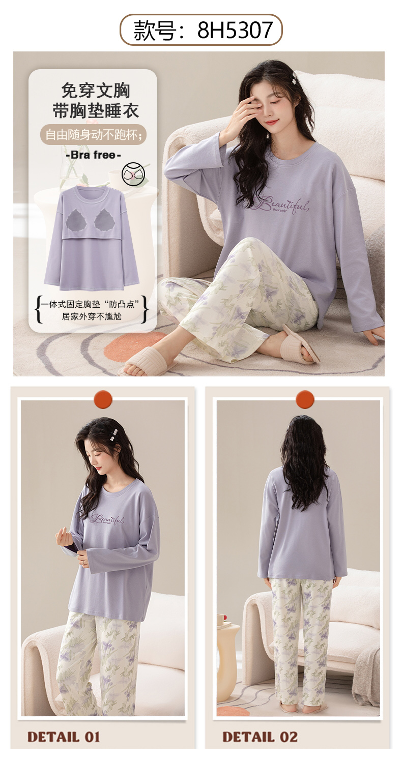 【热卖推荐】自然醒柔汐(带胸垫)女士家居服100%棉长袖长裤套头睡衣QH