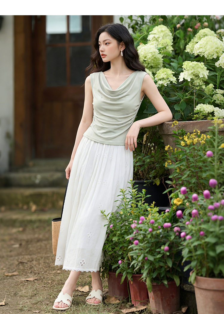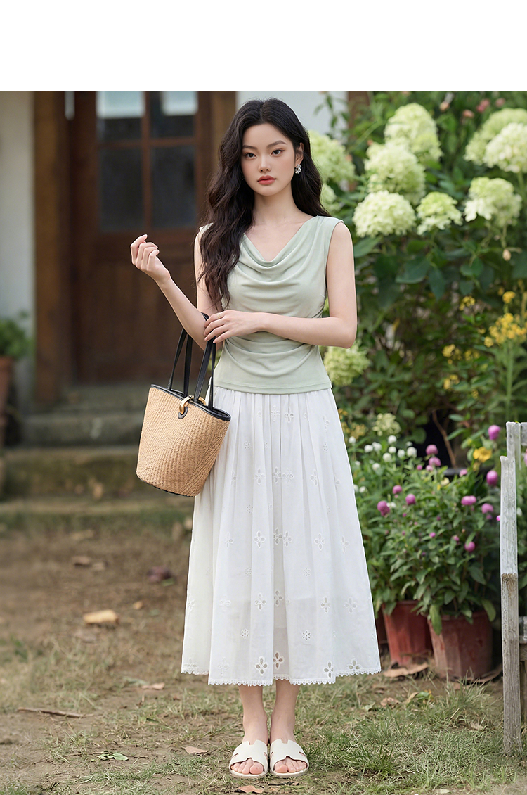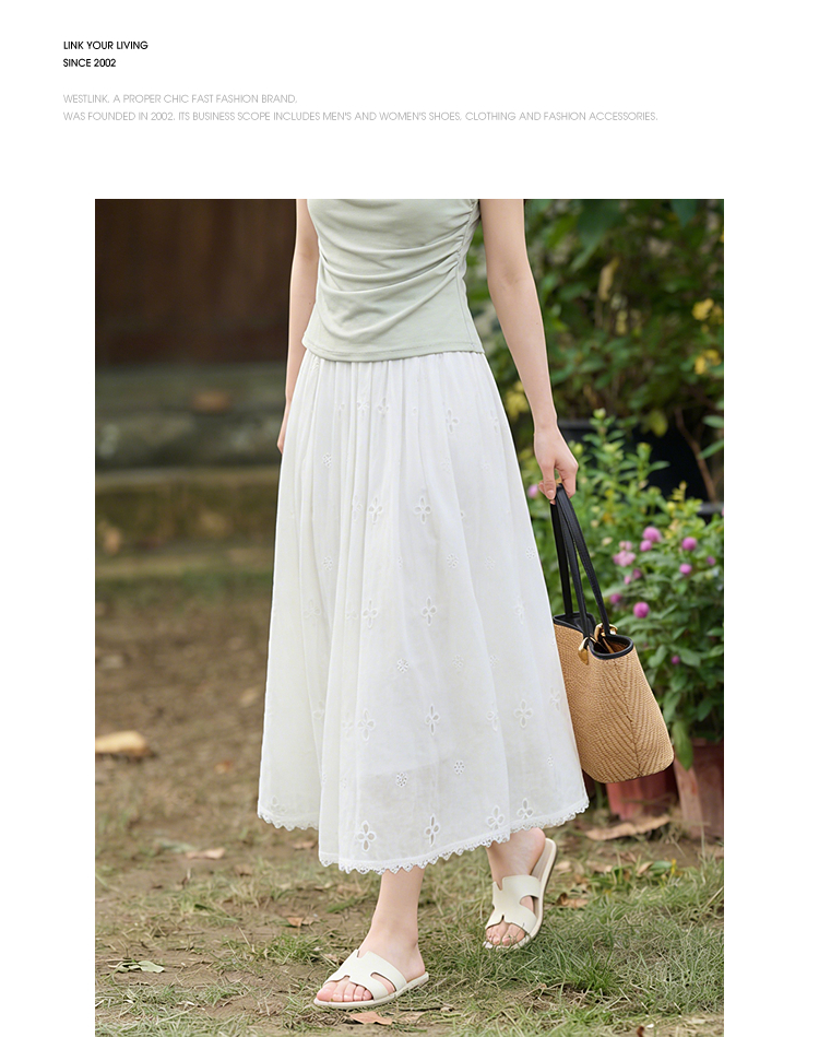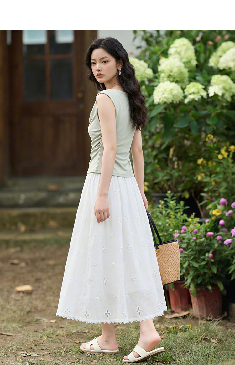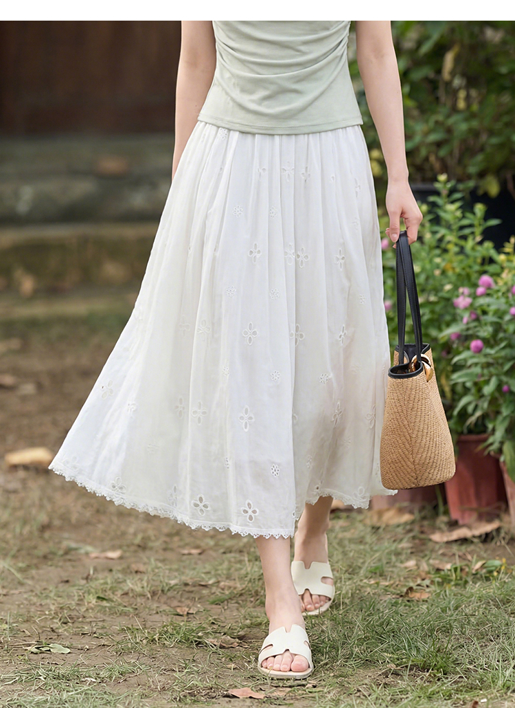 西遇法式刺绣2026春夏新款质感镂空花边高腰A字褶皱宽松半身伞裙H0060221