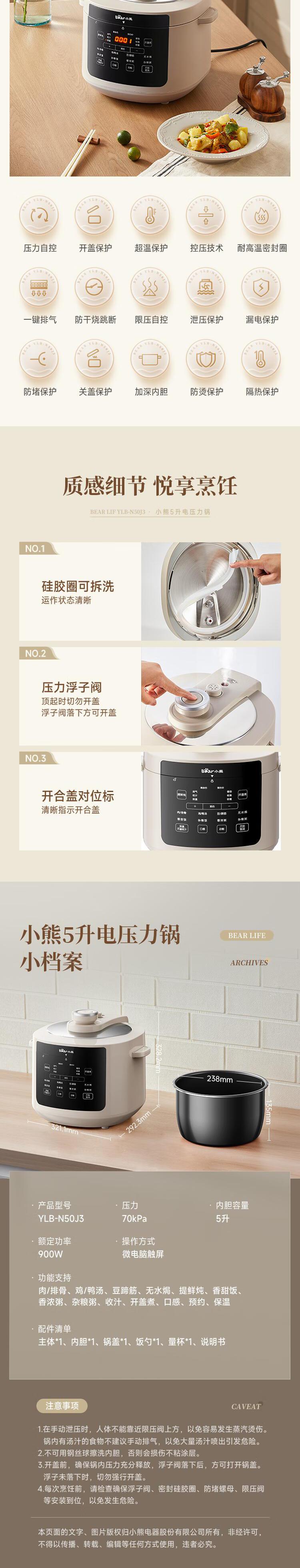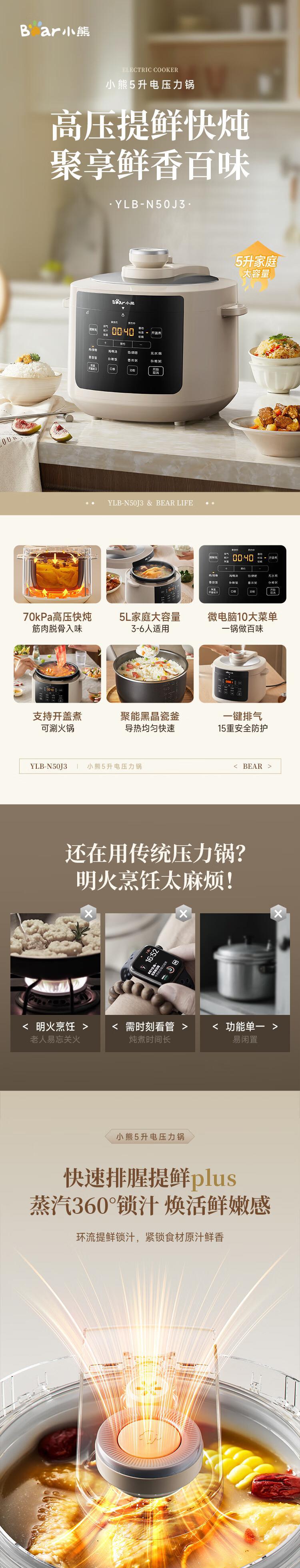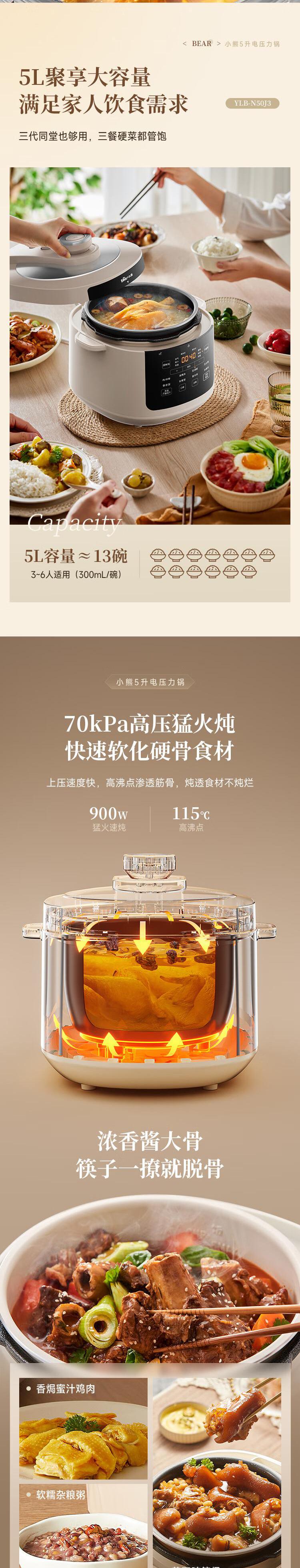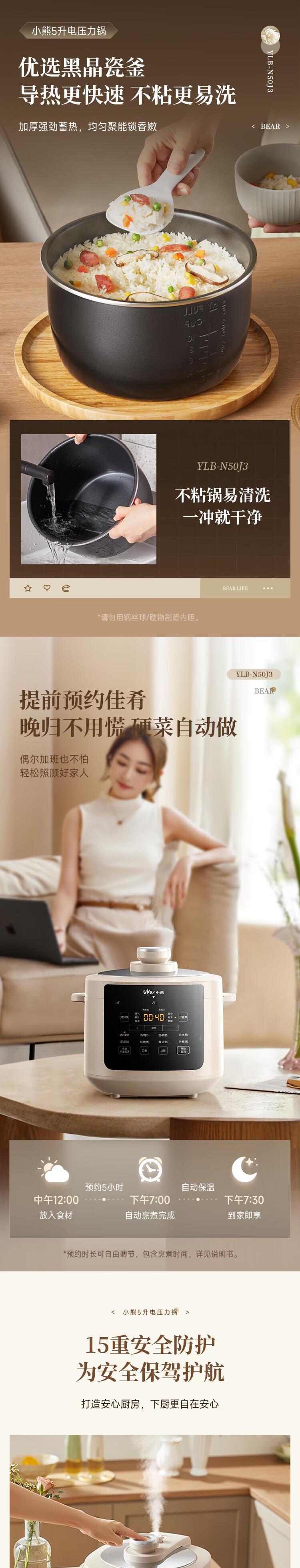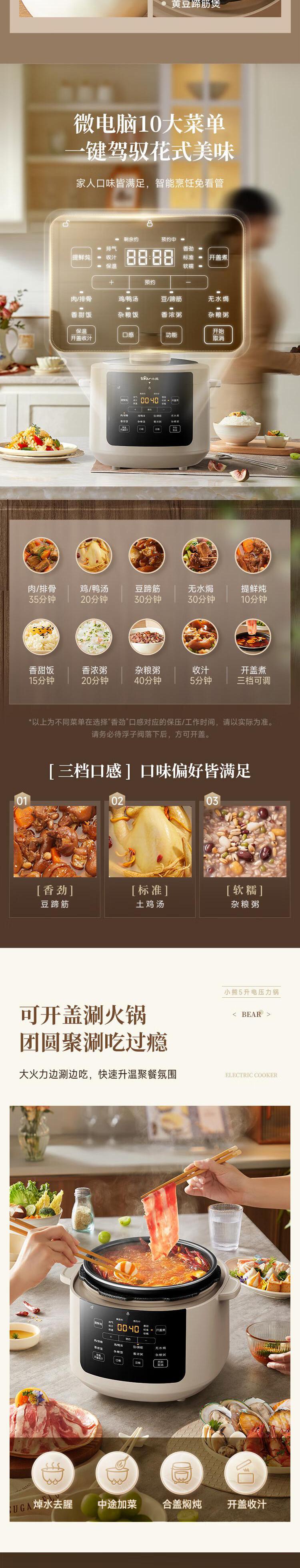 【自营】小熊(Bear)电压力锅5L大容量家用多功能电高压锅聚能黑晶瓷釜煲汤电火锅电煮锅微电脑10大菜单可开盖煮涮火锅 YLB-N50J3一锅双胆智能调压开盖收汁安全防烫