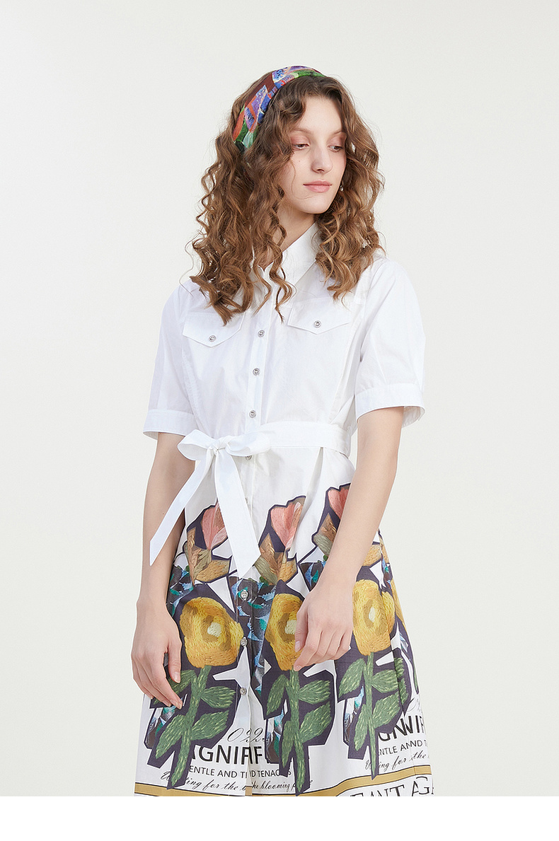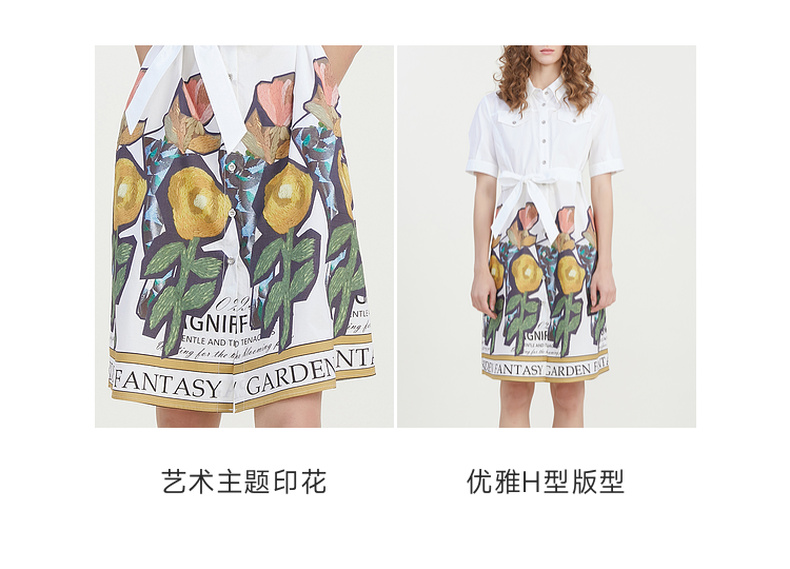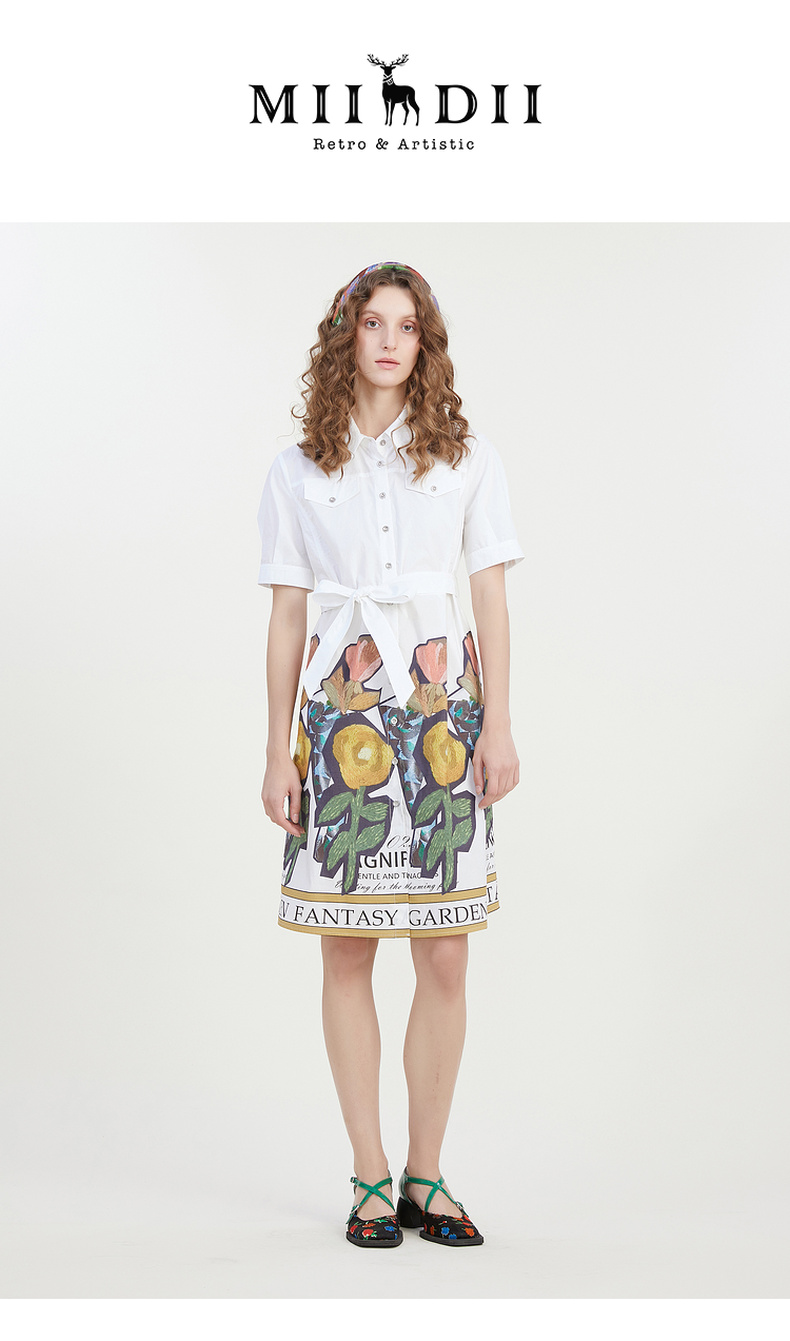 谜底复古印花连衣裙2023夏新款翻领绑带收腰中长裙短袖232ML0513