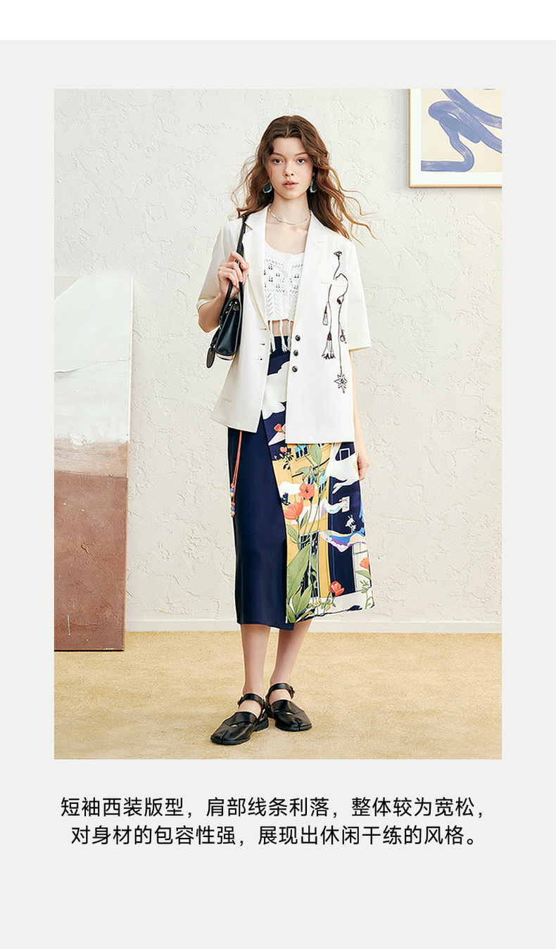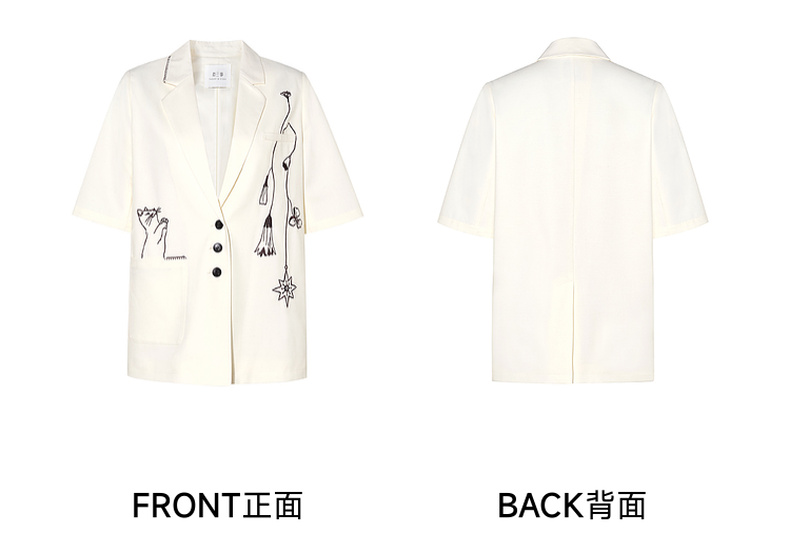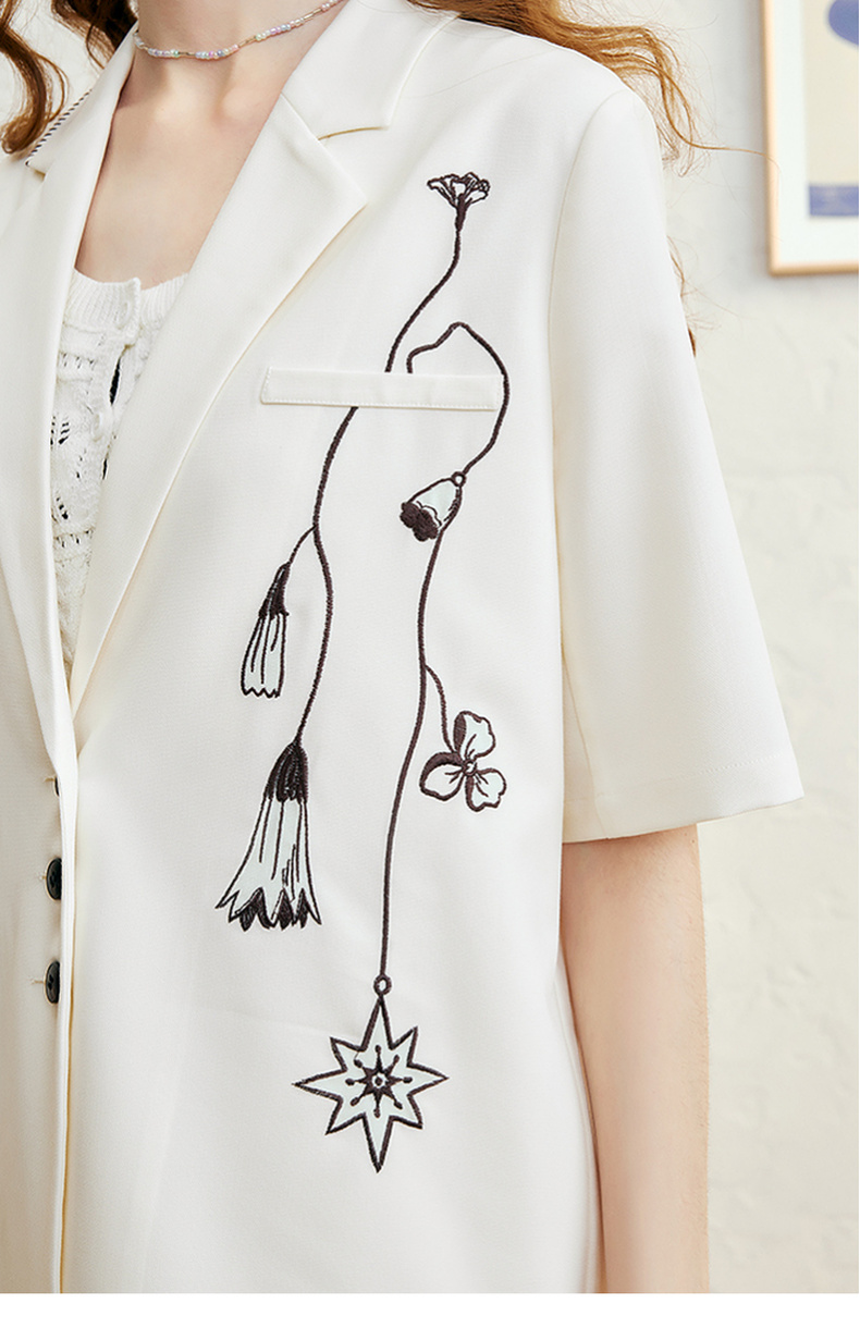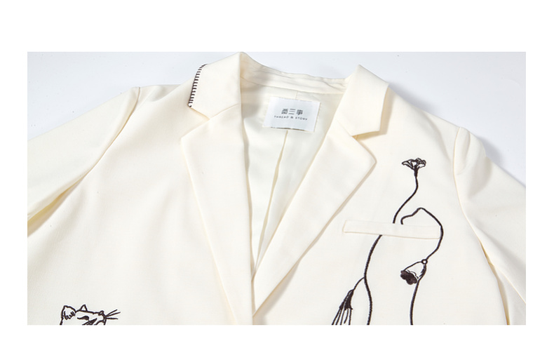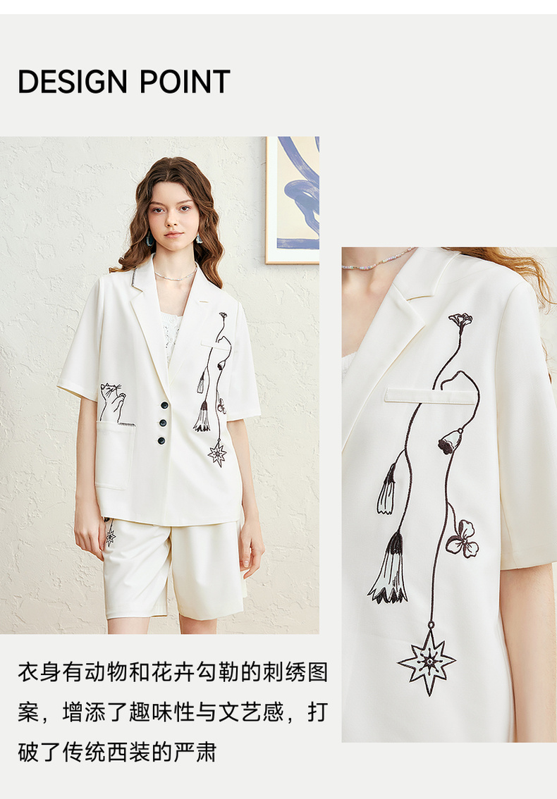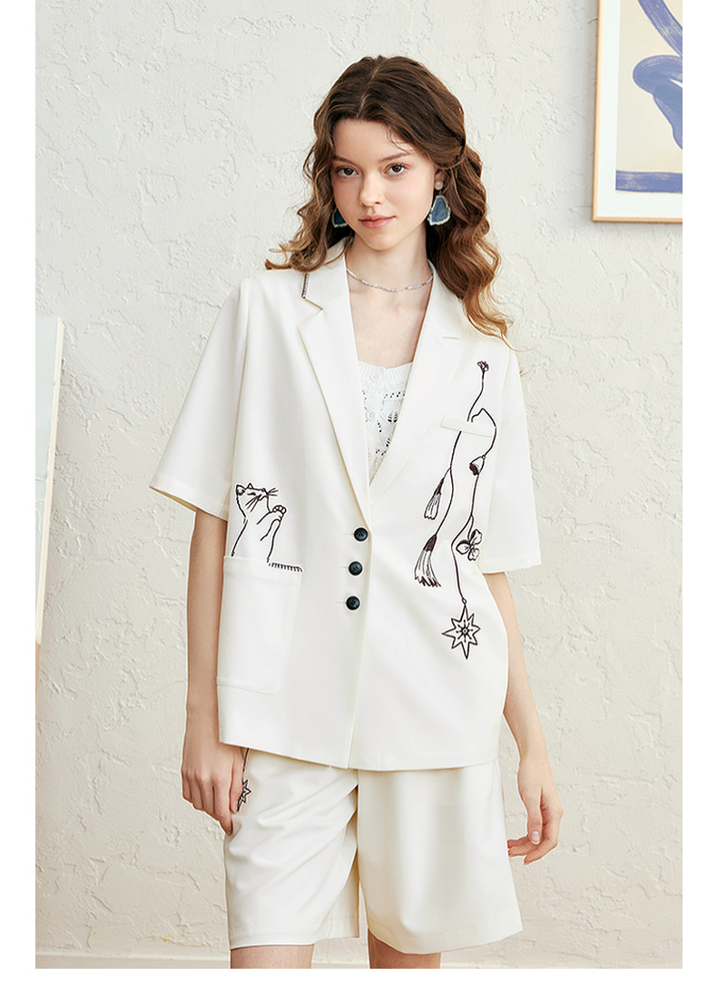 两三事 月下戏猫 2025春季新款趣味绣花短袖西装外套女宽松