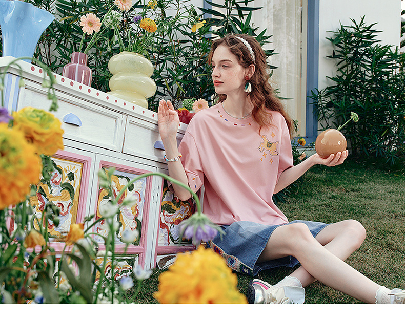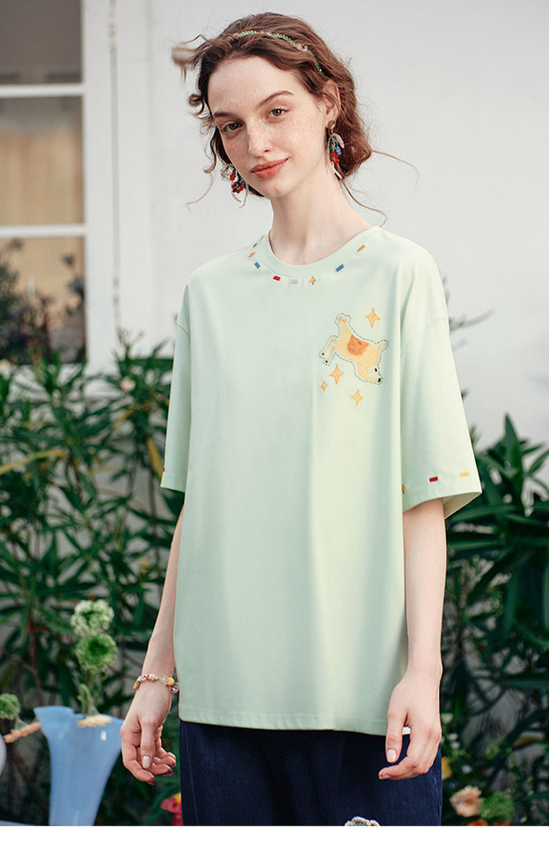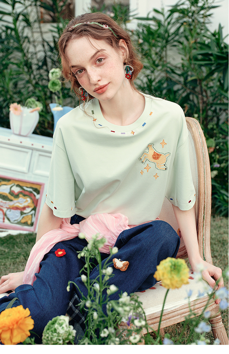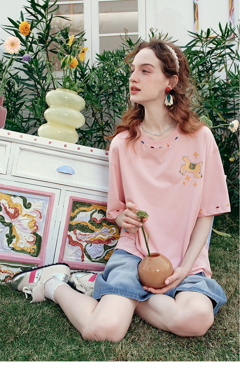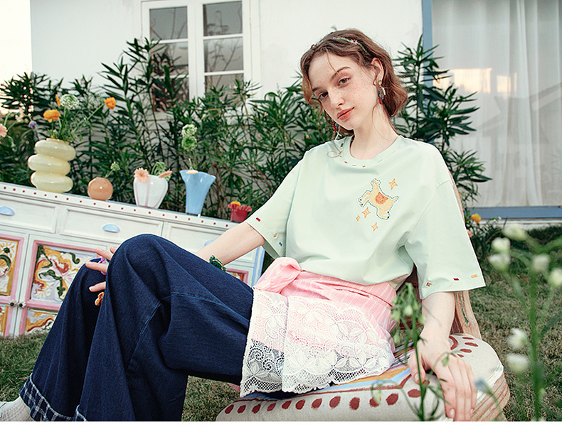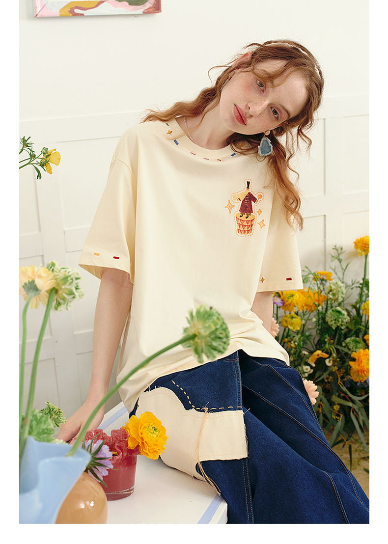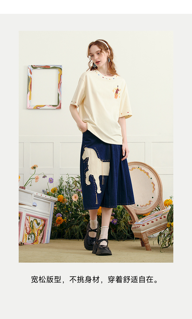 两三事 童眸启示 2025夏季新款可爱刺绣短袖棉质t恤女宽松