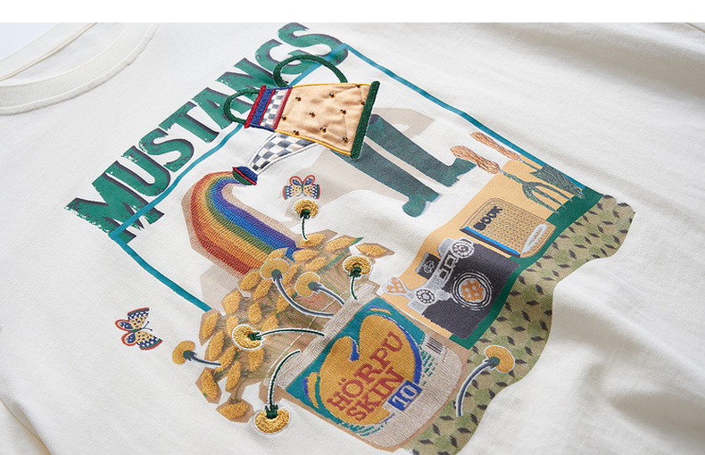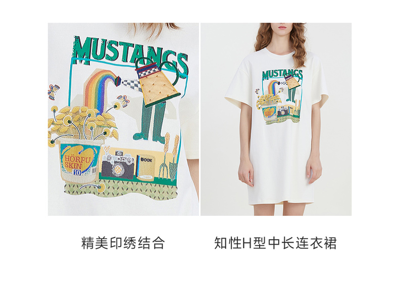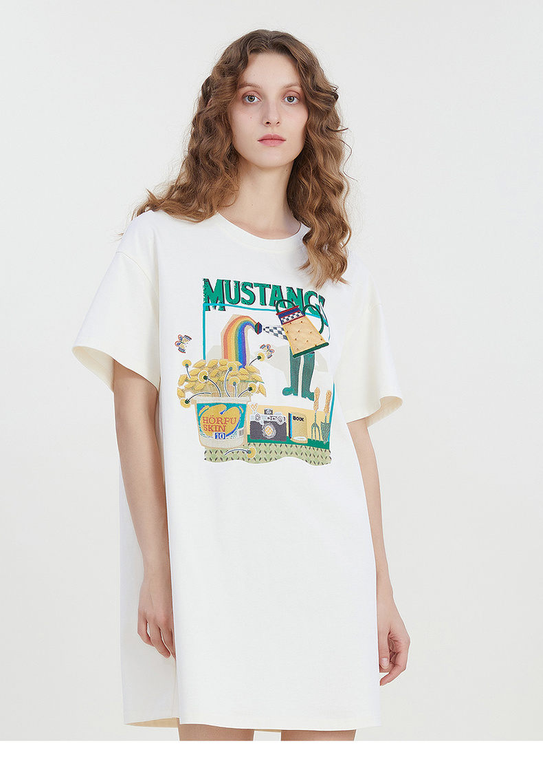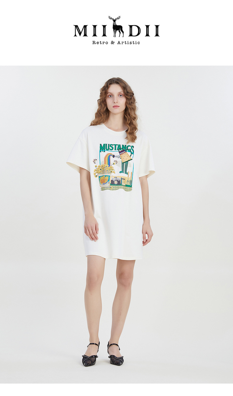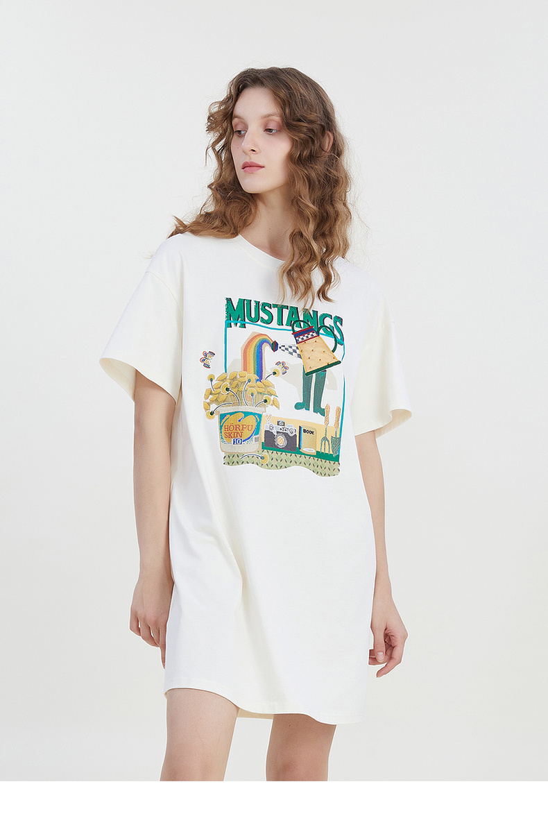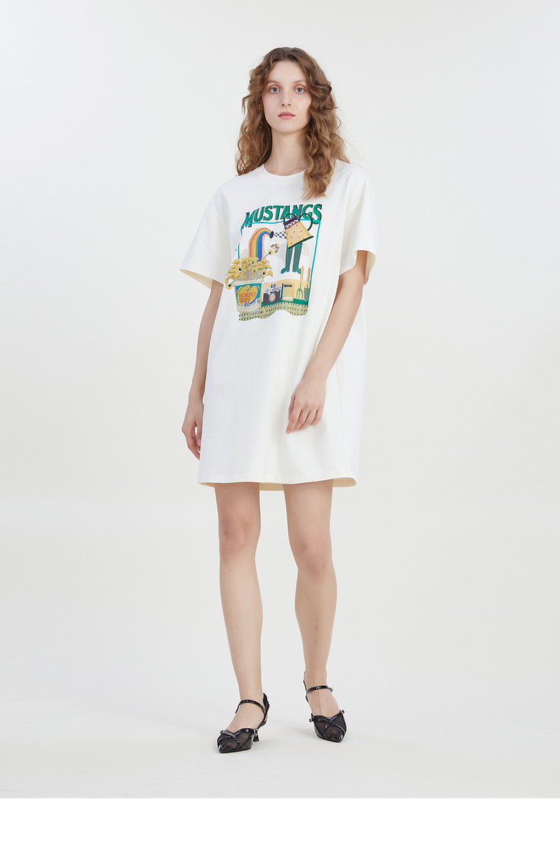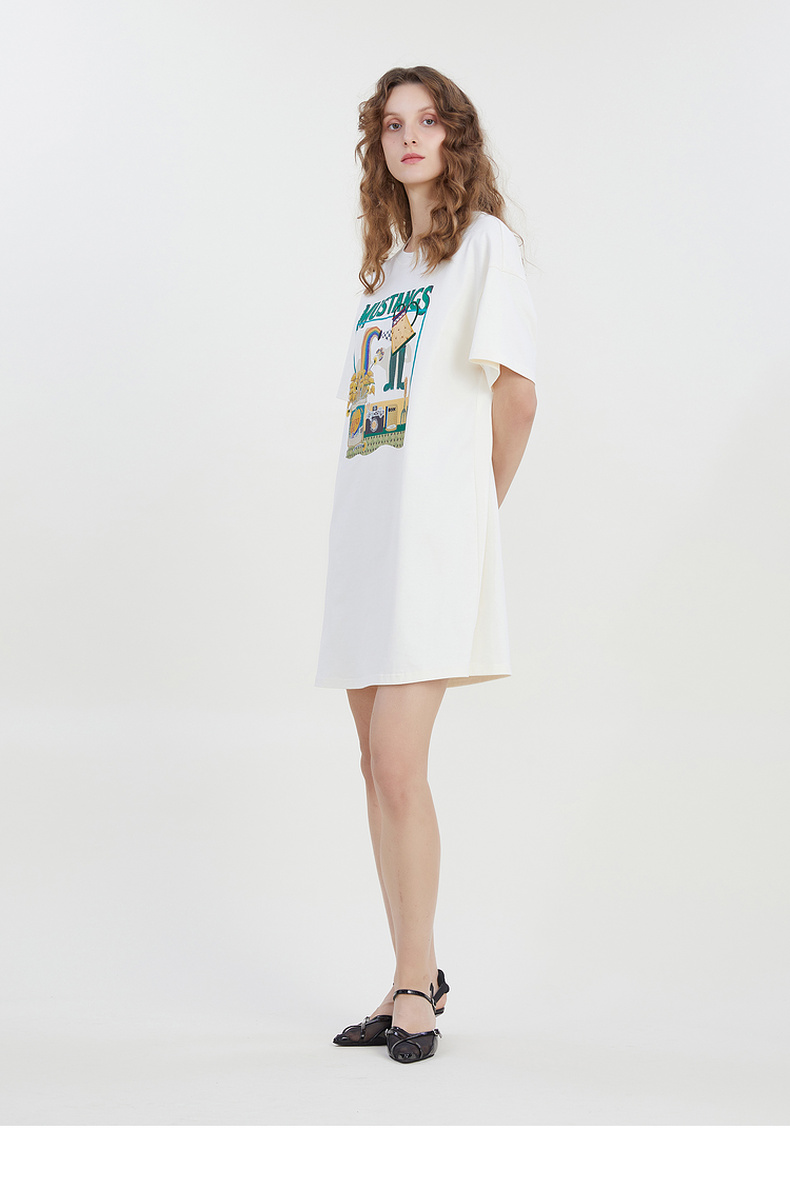 谜底宽松印花中长款连衣裙短袖2023夏新款圆领简约T恤裙232ML0587