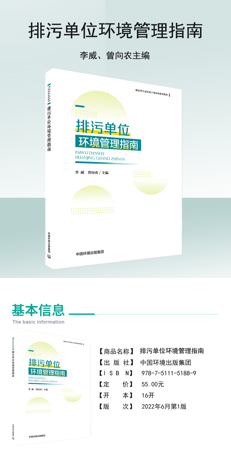 本书从排污单位环境管理的角度出发,系统梳理了我国生态环境管理理念、生态环境主管部门监督管理制度和排污单位环境管理要求,旨在提高环境管理人员的生态环境保护意识,为环境管理部门及排污单位的环境监督管理提供专业技术指导。本书可作为生态环境部门干部培训及排污单位环境管理技术指导用书,也可作为生态环境类专业或相关专业学生教材,可供生态环境服务机构人员及相关企事业单位环境管理人员学习参考。 作者简介:李威,长期从事生态环境知识科普工作,曾主导建设湖南省环境保护与教育科普馆,主持并参与省、市级生态环境保护、科普宣传等课题10余项,先后发表论文20余篇,出版生生态环境科普读本9本,获实用新型专利授权8项。