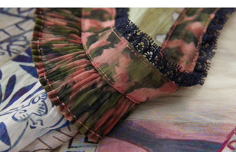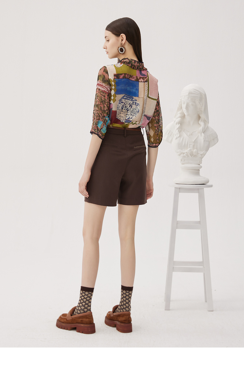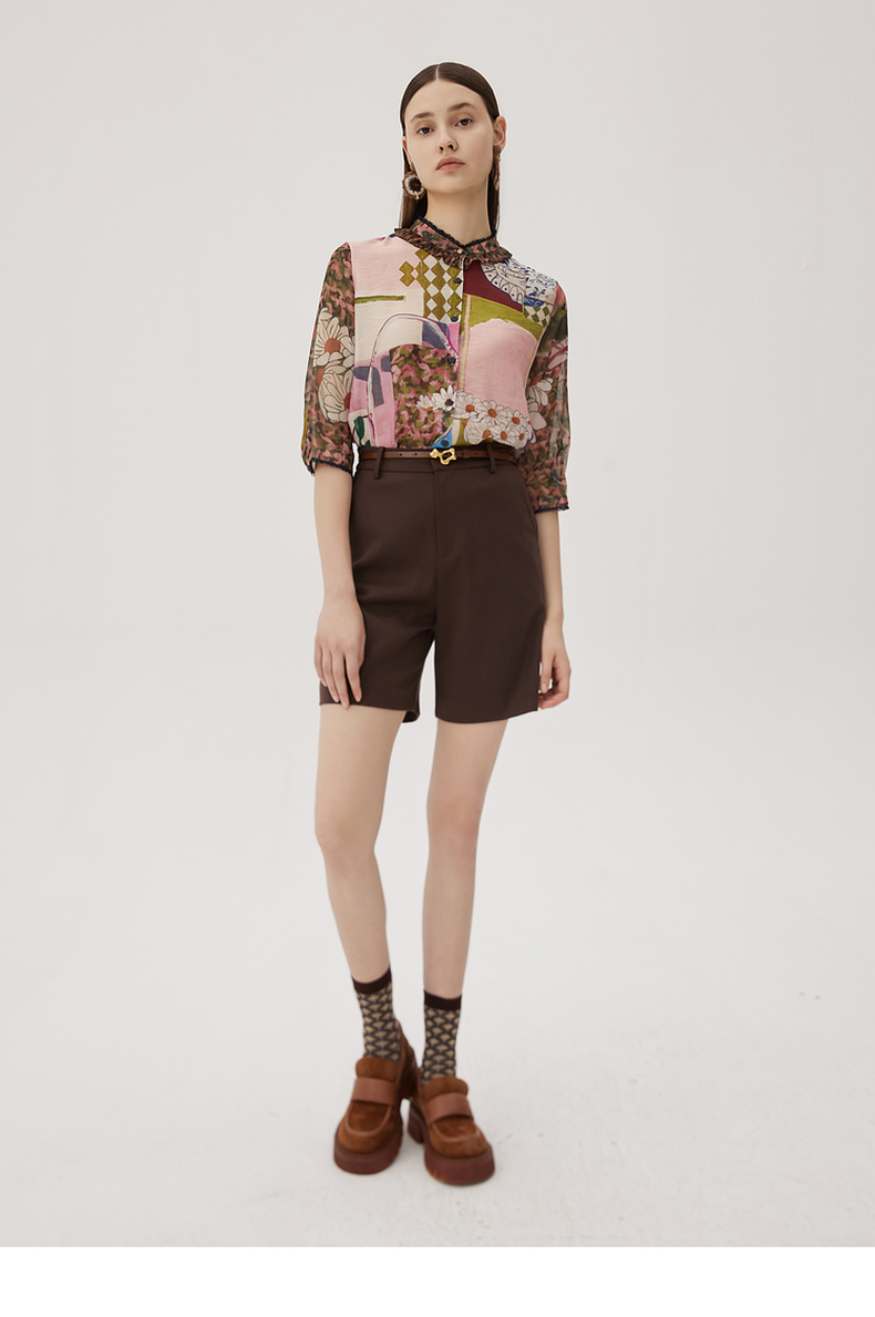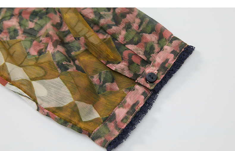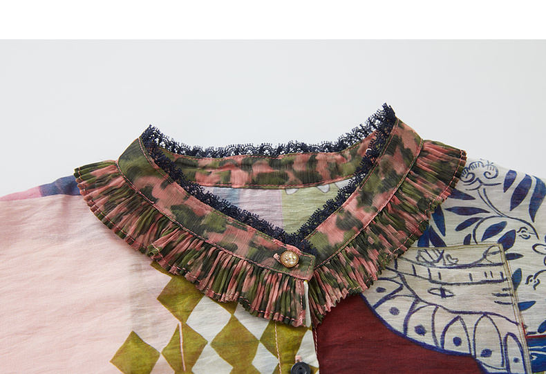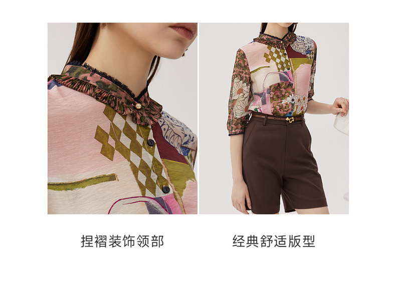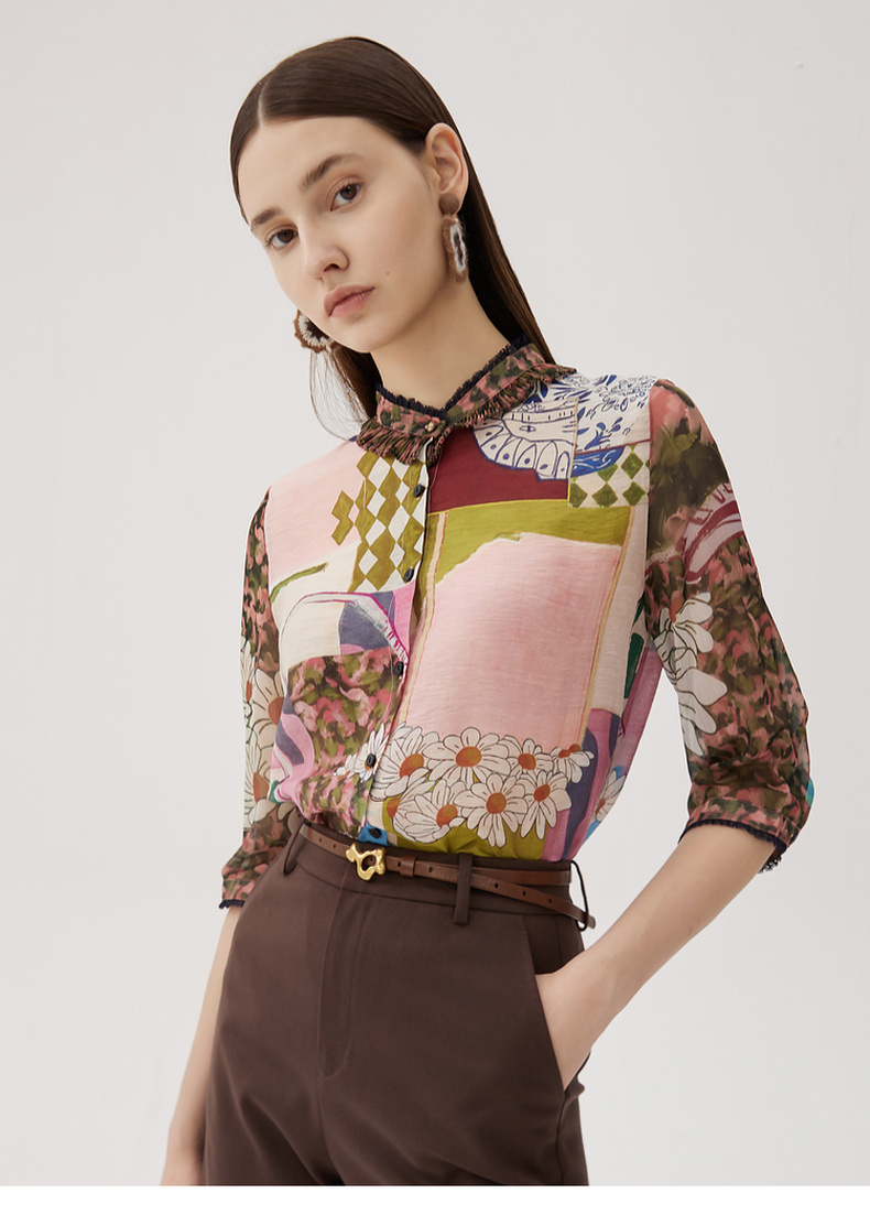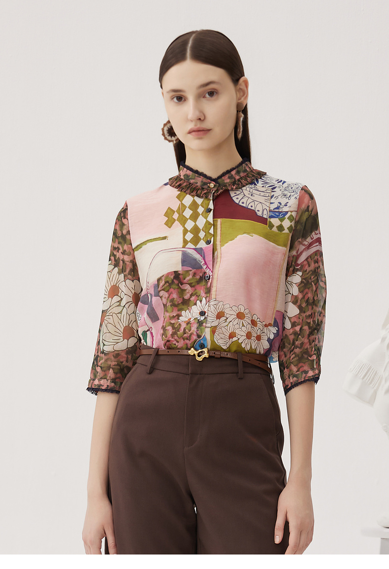 谜底花色衬衫七分袖女2024夏季款复古田园风荷叶领衬衣247MC5001