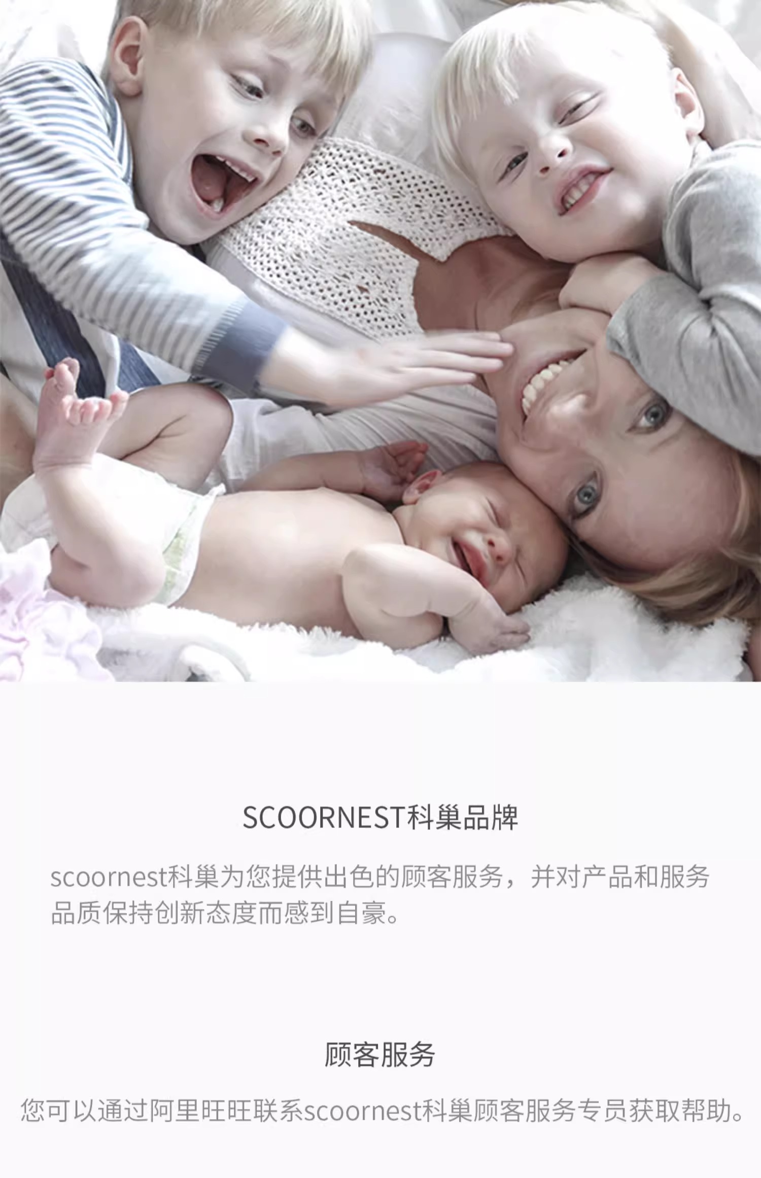 - Scoornest始终秉承给每一位宝宝送去科学的、关心的、创新的成长体验,通过提供商品和服务,使顾客形成守护、发展、巩固这种弥足珍贵的亲情的爱。