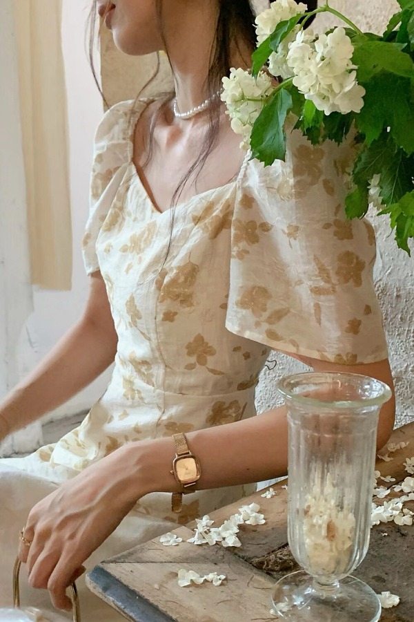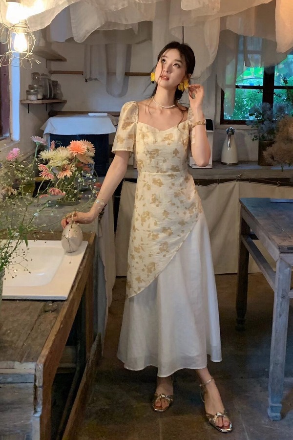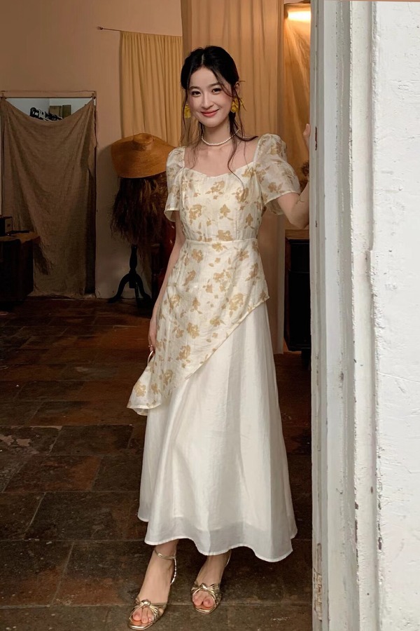 ELLA JADE 方领泡泡袖碎花不规则连衣裙 20856