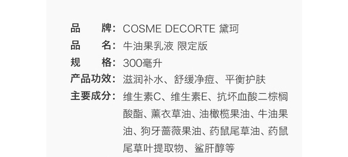 口碑炸裂断货款,高颜值的实力派!运用了被称为「森林的黄油」营养价值非常高的牛油果,小分子渗透力更好,吸收强!强!强!紫苏水CP,黛珂家的标准明星搭配,【先乳后水】效果绝对1+1>2,使肌肤保持健康平稳