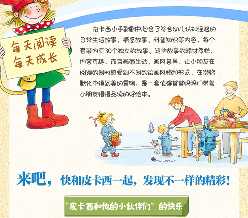 皮卡西小手翻翻书内容丰富多彩,画风精美多样,内容涵盖幼儿生活的多个方面,价格经济实惠,是家长喜欢、幼儿爱读的高品质便携绘本