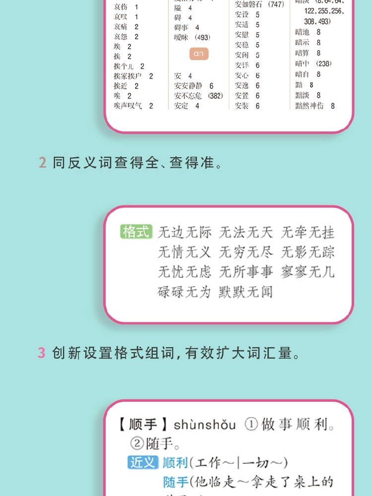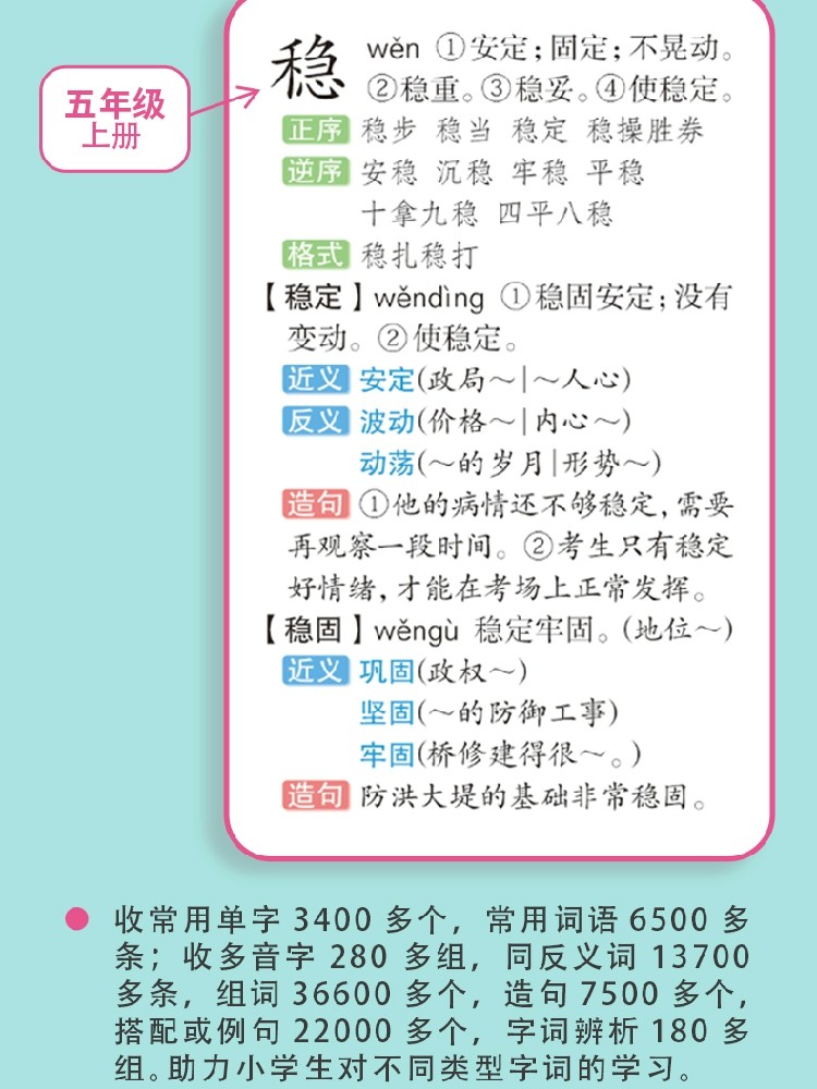 收多音字 280多组,同义词、近义词、反义词 13700 多条,组词 36600多个,造句 7500 多个,字词辨析 180 多组,助力小学生对不同类型字词的学习。