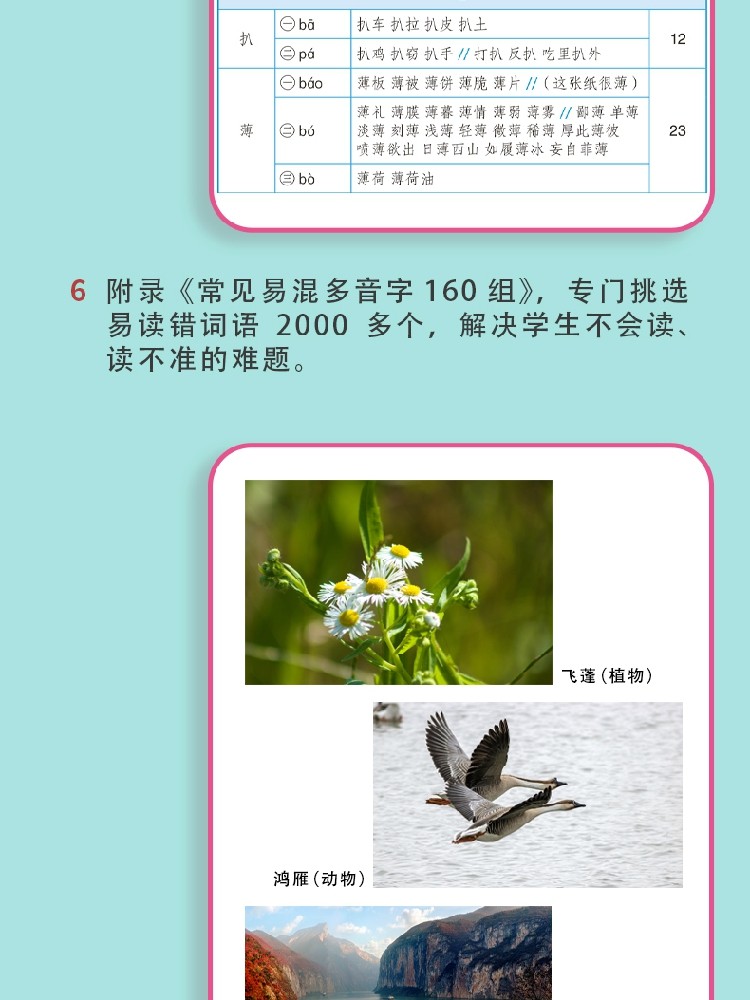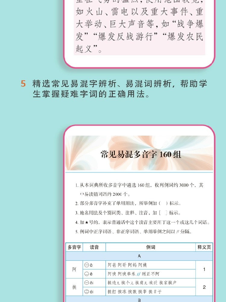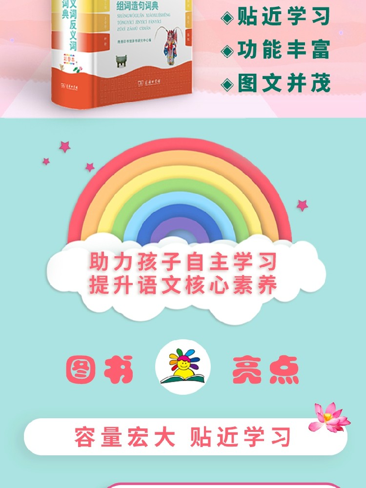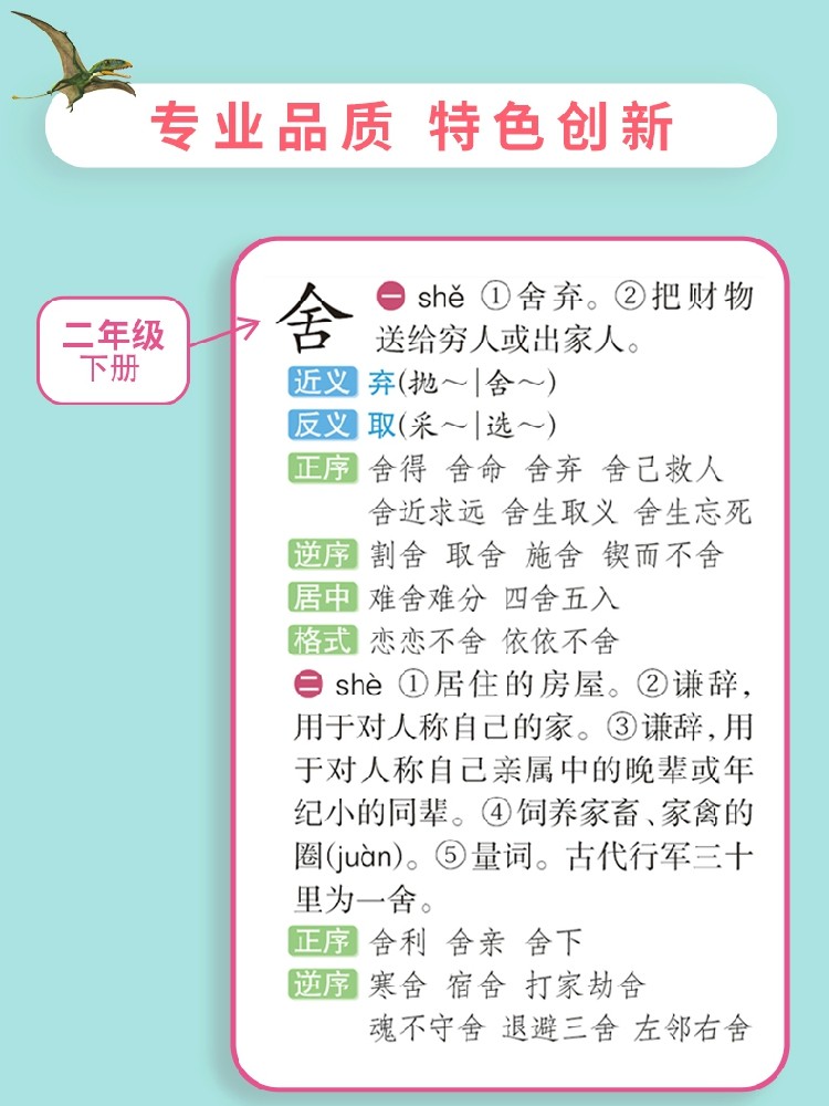 设立注音、释义、同义词、近义词、反义词、组词、造句、搭配、易混字辨析、易混词辨析、易读错词语、常见易混多音字等10多种功能,助力小学生提升语文核心素养。
