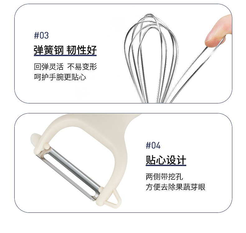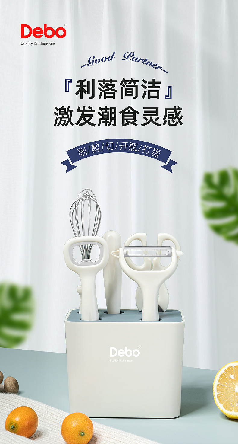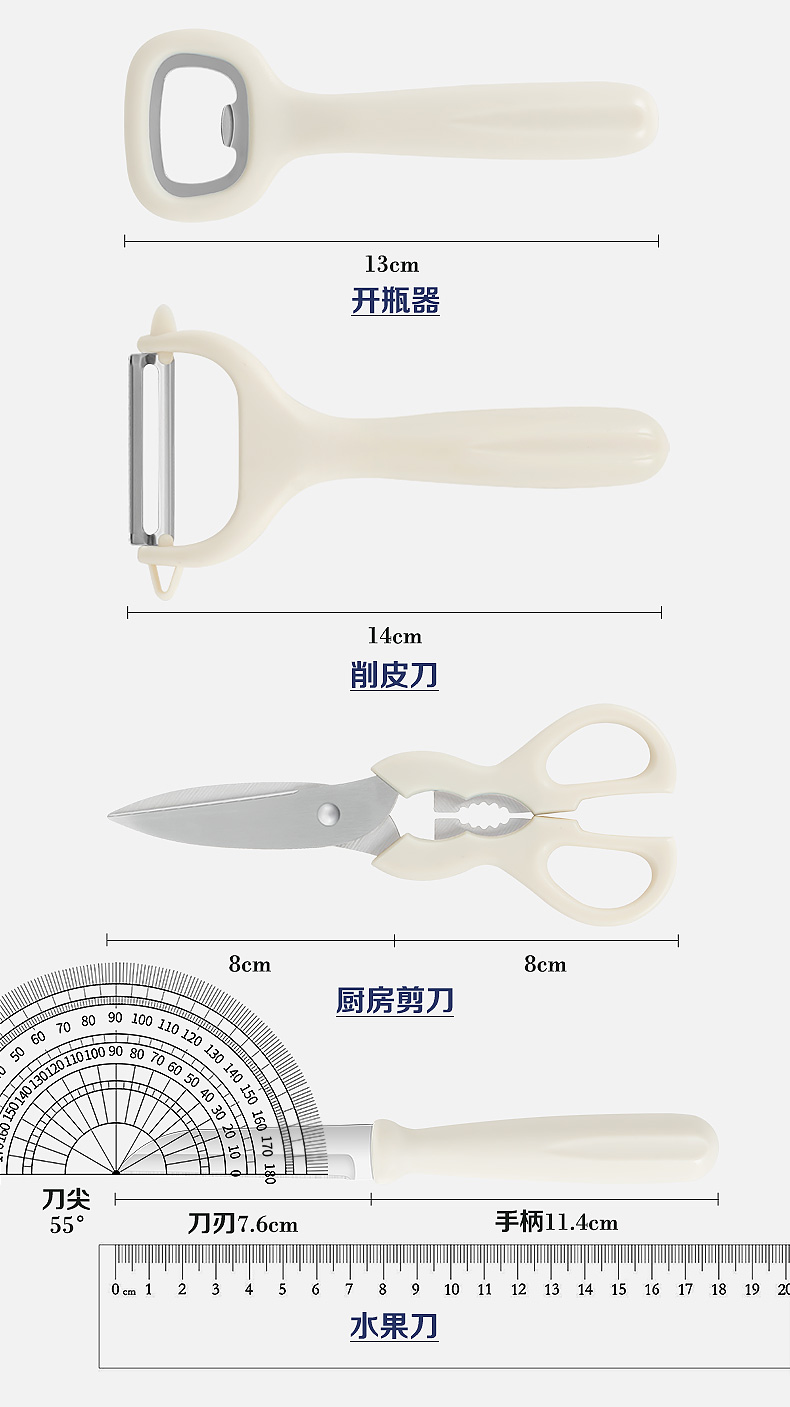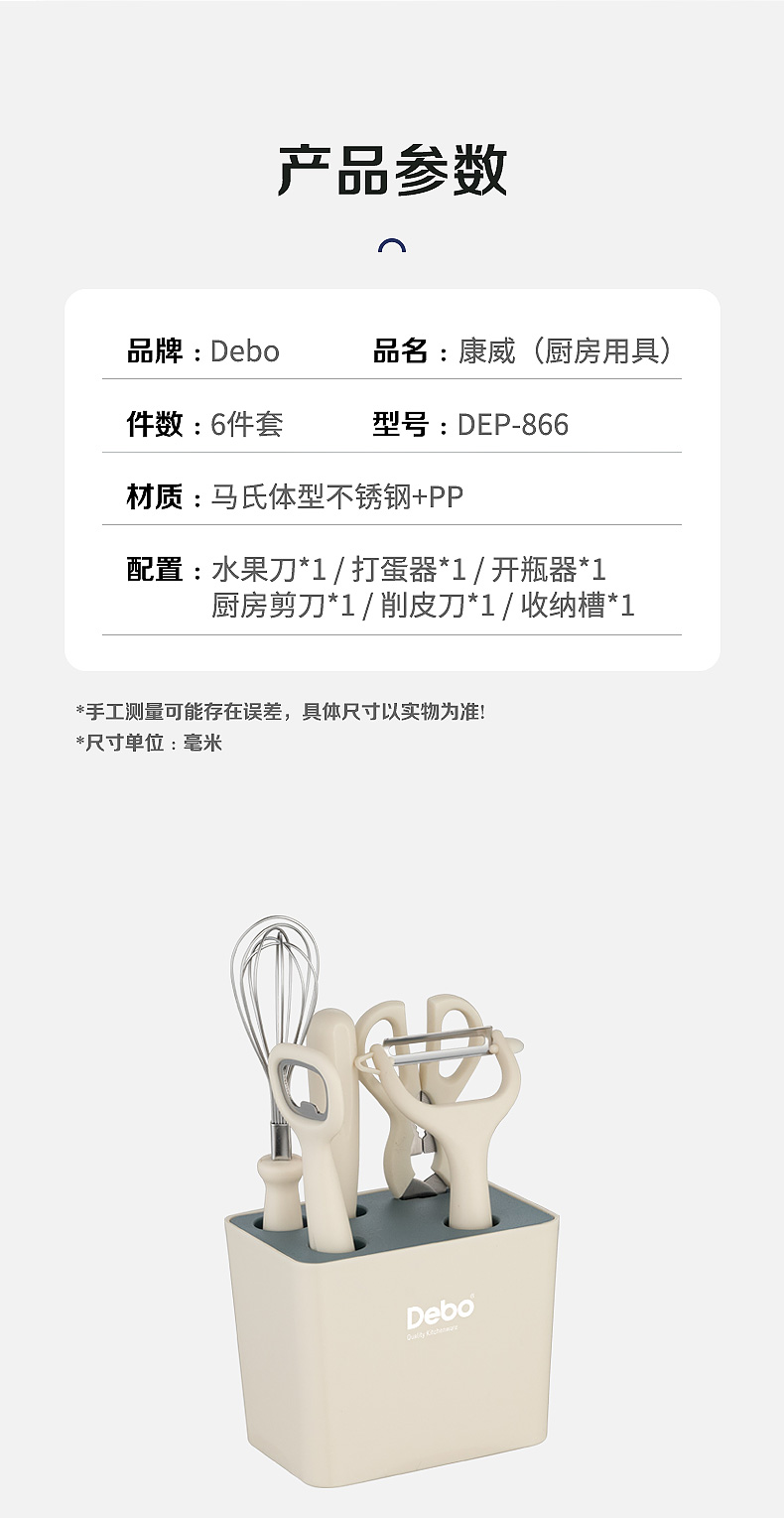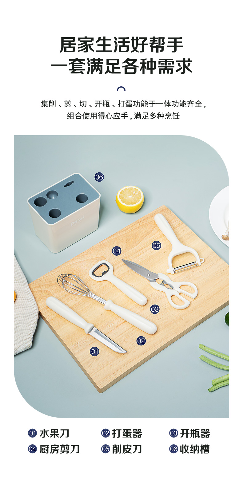 配置:打蛋器*1、开瓶器*1、瓜刨*1、厨房剪*1、水果刀*1、收纳槽*1