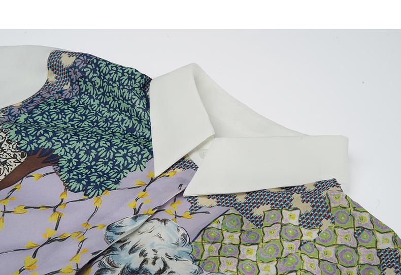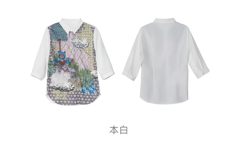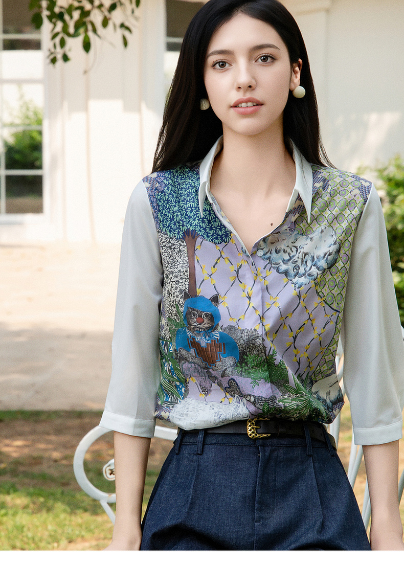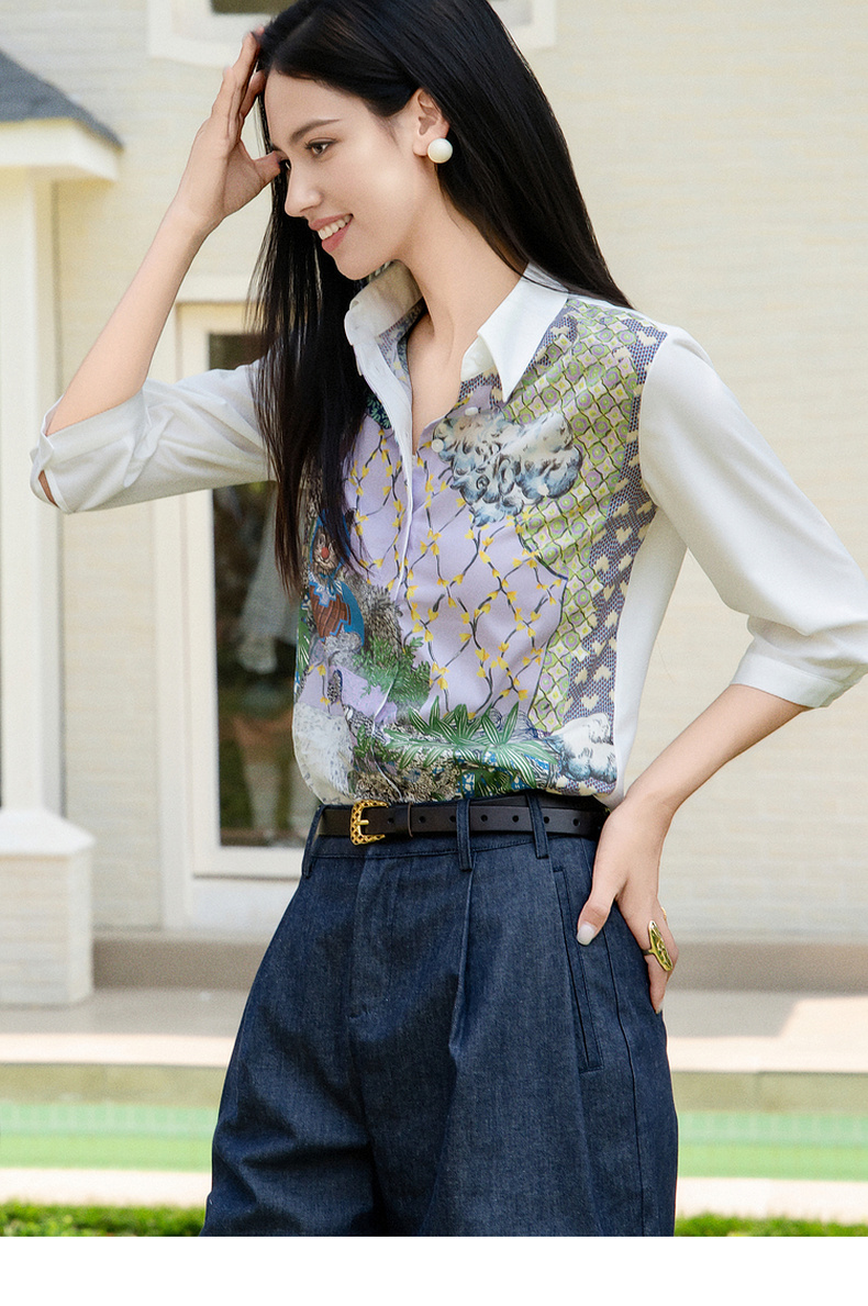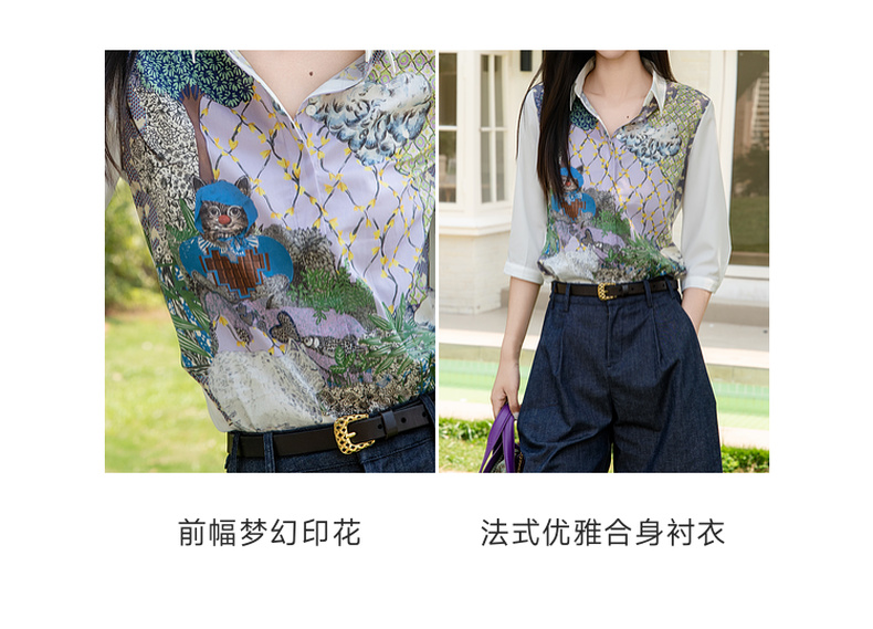 谜底花色衬衫七分袖女2025夏季新款通勤风拼接印花衬衣256MC6286
