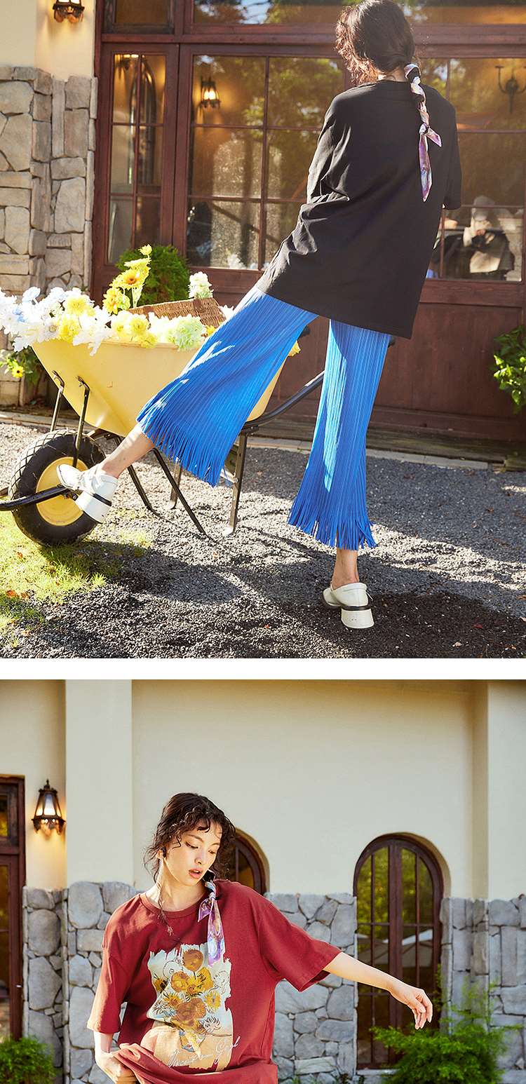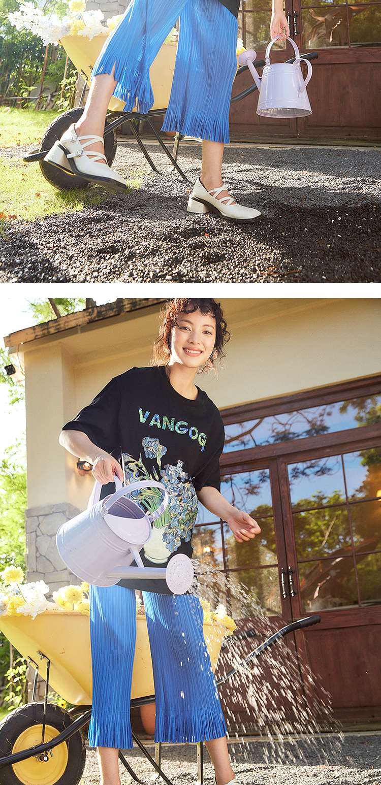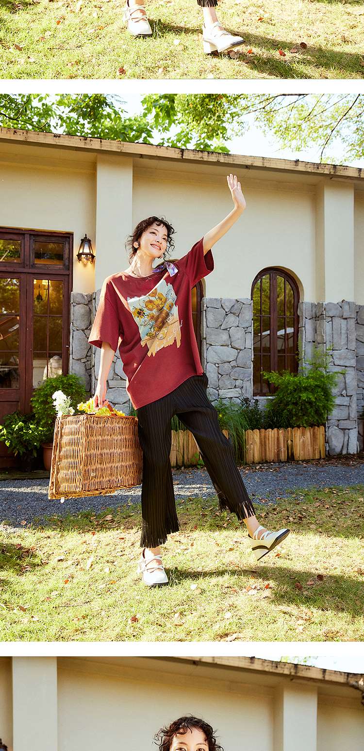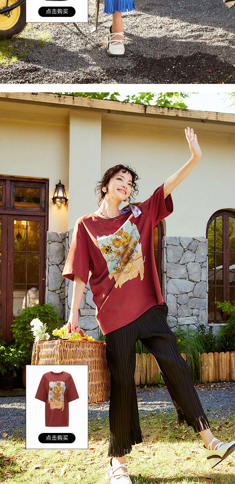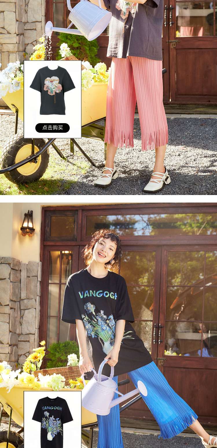 两三事梵高艺术花也谈情夏季压褶拼接印花两面穿雪纺衫女