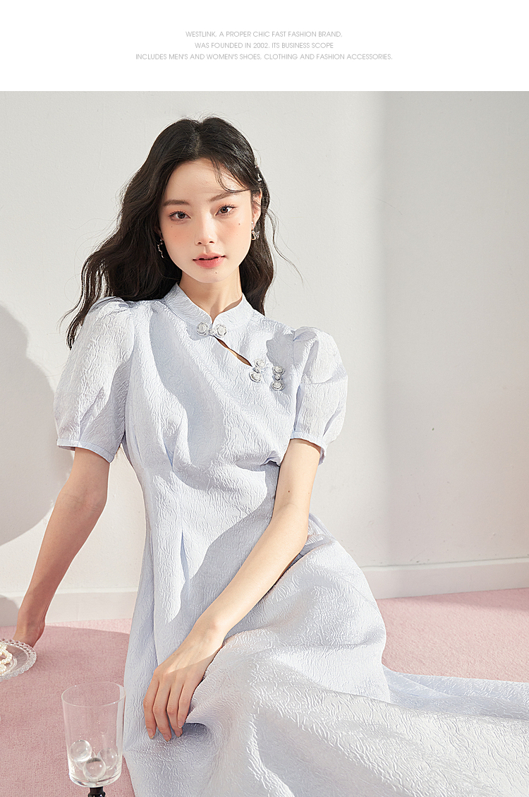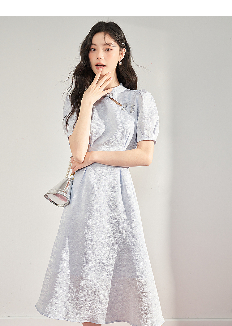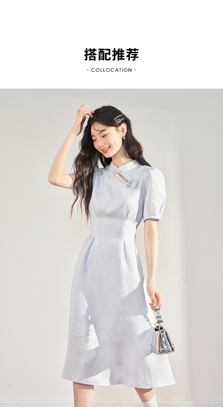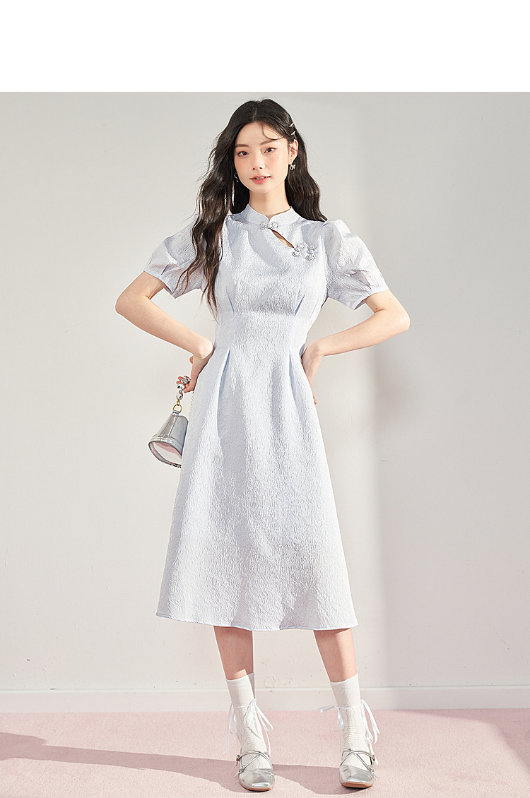 复古国风改良旗袍裙女夏季新中式长款浮雕泡泡袖连衣裙女V0930756