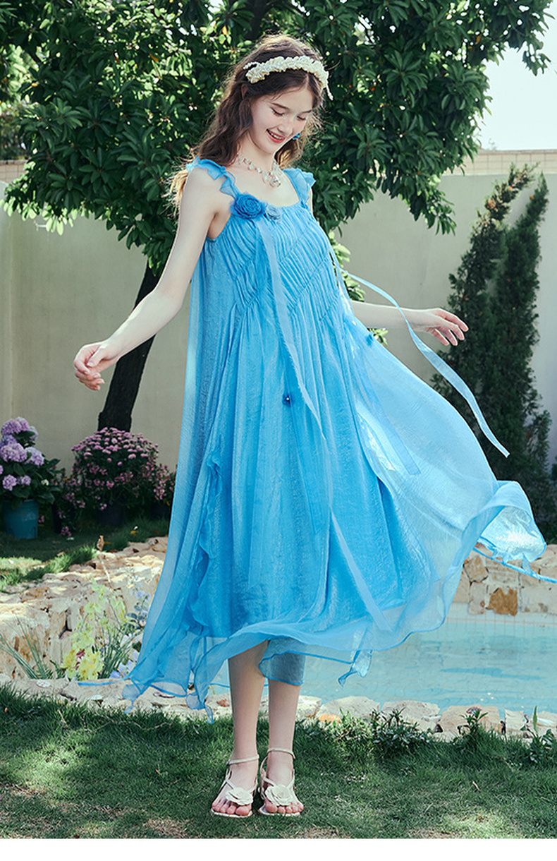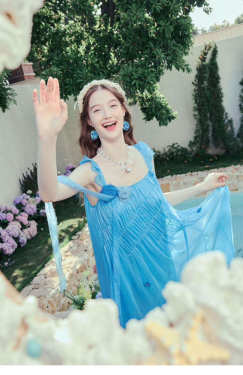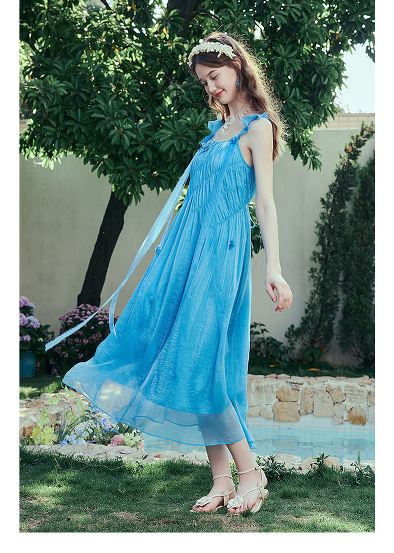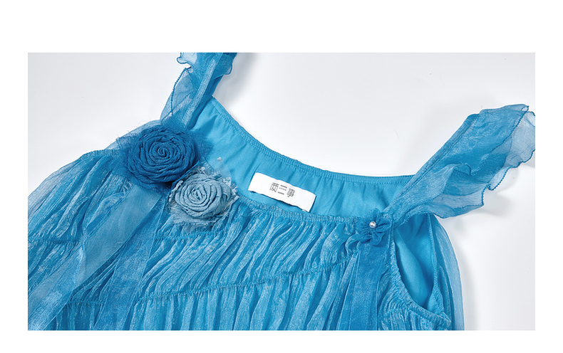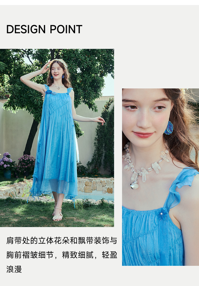 两三事 海风传说 2025夏季新款甜美立体花朵褶皱吊带裙飘逸连衣裙