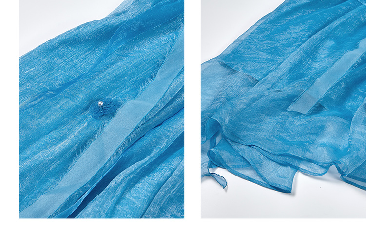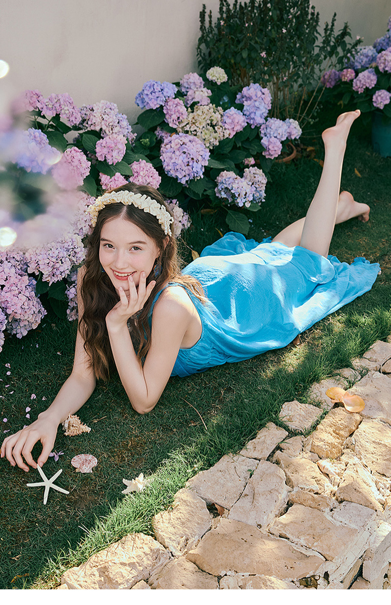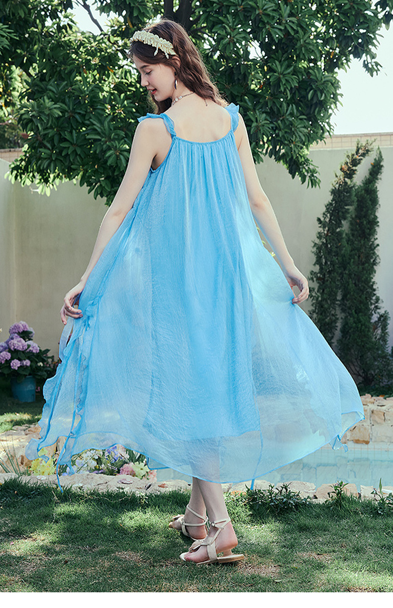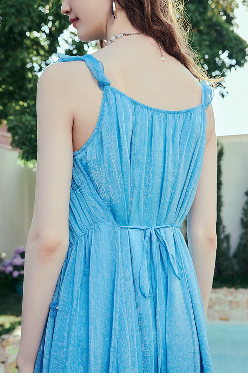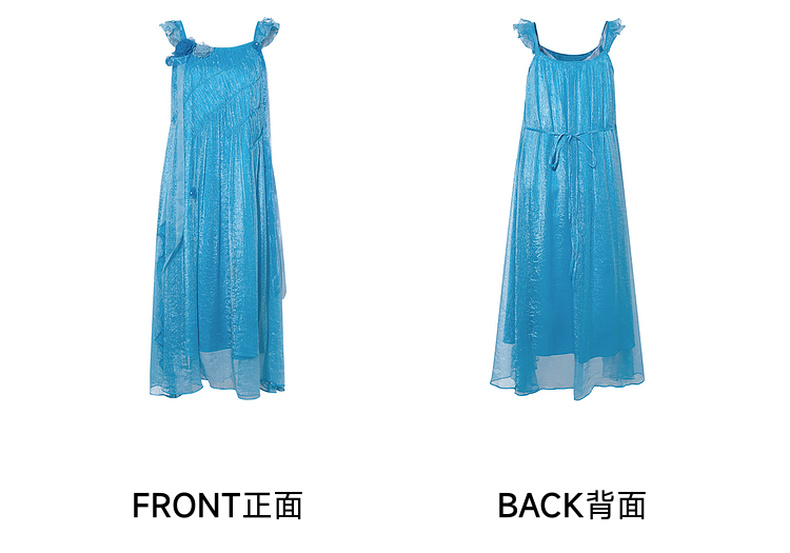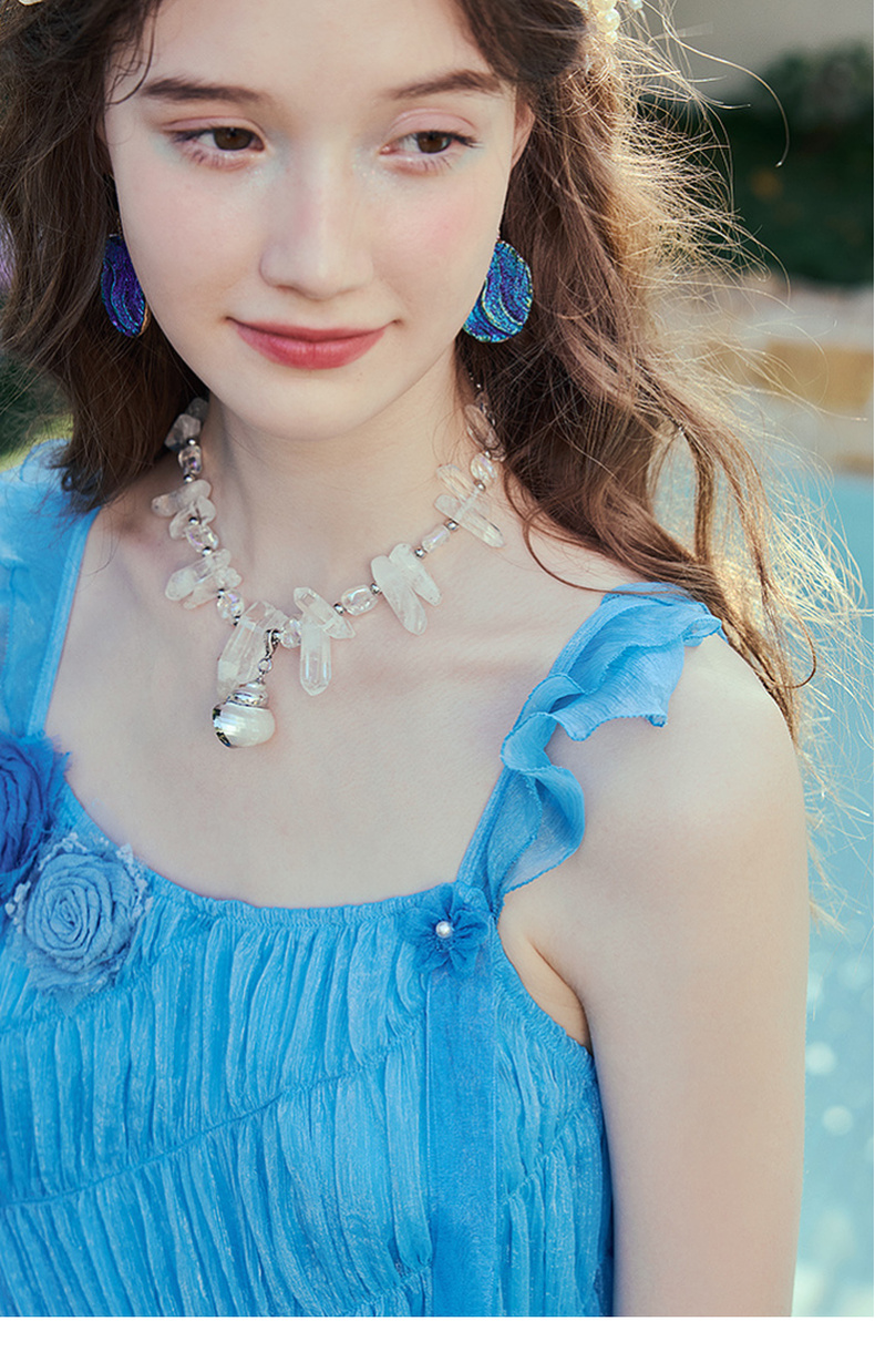 两三事 海风传说 2025夏季新款甜美立体花朵褶皱吊带裙飘逸连衣裙