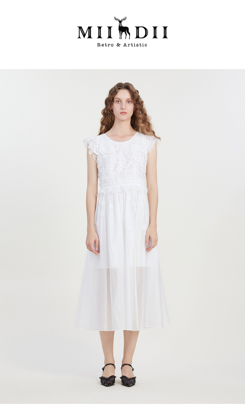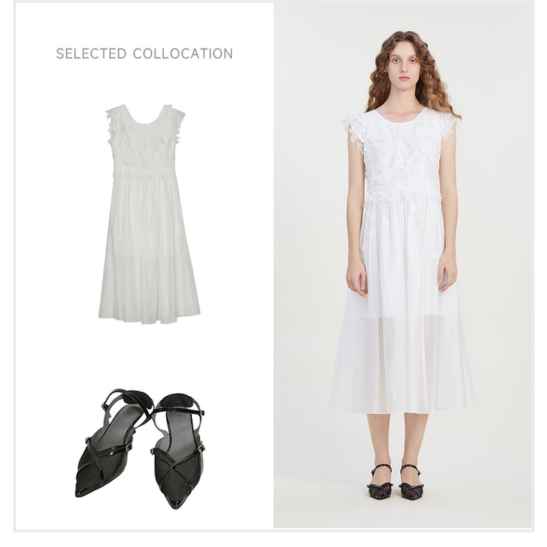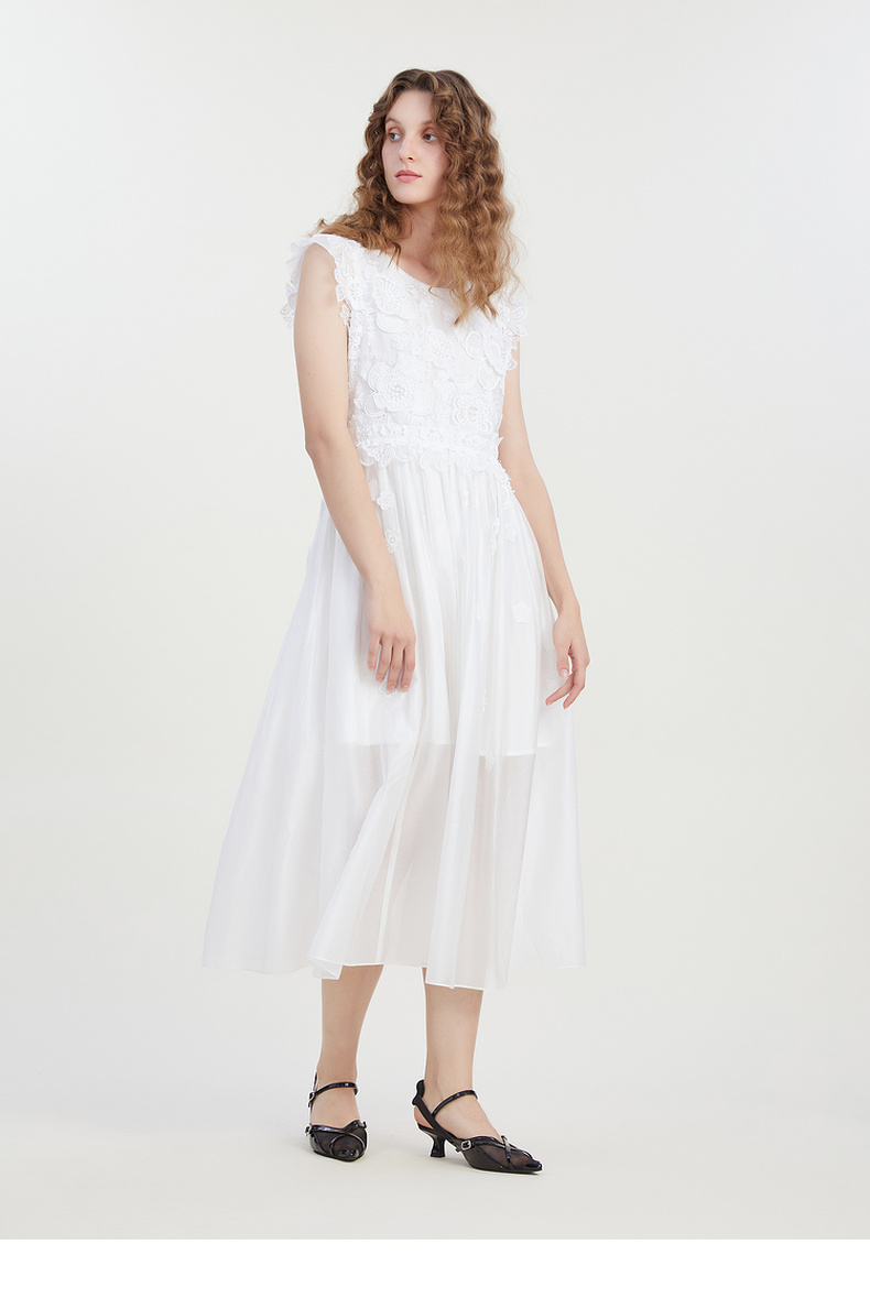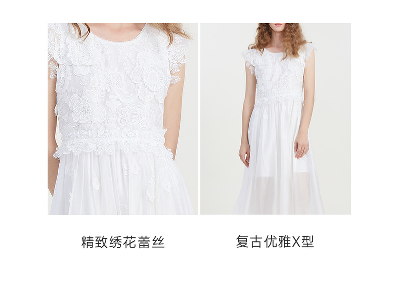 谜底气质花边连衣裙2023夏季新款圆领立体花朵修身长裙232GL0674