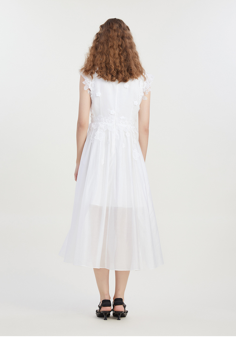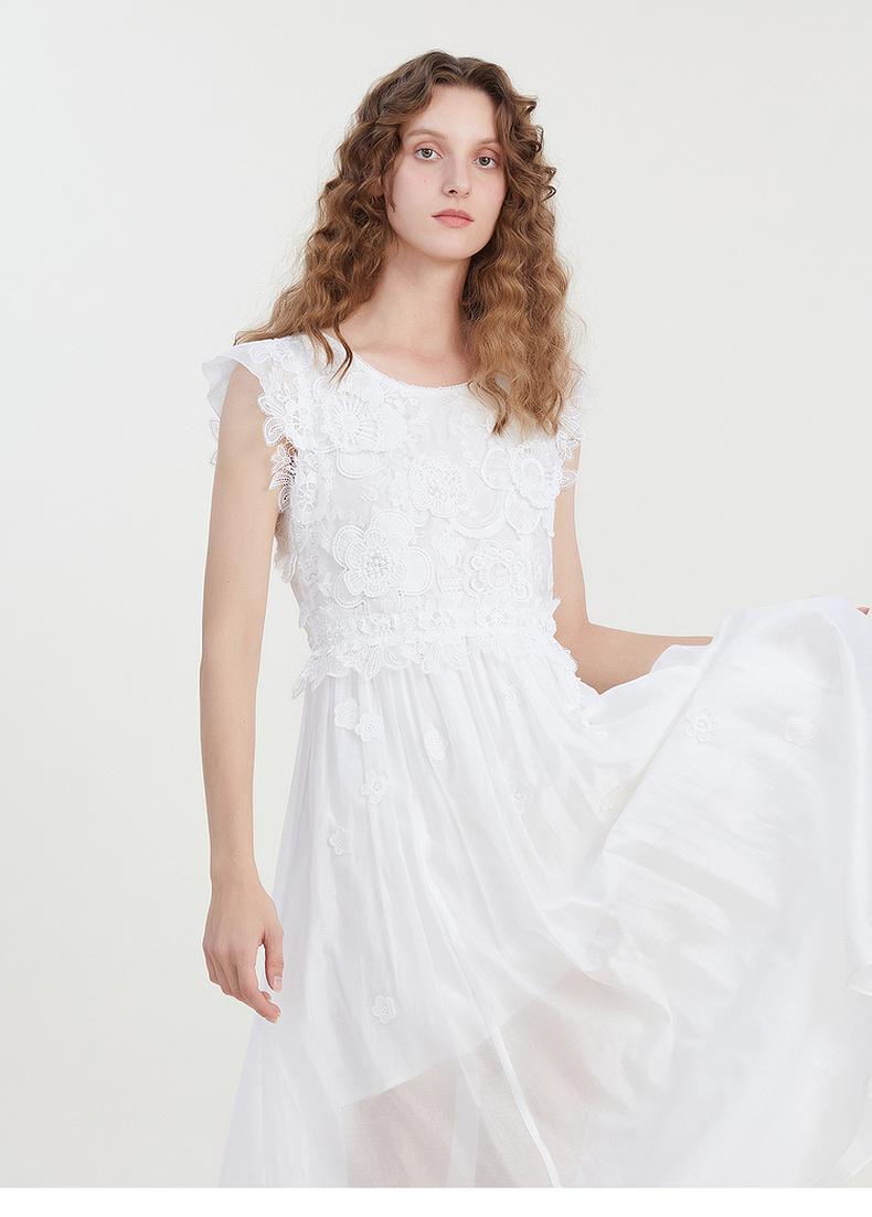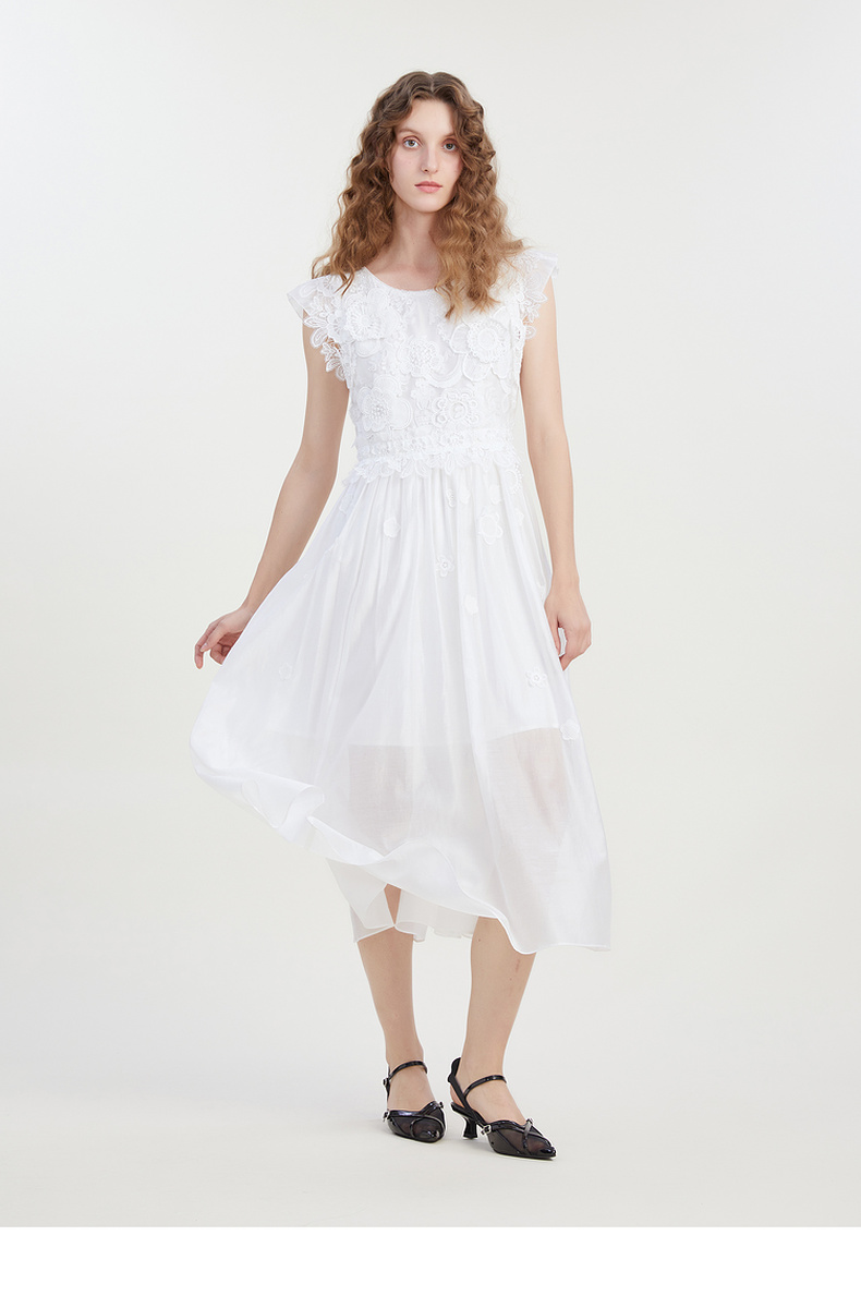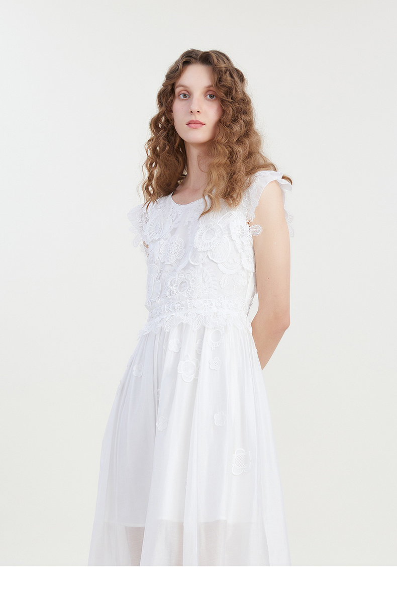 谜底气质花边连衣裙2023夏季新款圆领立体花朵修身长裙232GL0674