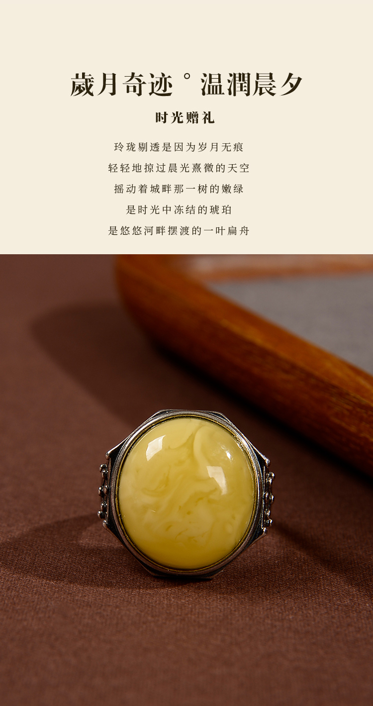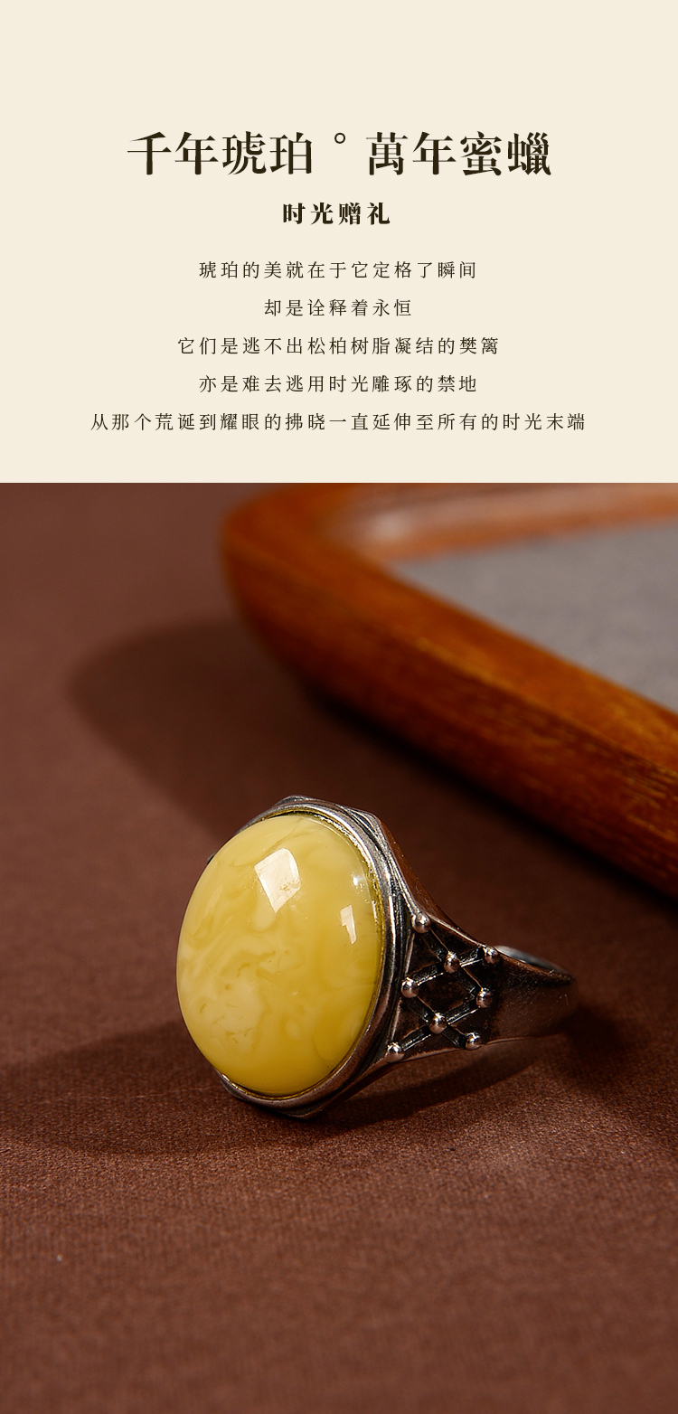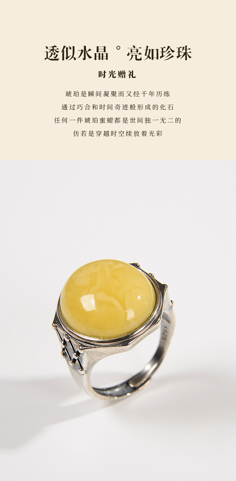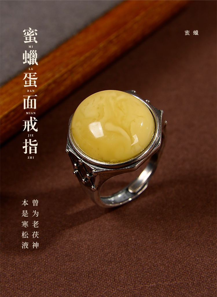 KP005【云赏珠宝】天然蜜蜡花蜡大蛋面925纯银戒指