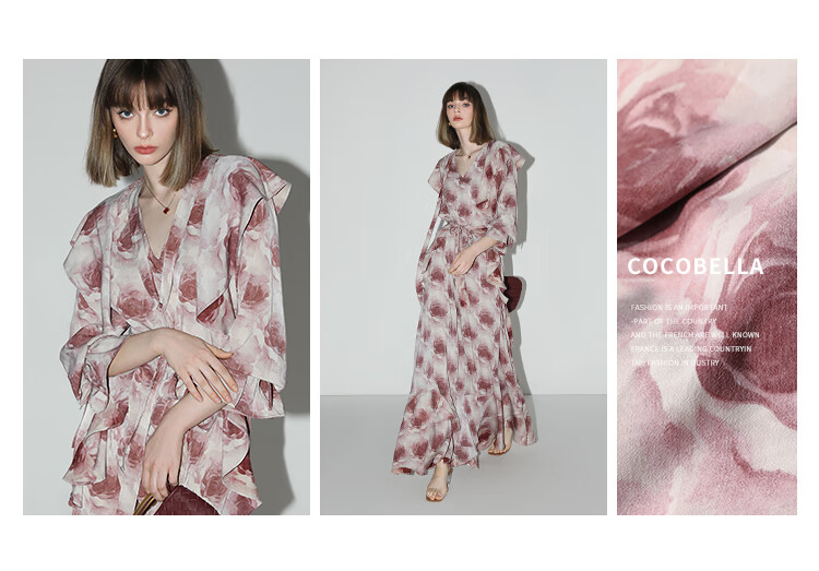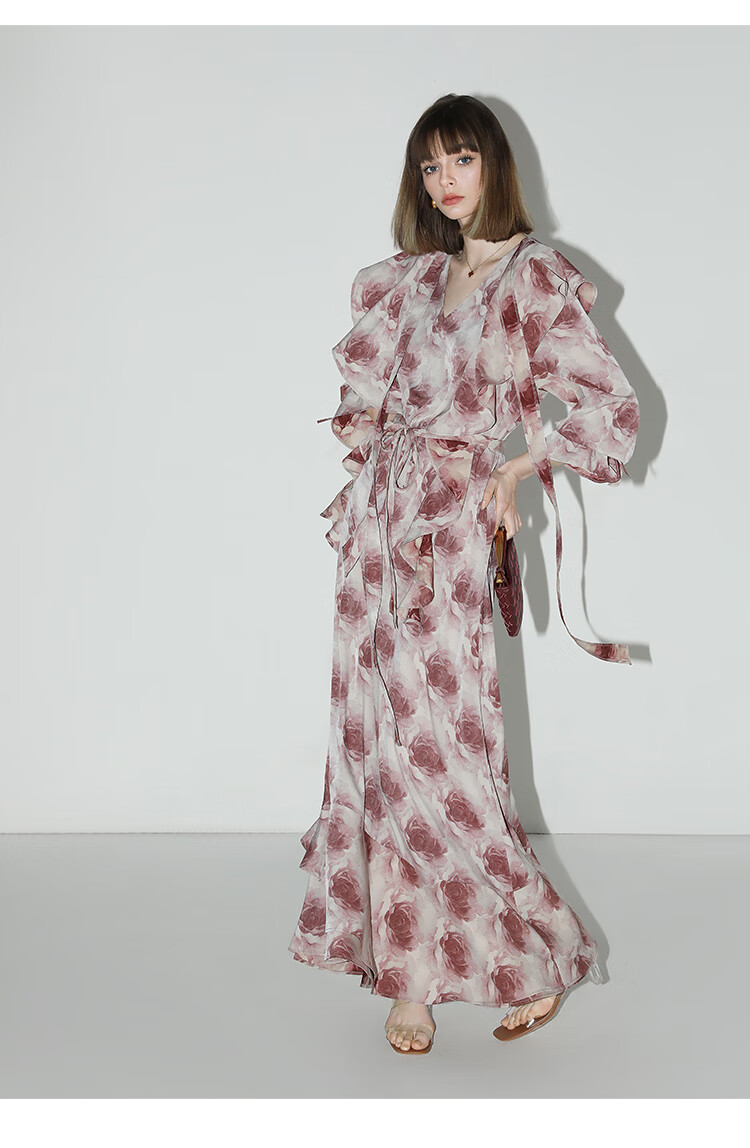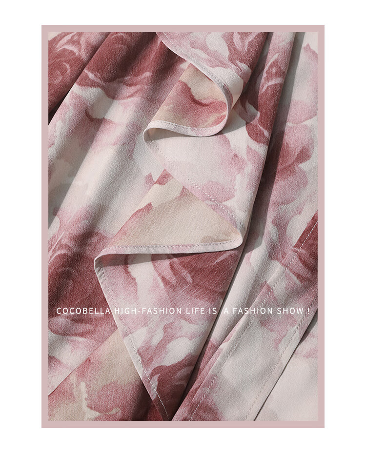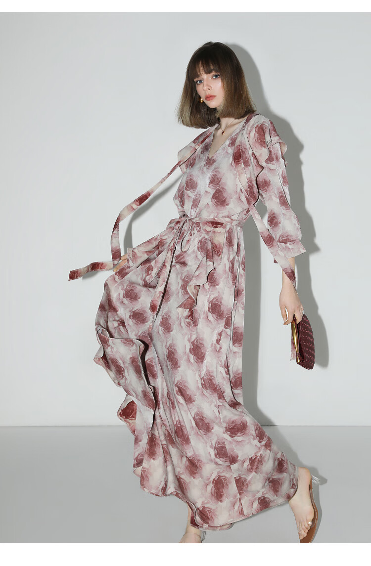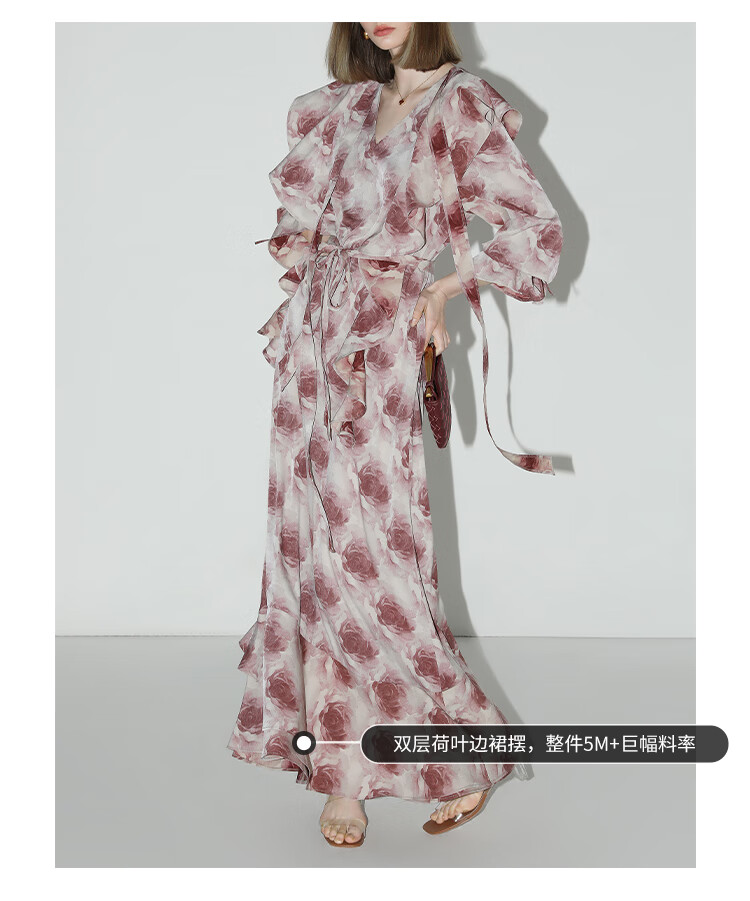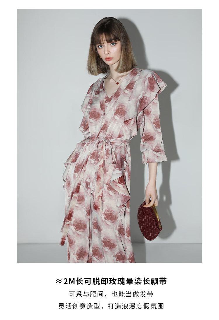 【限时秒杀】COCOBELLA[4米+用料]晕染玫瑰荷叶边大摆OL飘带连衣裙FR3037
